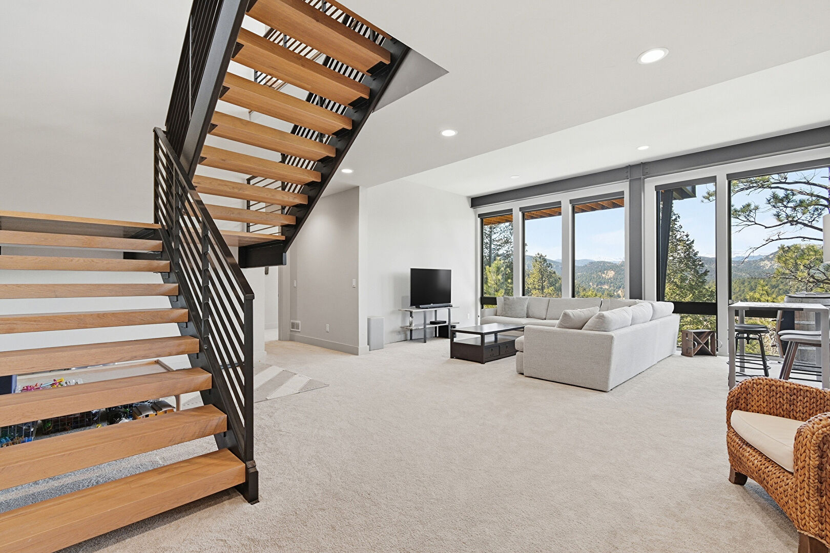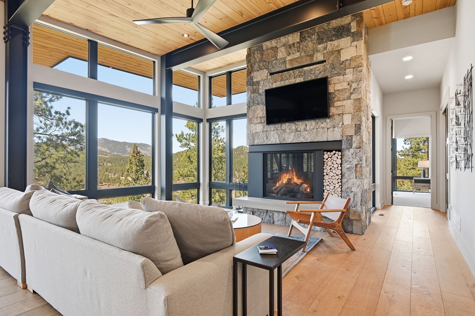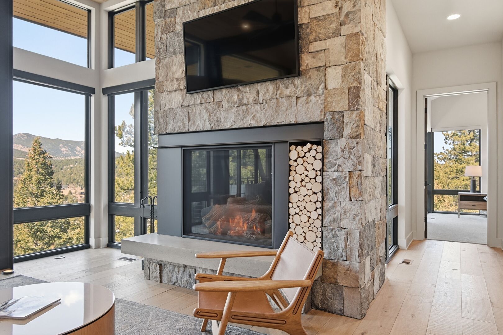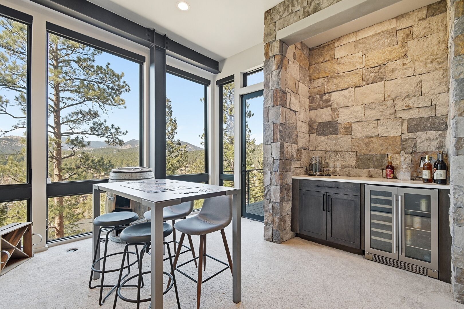 Baseboards Wall, Beamed Ceiling, Carpet, Ceiling Fan, Double Oven, Drywall, Fireplace, High Ceiling, Indoor Bar, L Shaped Kitchen, Mountain View, Natural Light, Notable Chandelier, Recessed Lighting, Stairs, Stone Wall, Wine Cooler, Wood Ceiling, Wood Finish Floor, Carpet, High Ceiling, Natural Light, Recessed Lighting