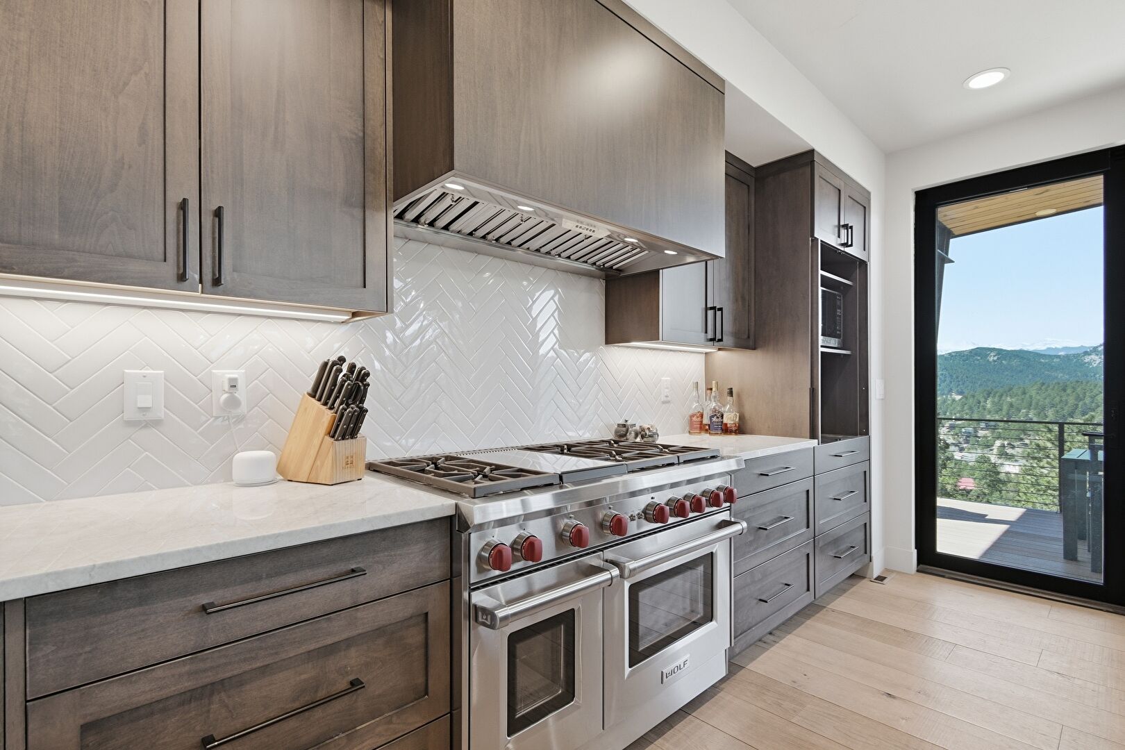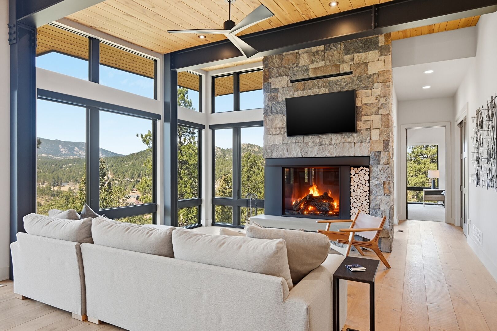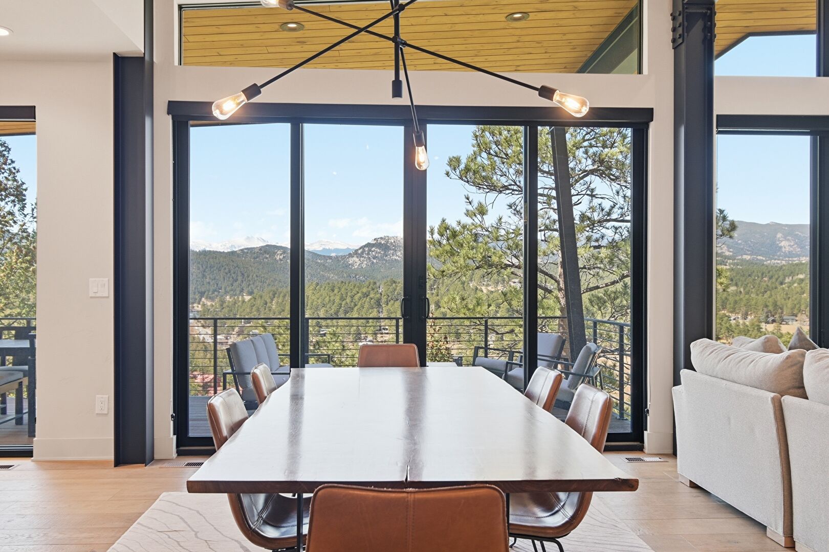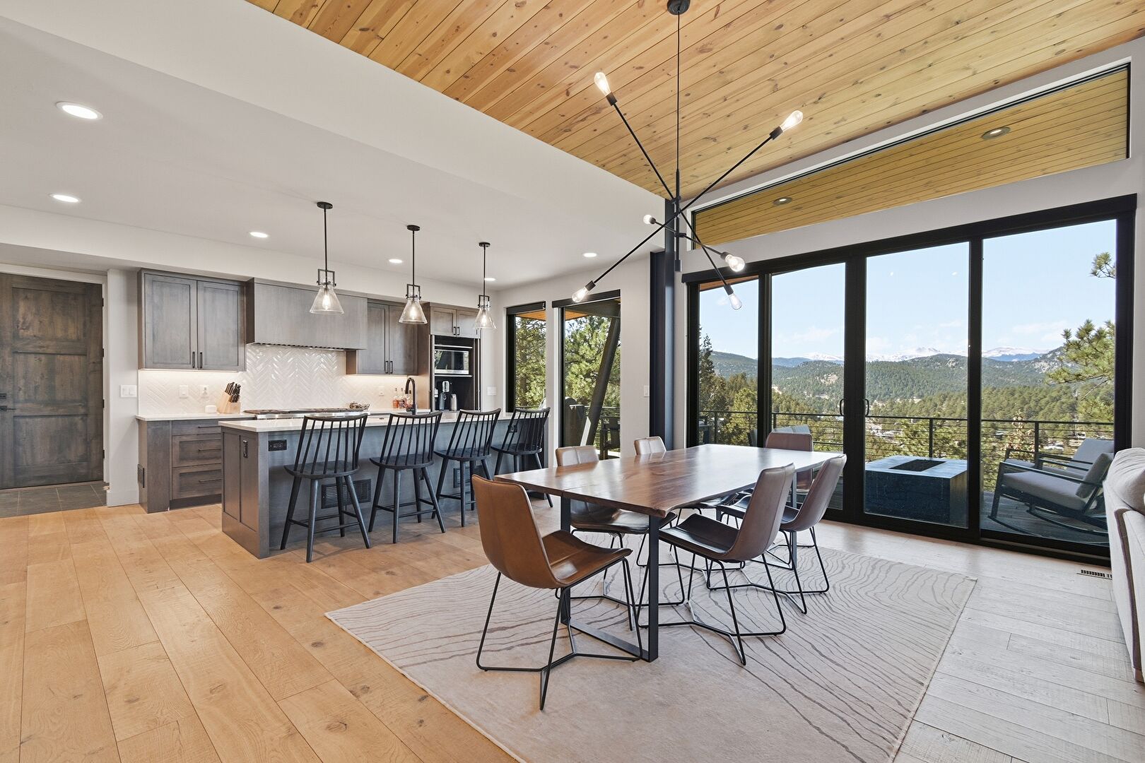 Baseboards Wall, Beamed Ceiling, Carpet, Ceiling Fan, Double Oven, Drywall, Fireplace, High Ceiling, Indoor Bar, L Shaped Kitchen, Mountain View, Natural Light, Notable Chandelier, Recessed Lighting, Stairs, Stone Wall, Wine Cooler, Wood Ceiling, Wood Finish Floor, Carpet, High Ceiling, Natural Light, Recessed Lighting