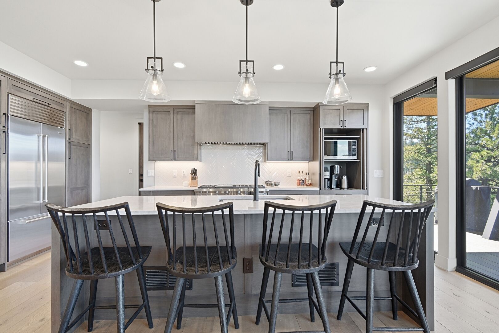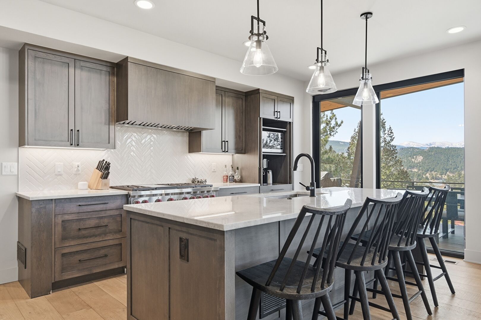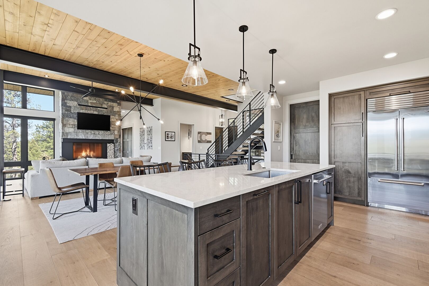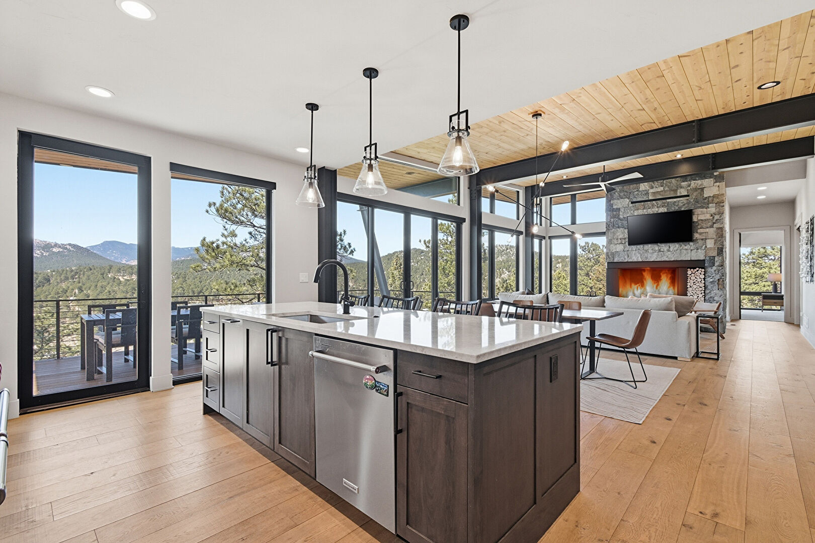 Beamed Ceiling, Dark Brown Cabinets, Drywall, Fireplace, Kitchen Bar, Kitchen Island, L Shaped Kitchen, Mountain View, Natural Light, Notable Chandelier, Opens To Living Area, Pendant Lighting, Recessed Lighting, Shaker Cabinets, Stone Countertops, Vent, Wood Ceiling, Wood Finish Floor, Gray Cabinets, Kitchen Bar, Mountain View, Natural Light, Wood Finish Floor