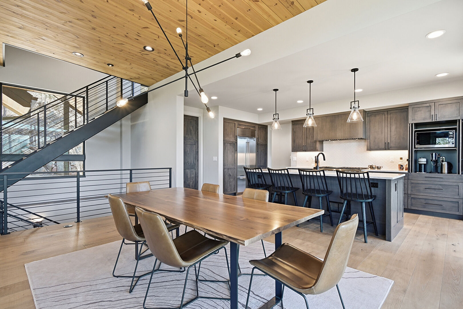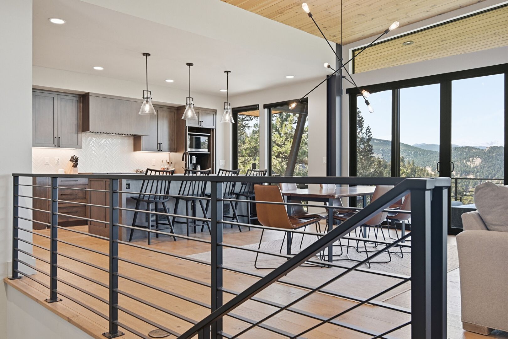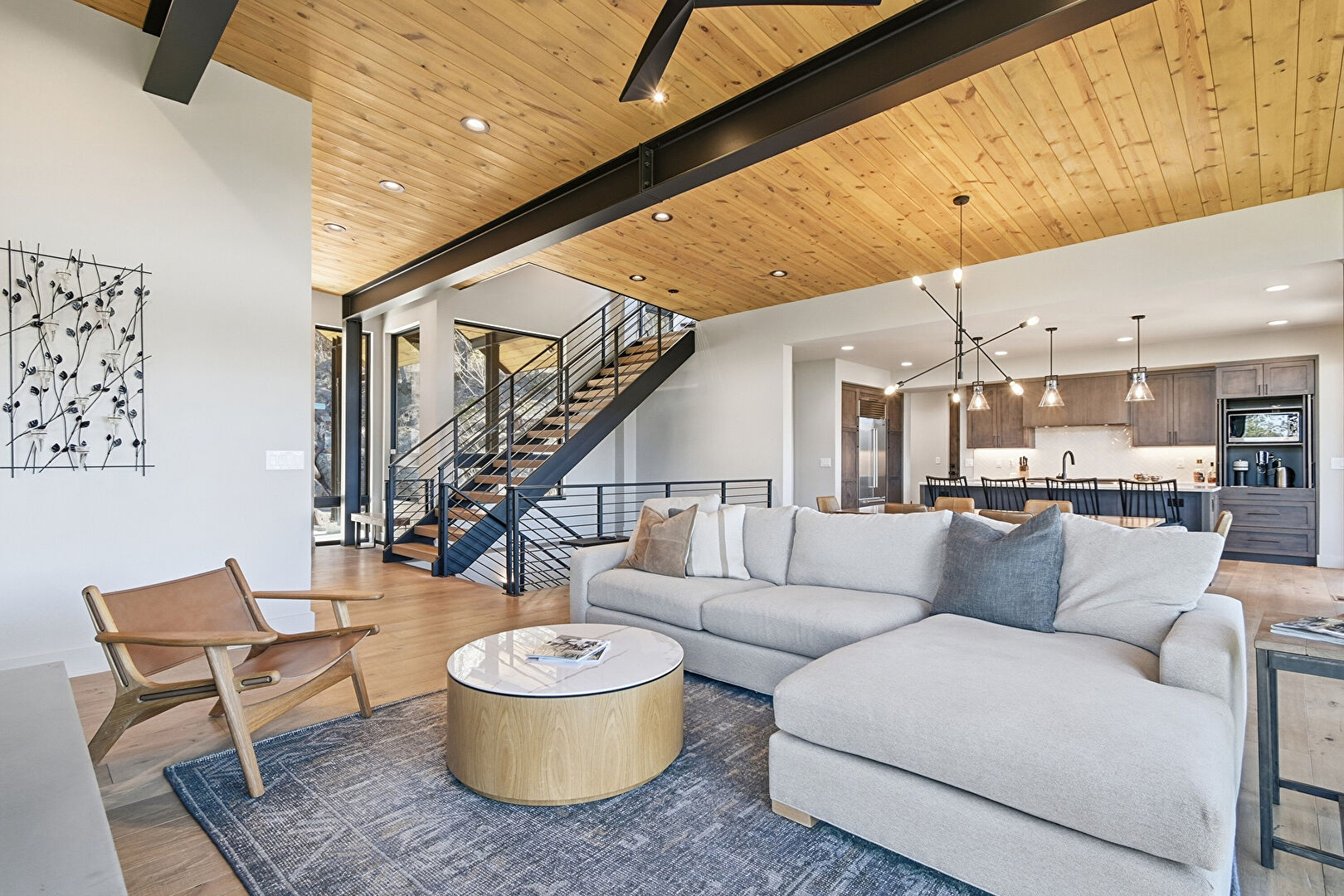 Baseboards Wall, Drywall, Forest View, L Shaped Kitchen, Mountain View, Natural Light, Recessed Lighting, Stairs, Vent, Wood Ceiling, Wood Finish Floor, Natural Light, Recessed Lighting, Wood Finish Floor