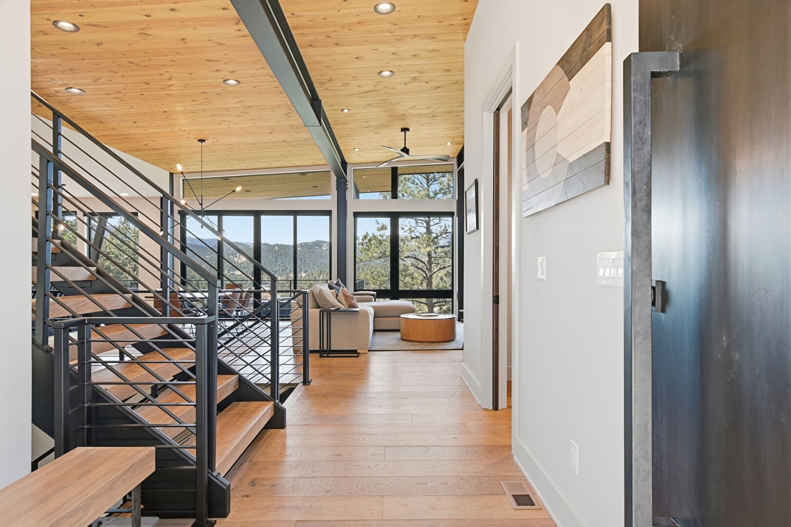Baseboards Wall, Beamed Ceiling, Drywall, Floor Ceiling Windows, Natural Light, Recessed Lighting, Stairs, Vaulted Ceiling, Vent, Wood Ceiling, Wood Finish Floor, High Ceiling