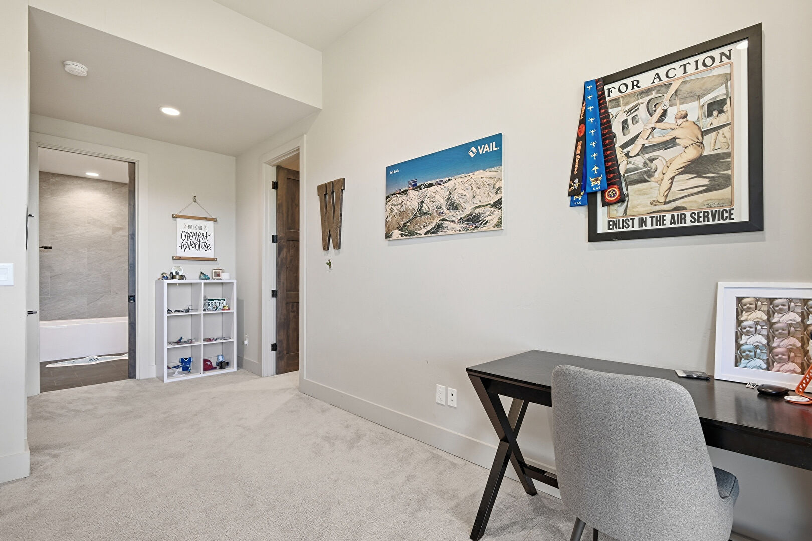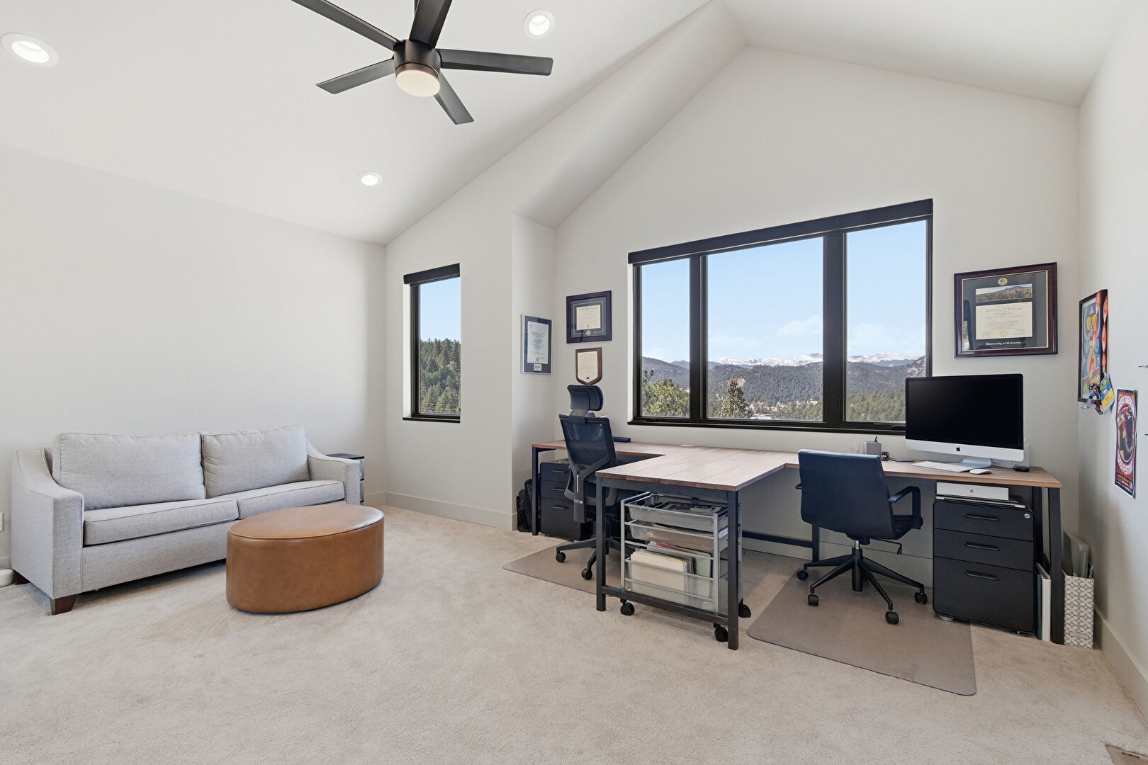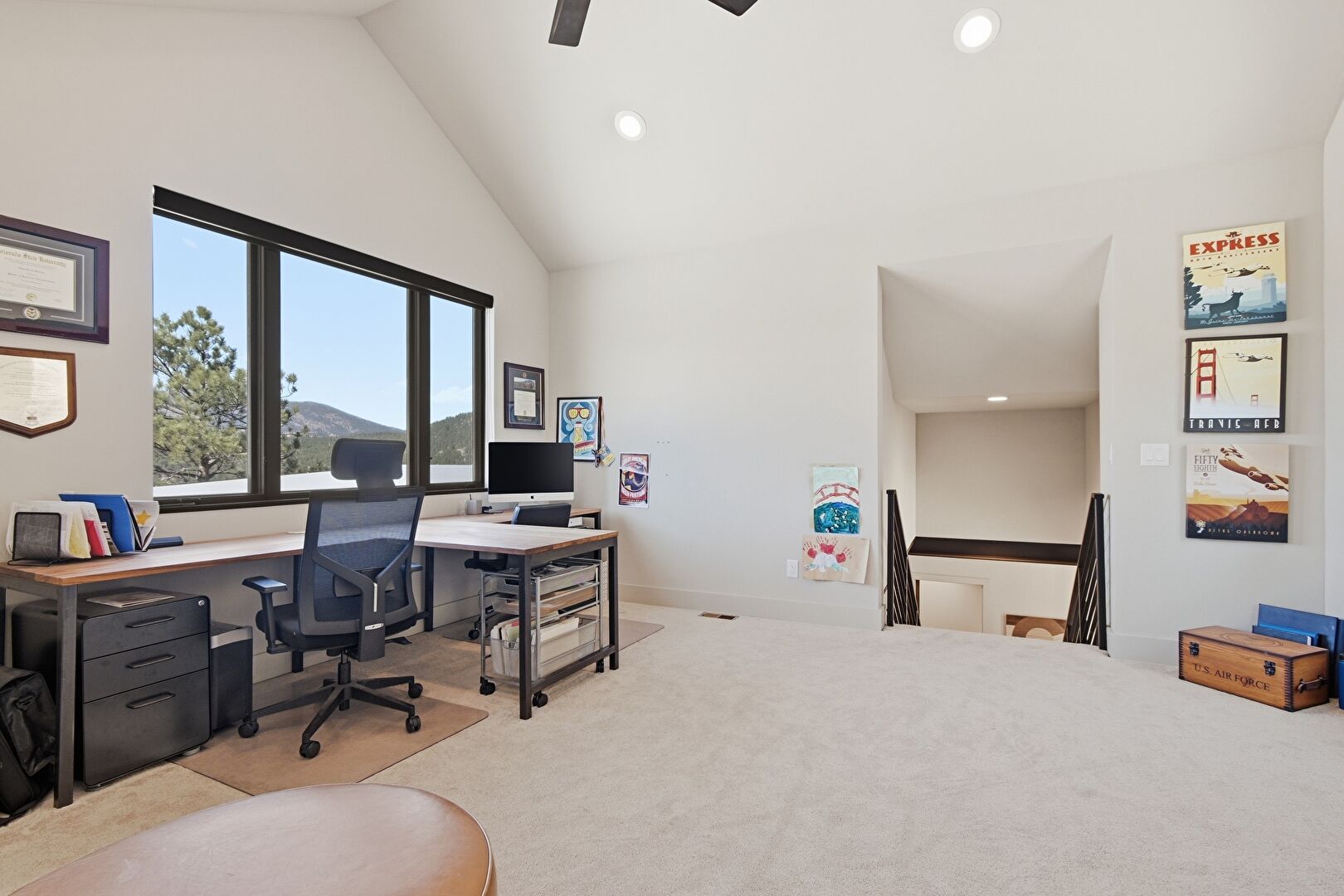Baseboards Wall, Bonus Room, Carpet, Cathedral Ceiling, Ceiling Fan, Drywall, High Ceiling, Natural Light, Office Area, Recessed Lighting, Smoke Carbon Monoxide Detector, Vaulted Ceiling, Baseboards Wall, Drywall, Vaulted Ceiling