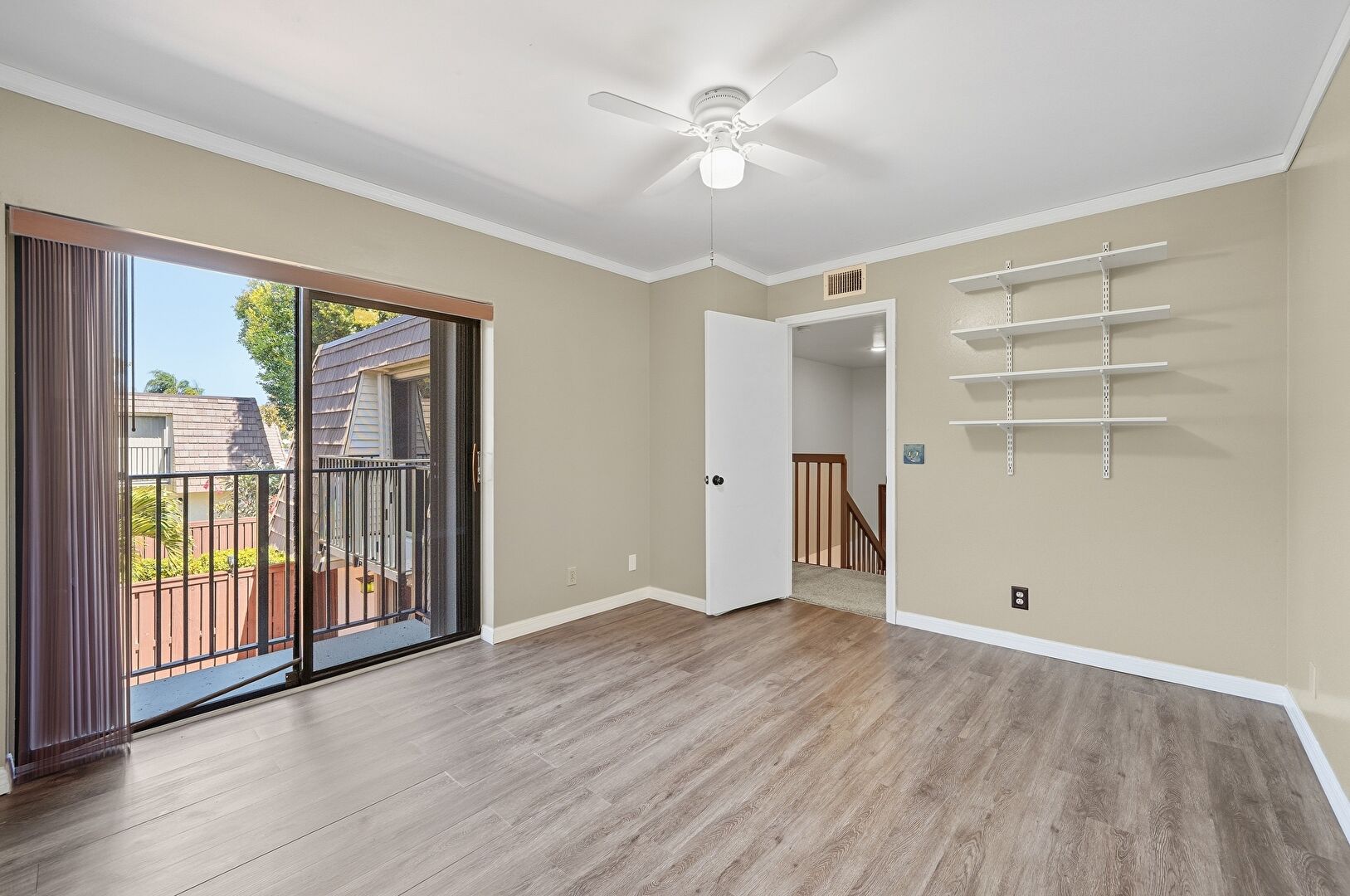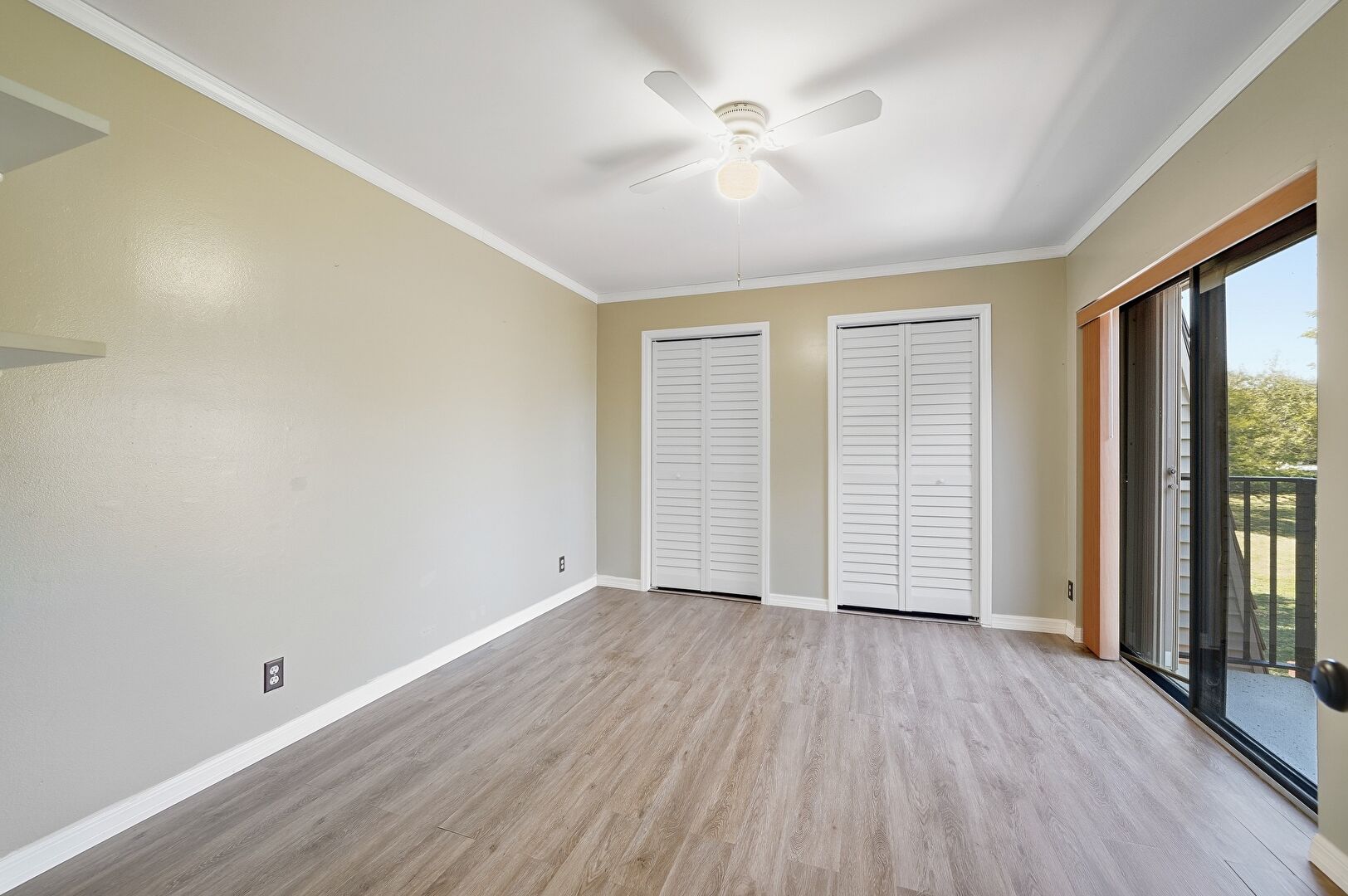 Access To Exterior, Baseboards Wall, Ceiling Fan, Crown Molding, Drywall, Natural Light, Two Closets, Wood Finish Floor, Vent, Wood Finish Floor