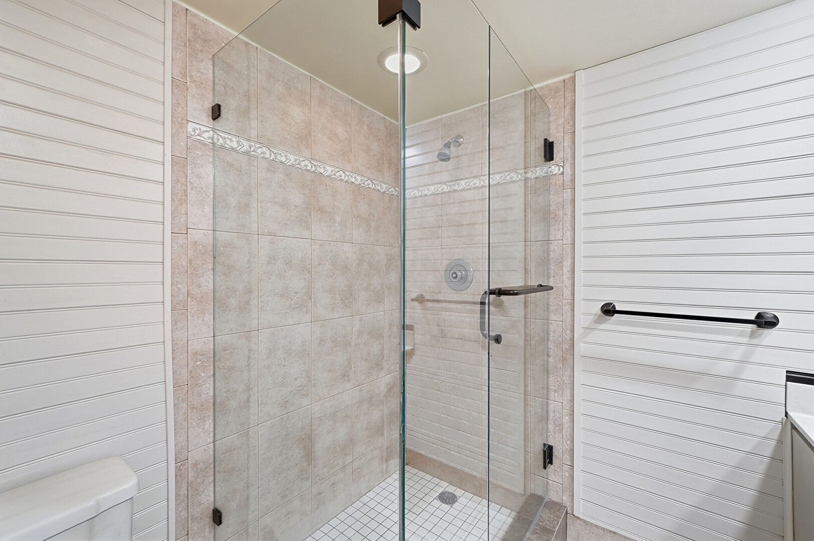 Full Bathroom, Recessed Lighting, Tile Floor, Wood Wall, Double Vanity, Vanity