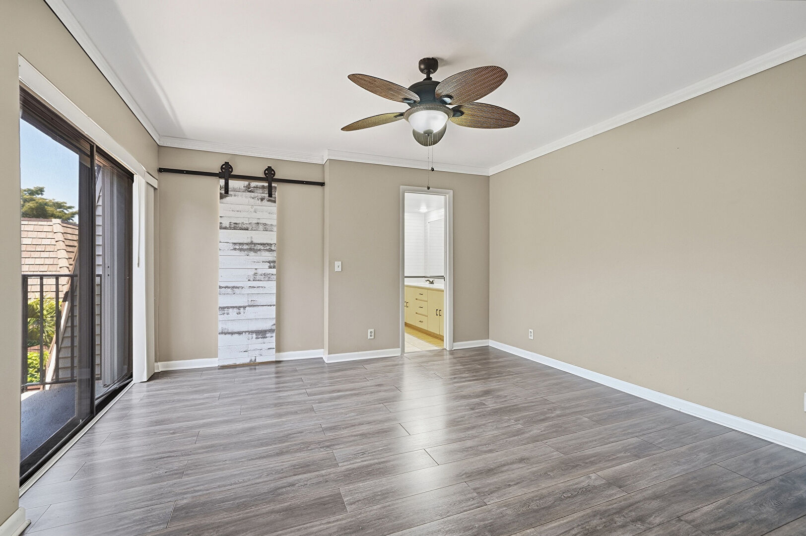 Barn Door, Baseboards Wall, Ceiling Fan, Crown Molding, Drywall, Ensuite Bathroom, Natural Light, Vent, Wood Finish Floor, Access To Exterior, Natural Light, Wood Finish Floor