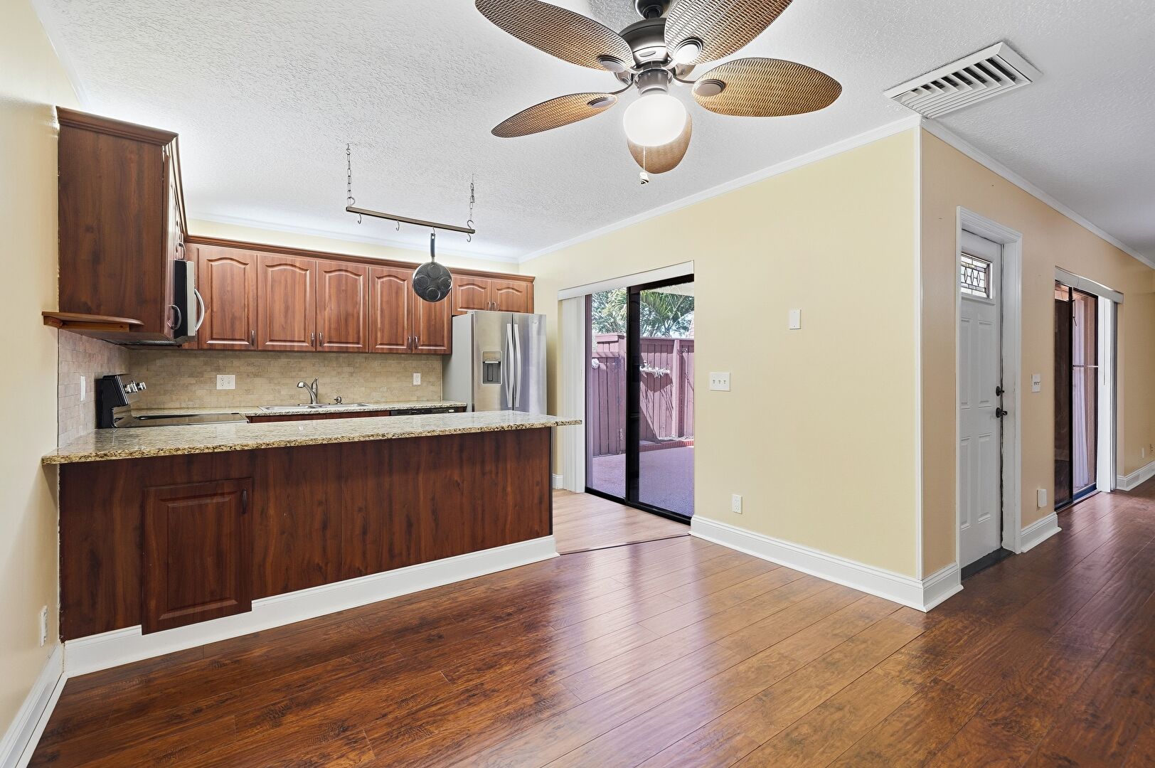 Arched Cabinets, Baseboards Wall, Ceiling Fan, Crown Molding, Crown Molding Cabinets, Dark Brown Cabinets, Drywall, Kitchen Bar, Kitchen Peninsula, Medium Brown Cabinets, Opens To Living Area, Raised Cabinets, Stairs, Stone Countertops, Textured Ceiling, Track Lighting, U Shaped Kitchen, Vent, Wood Finish Floor, Baseboards Wall, Crown Molding Cabinets, Natural Light