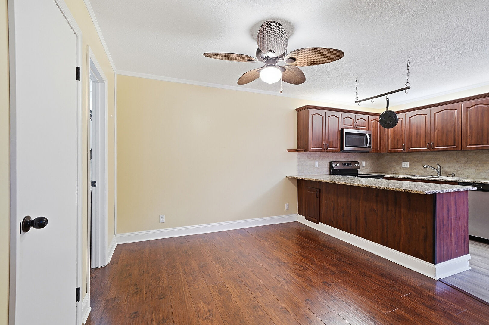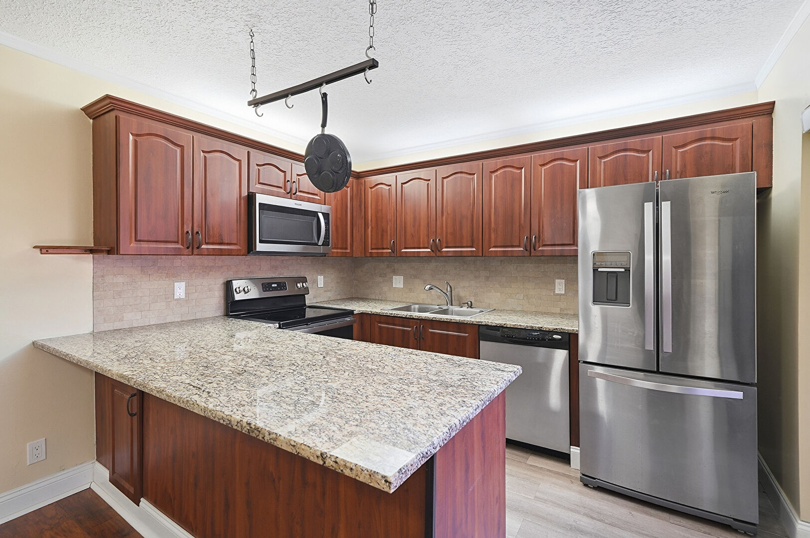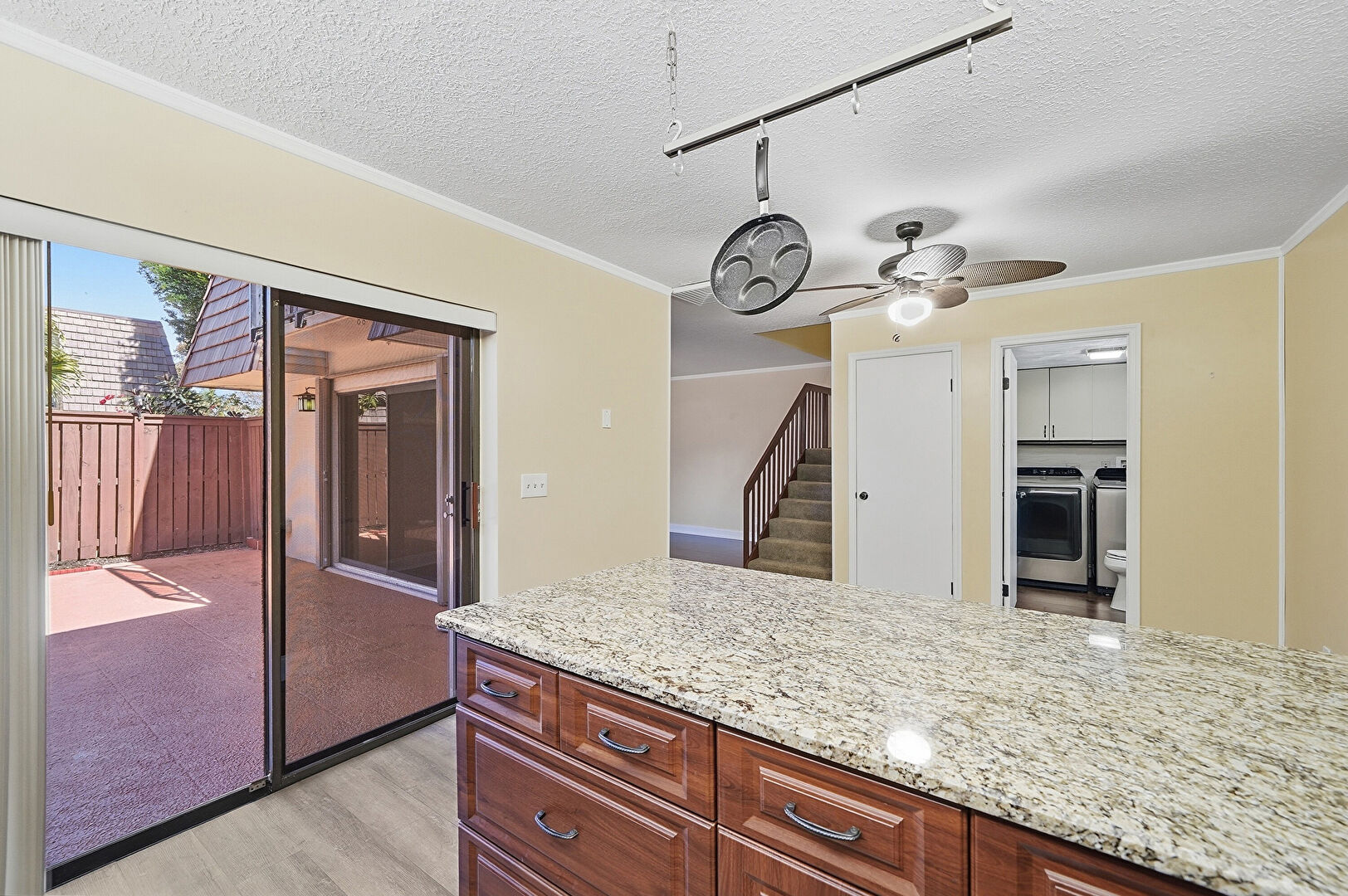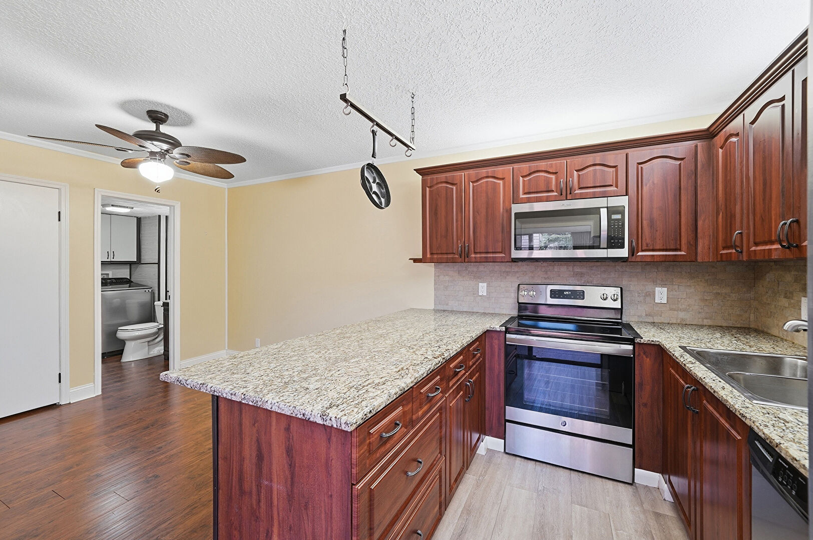Arched Cabinets, Baseboards Wall, Ceiling Fan, Crown Molding, Crown Molding Cabinets, Drywall, Kitchen Peninsula, Laundry, Medium Brown Cabinets, Natural Light, Raised Cabinets, Reddish Brown Cabinets, Stone Countertops, Textured Ceiling, Track Lighting, U Shaped Kitchen, Washer Dryer, Wood Finish Floor, Ceiling Fan, Raised Cabinets, Stone Countertops