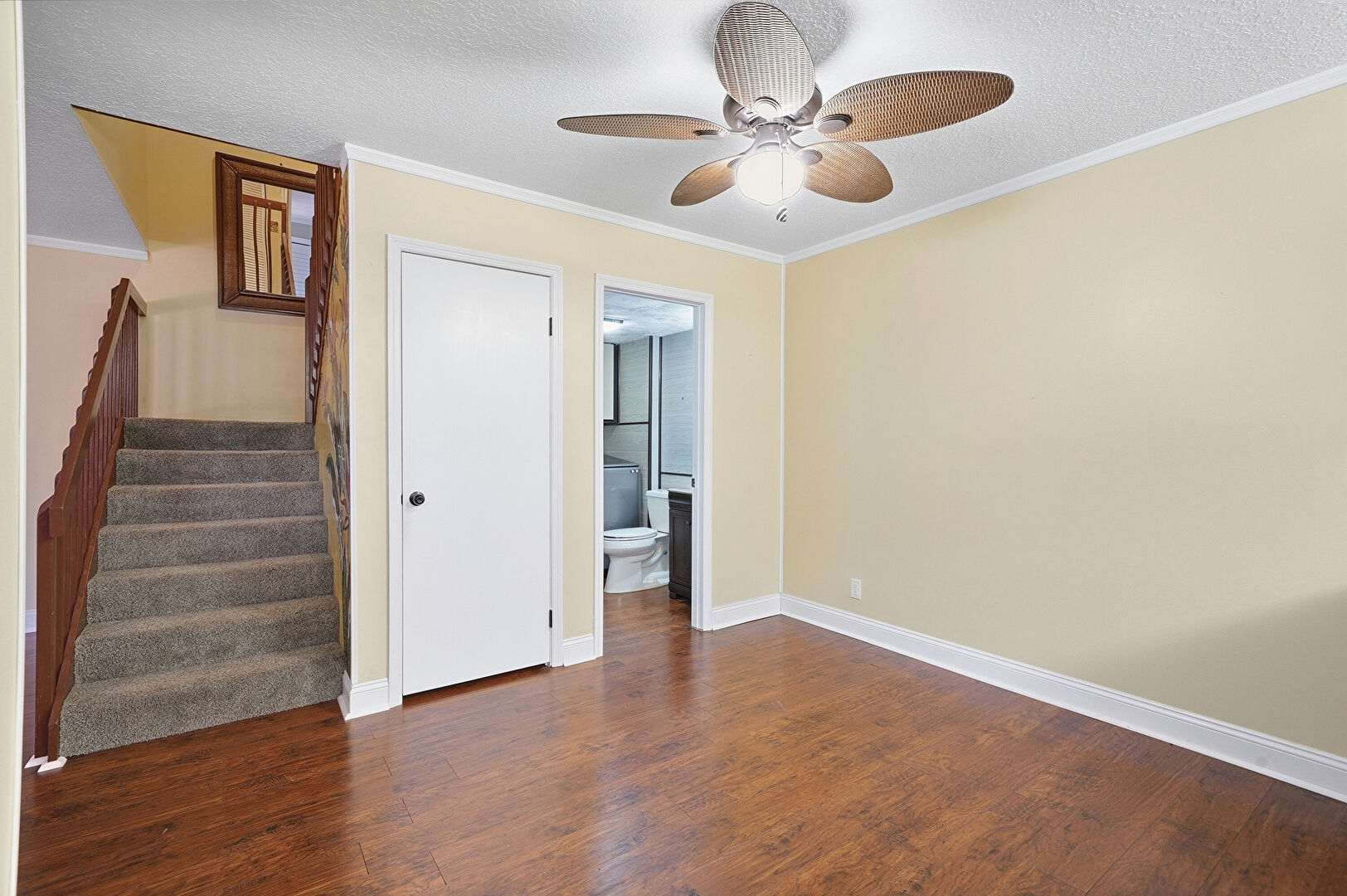 Baseboards Wall, Ceiling Fan, Crown Molding, Drywall, Natural Light, Stairs, Textured Ceiling, Vent, Wood Finish Floor, Ceiling Fan, Textured Ceiling, Vent, Wood Finish Floor