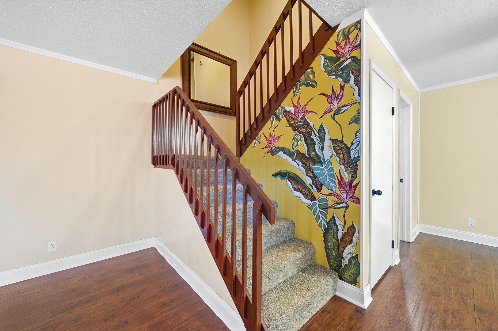 Baseboards Wall, Crown Molding, Stairs, Textured Ceiling, Wood Finish Floor, Drywall