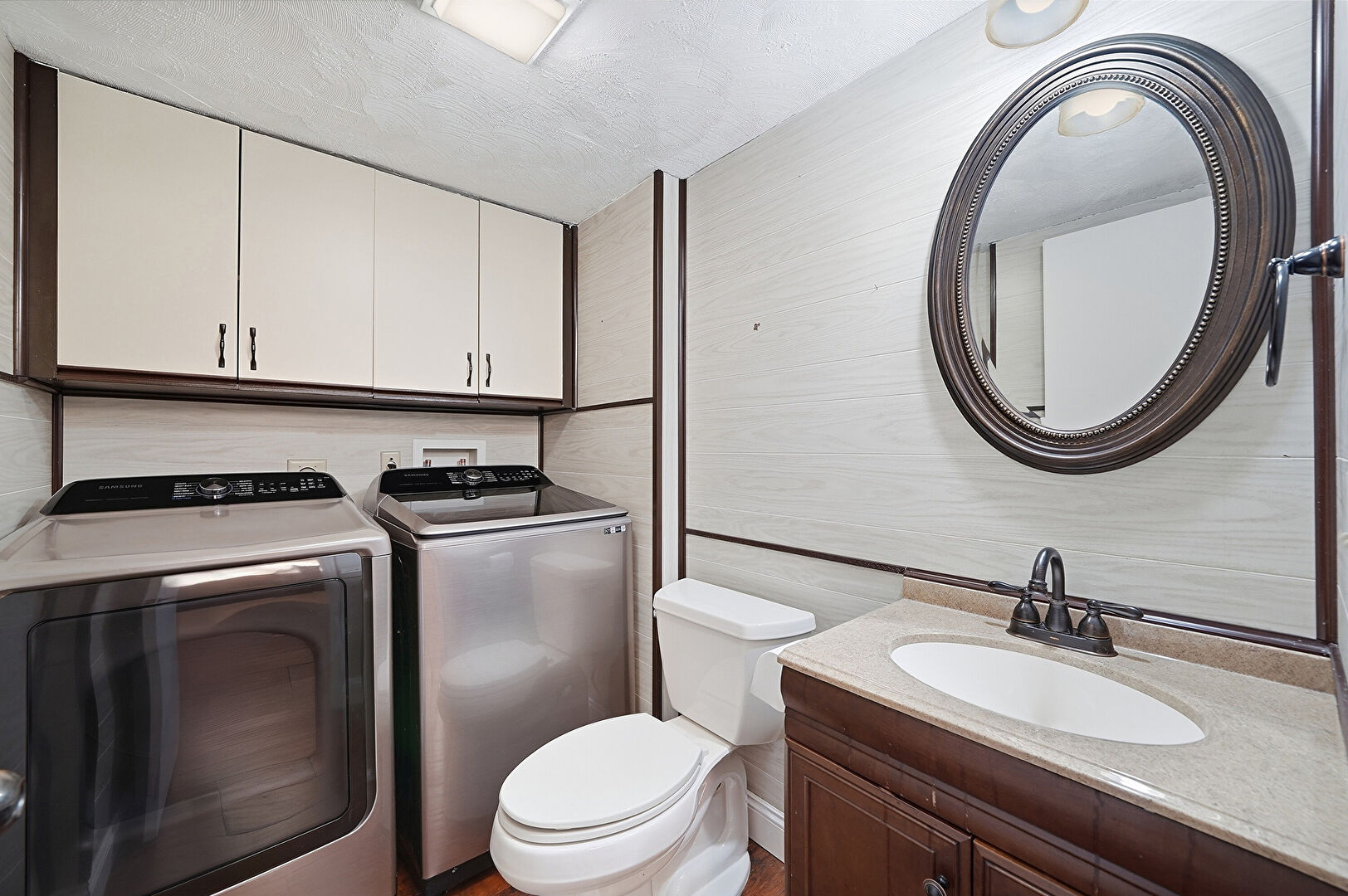 Half Bathroom, Laundry, Textured Ceiling, Tile Floor, Tile Wall, Vanity, Full Bathroom, Washer Hookup