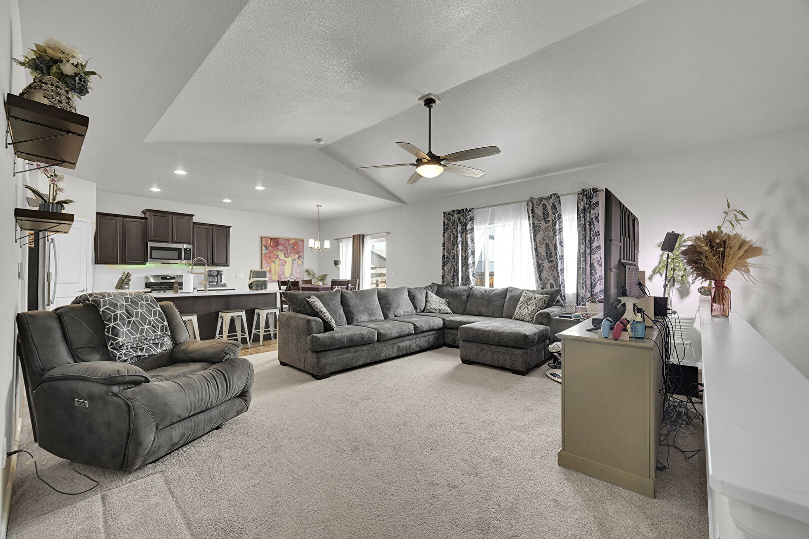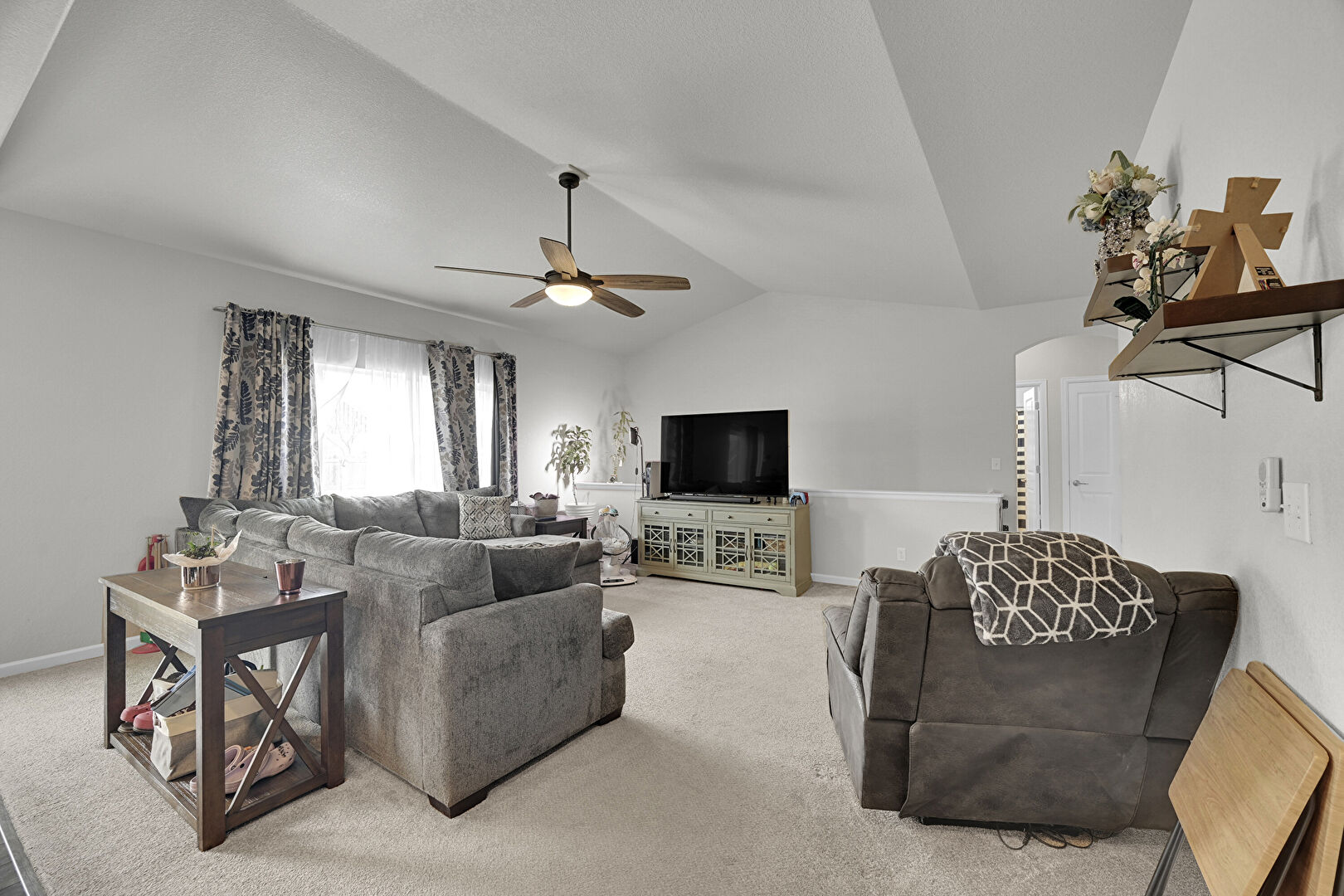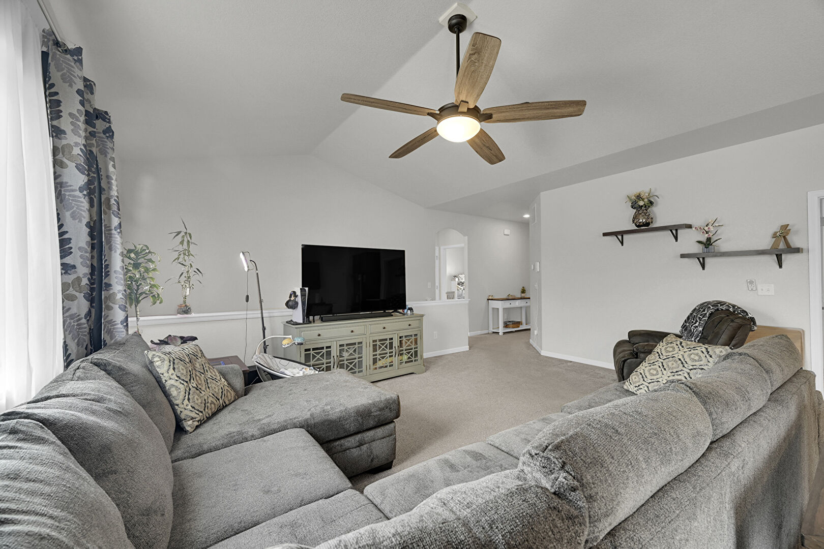 Arched Walkways, Baseboards Wall, Carpet, Cathedral Ceiling, Ceiling Fan, Drywall, Natural Light, Notable Chandelier, Recessed Lighting, Vaulted Ceiling, Arched Walkways, Natural Light, Textured Ceiling