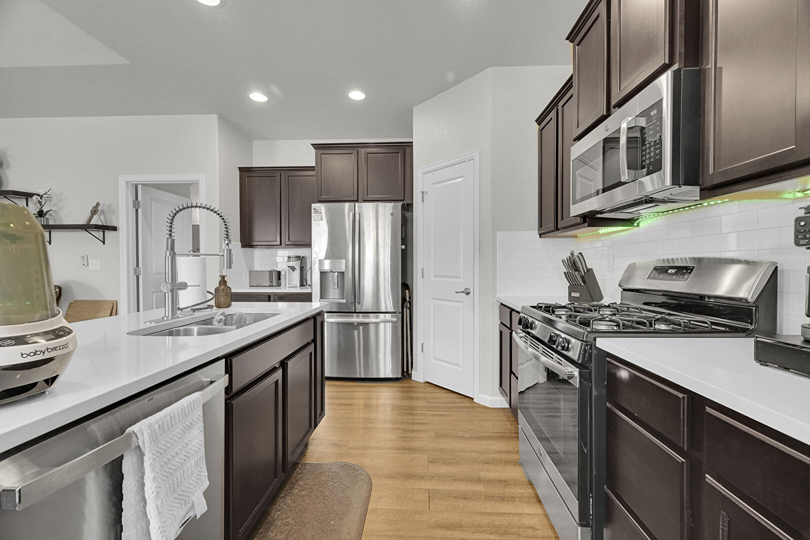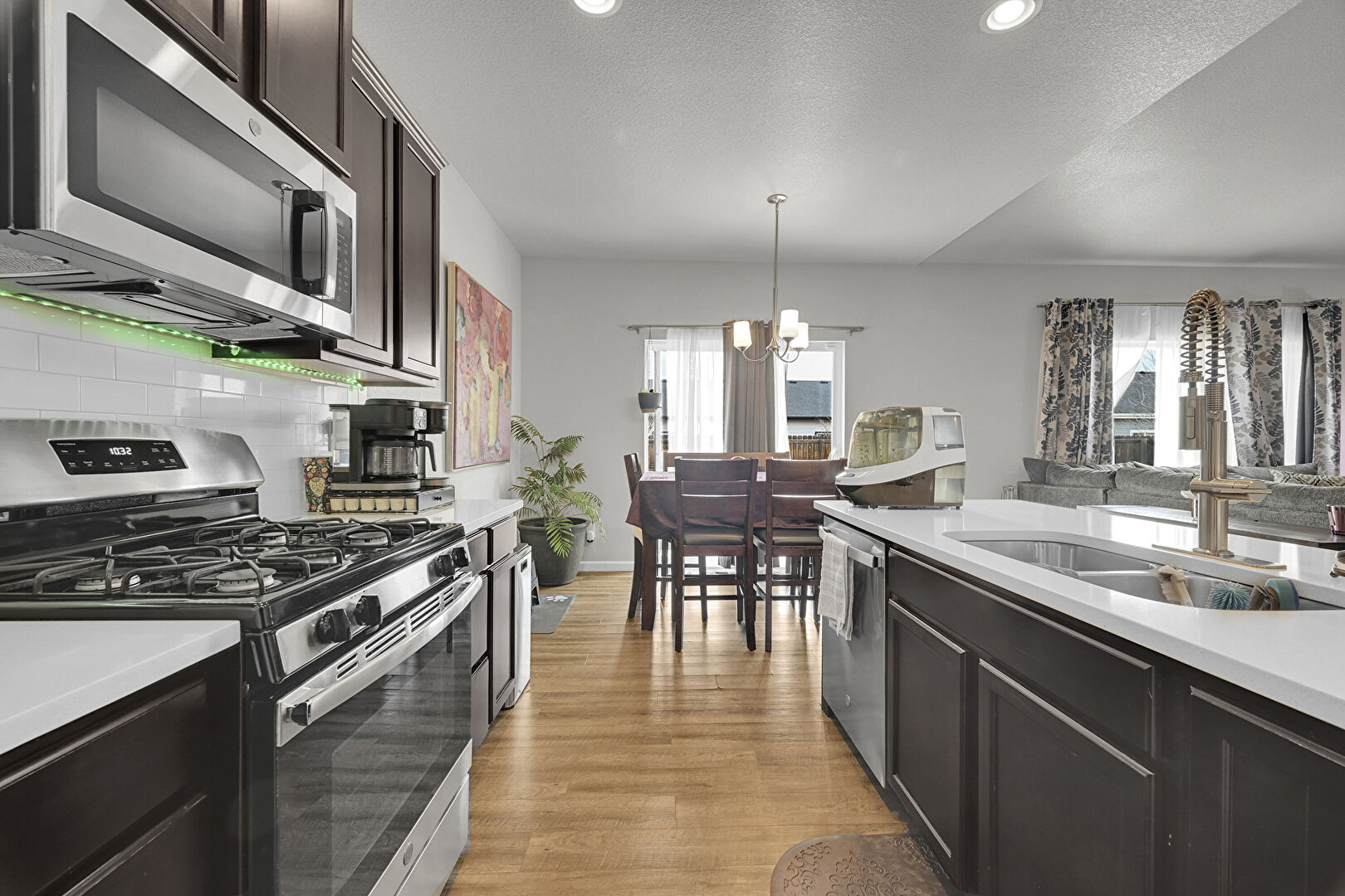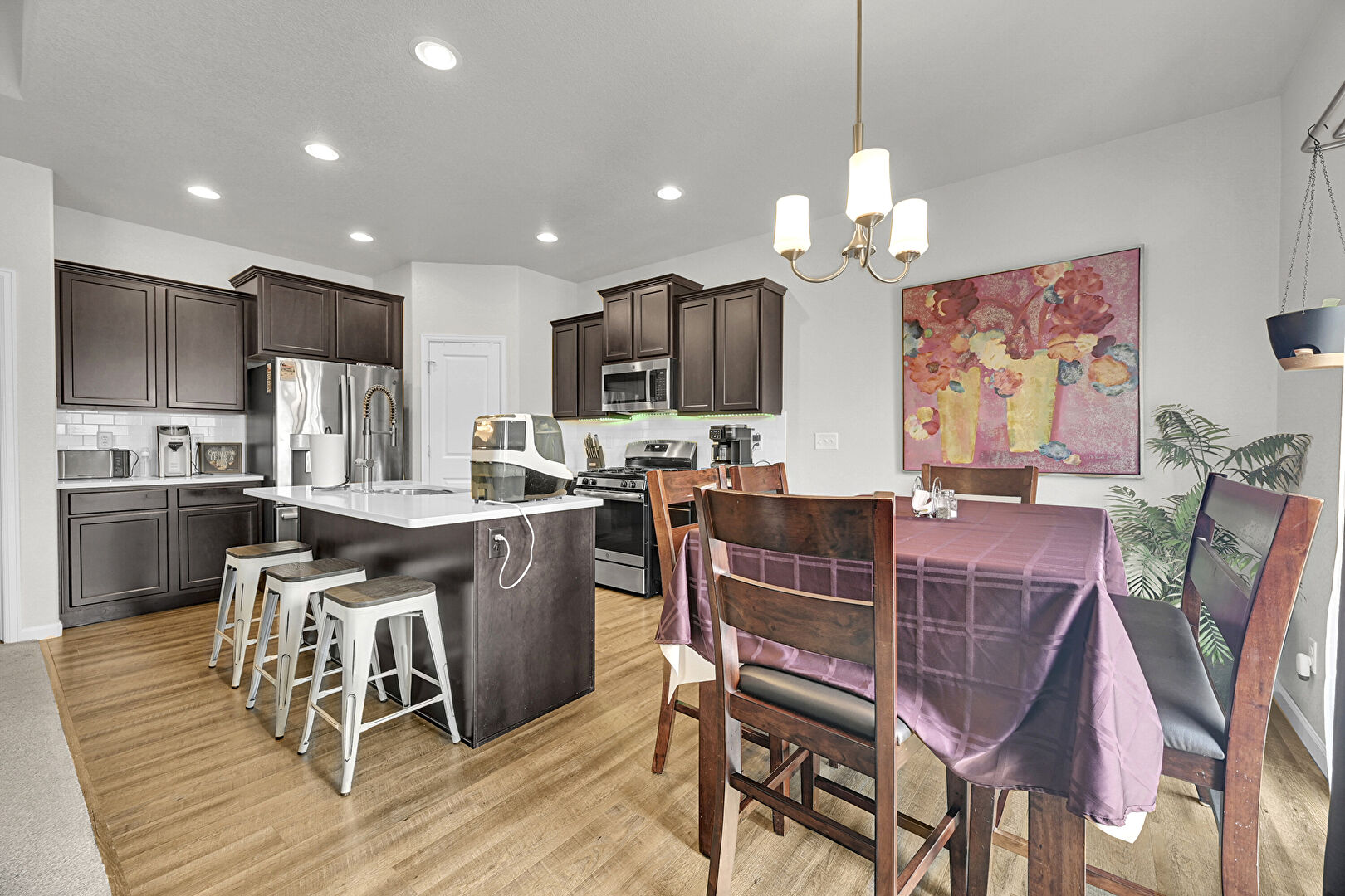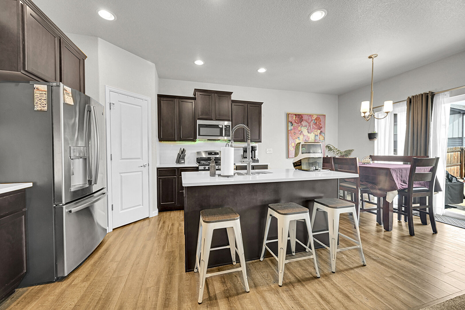 Baseboards Wall, Black Cabinets, Crown Molding Cabinets, Dark Brown Cabinets, Drywall, Kitchen Bar, Kitchen Island, L Shaped Kitchen, Natural Light, Notable Chandelier, Pendant Lighting, Recessed Lighting, Shaker Cabinets, Stone Countertops, Textured Ceiling, Wood Finish Floor, Kitchen Bar, Opens To Living Area, Recessed Lighting, Wood Finish Floor