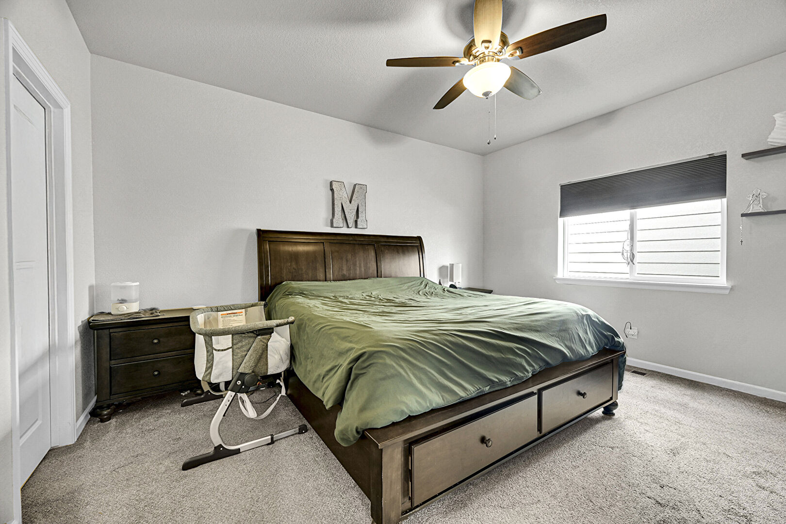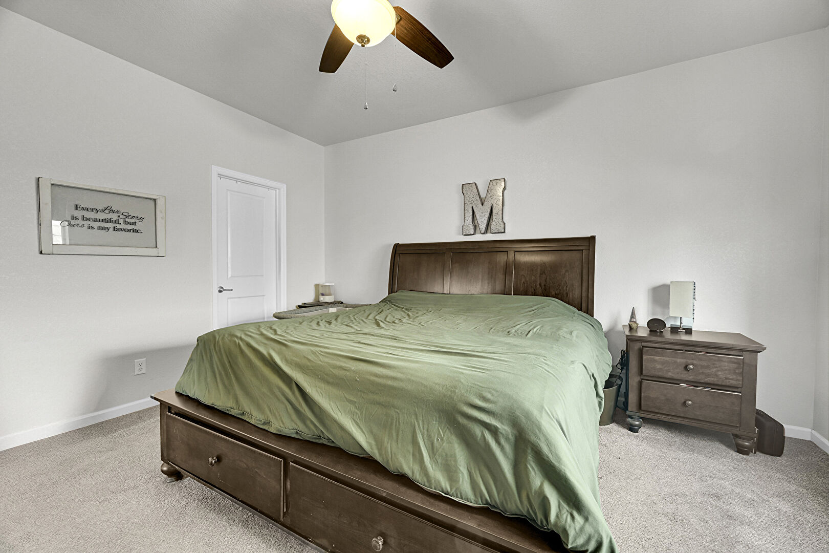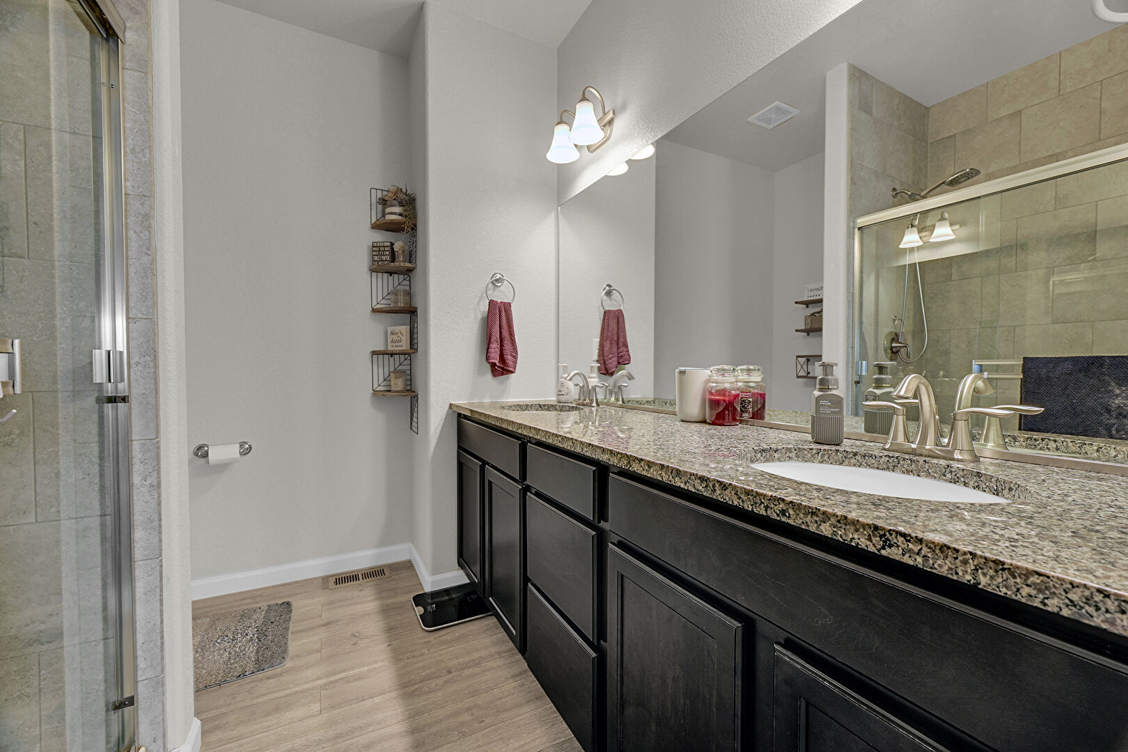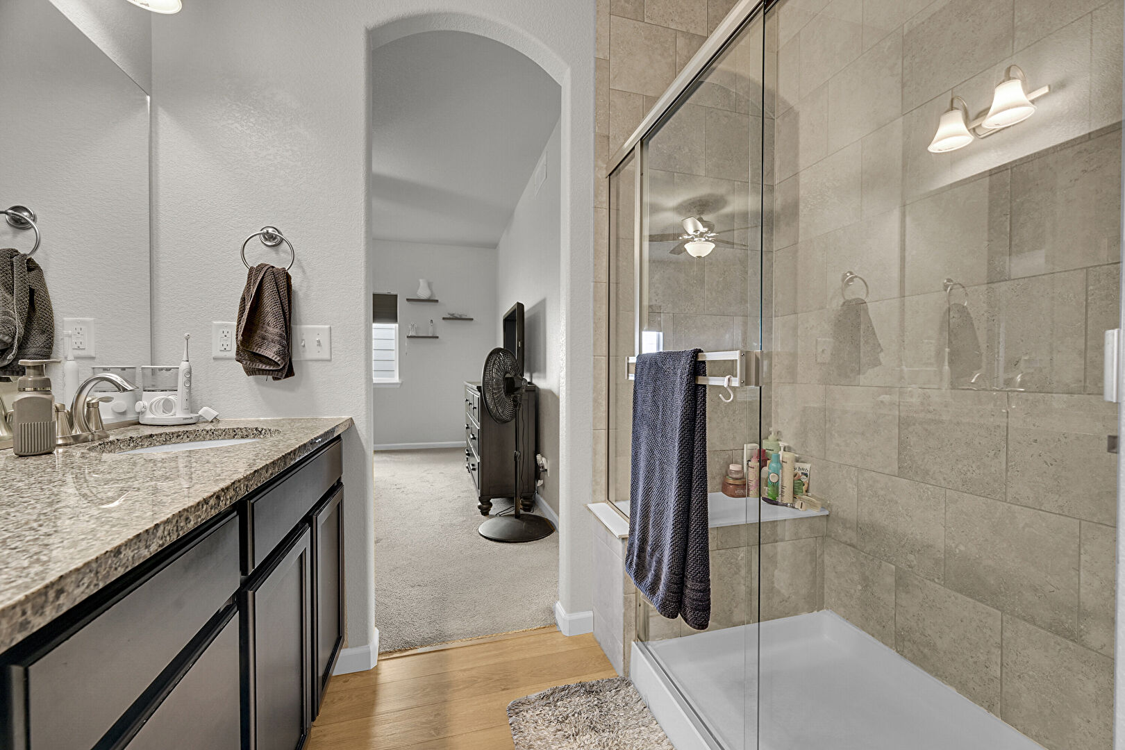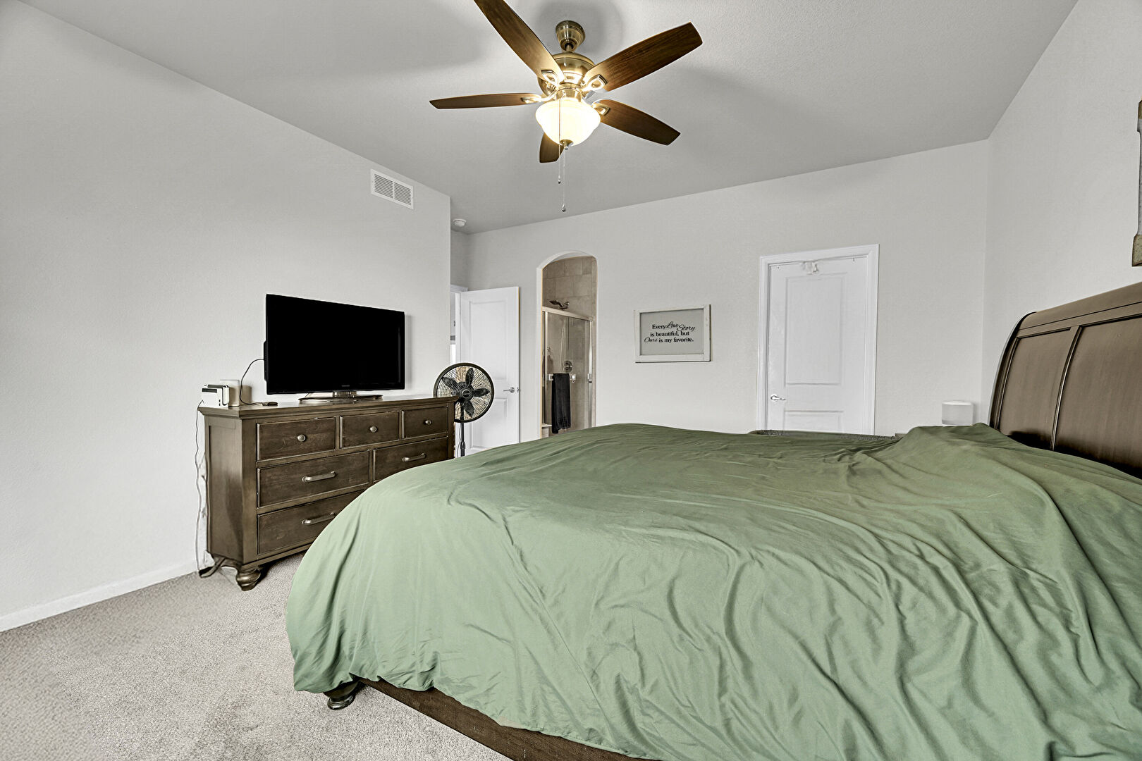 Baseboards Wall, Carpet, Ceiling Fan, Double Vanity, Drywall, Full Bathroom, Natural Light, Vanity, Wood Finish Floor, Ensuite Bathroom, Vent