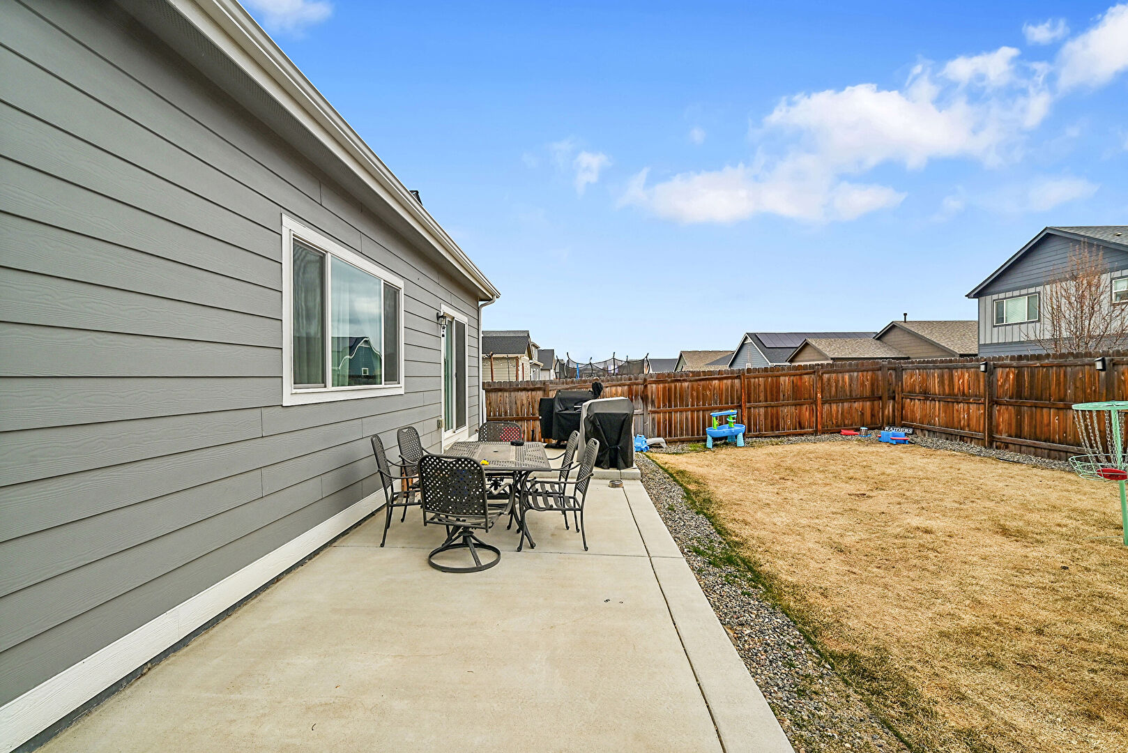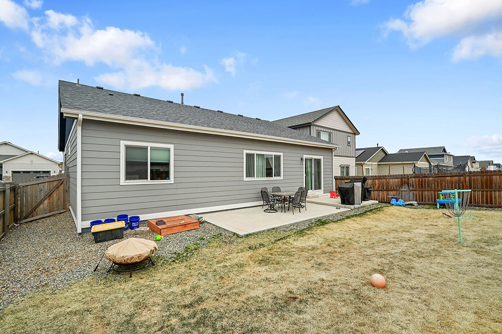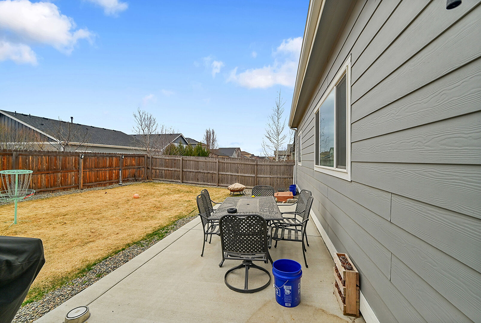 Concrete Foundation, Downspout, Fence, Gate, Grill, Gutters, Horizontal Siding, Lawn, Outdoor Dining Area, Patio, Shingle Roof, Downspout, Grill, Lawn