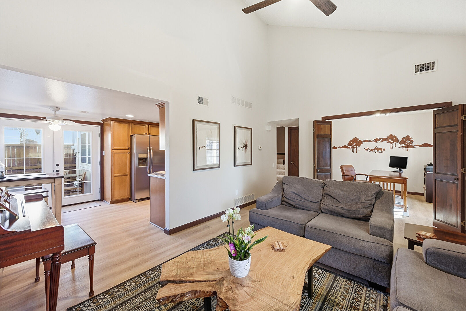 Baseboards Wall, Ceiling Fan, Drywall, Fireplace, French Doors, High Ceiling, Natural Light, Office Area, Recessed Lighting, Vaulted Ceiling, Vent, Wood Finish Floor, Drywall, Wood Finish Floor