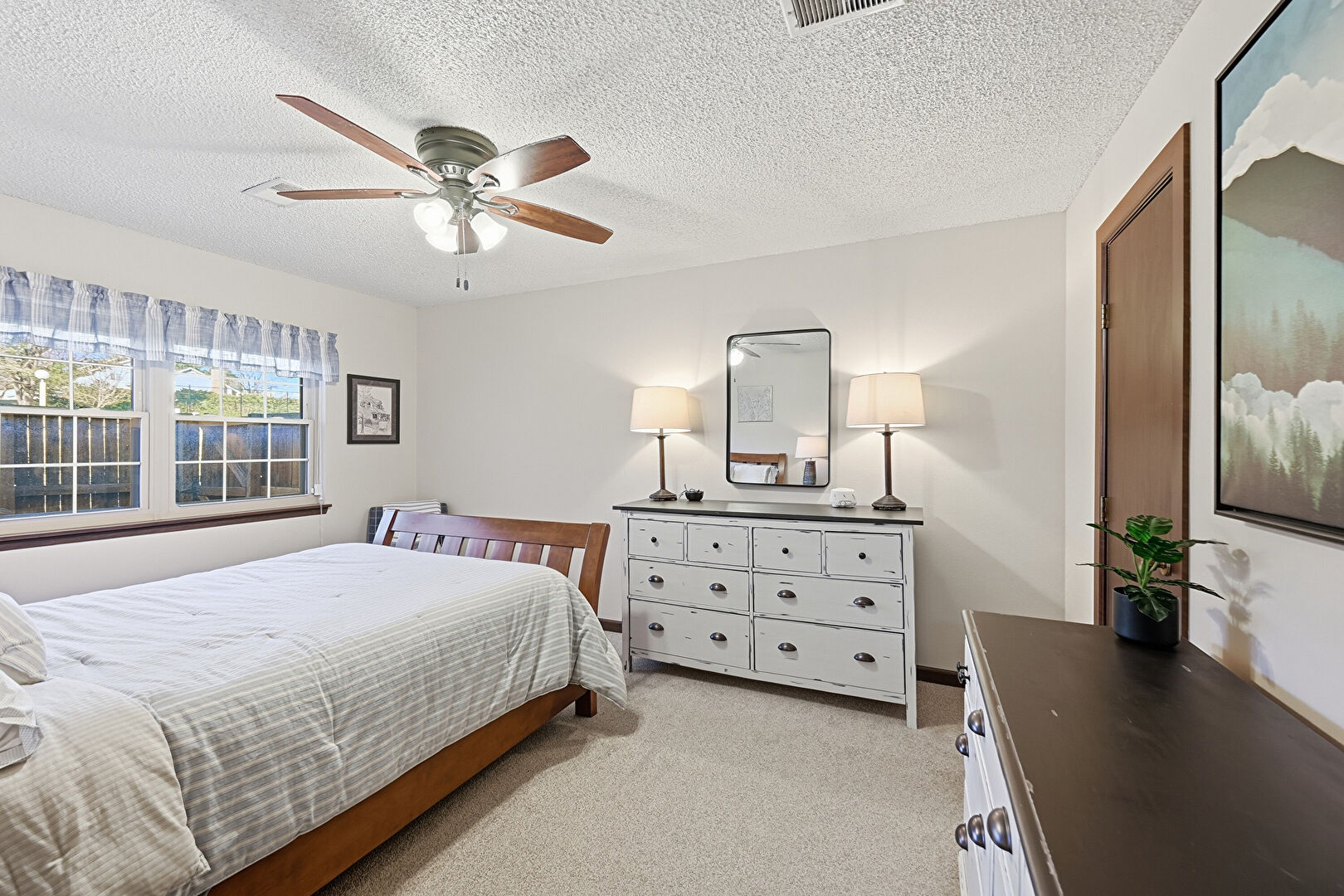 Carpet, Drywall, Natural Light, Textured Ceiling, Vent, Ceiling Fan