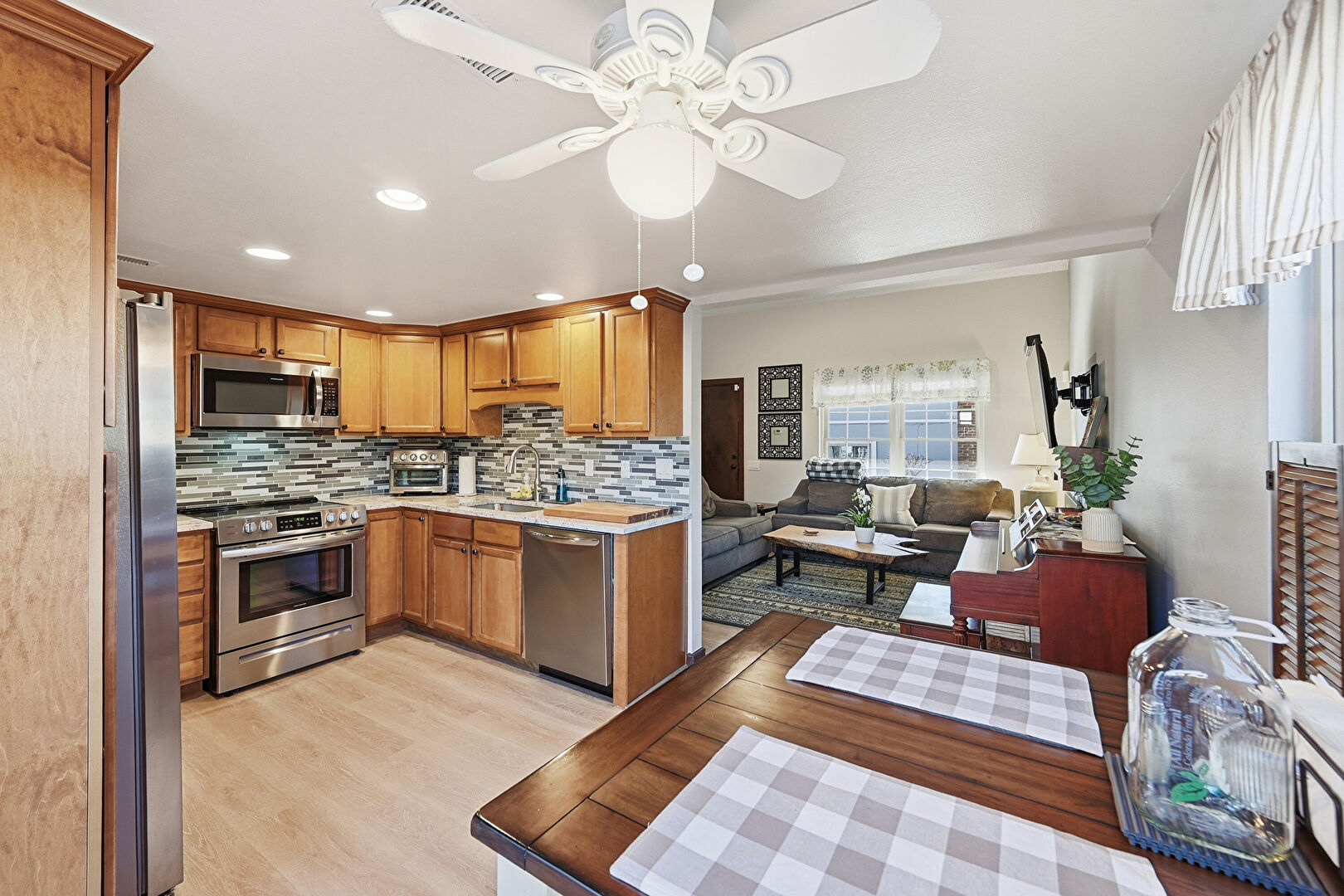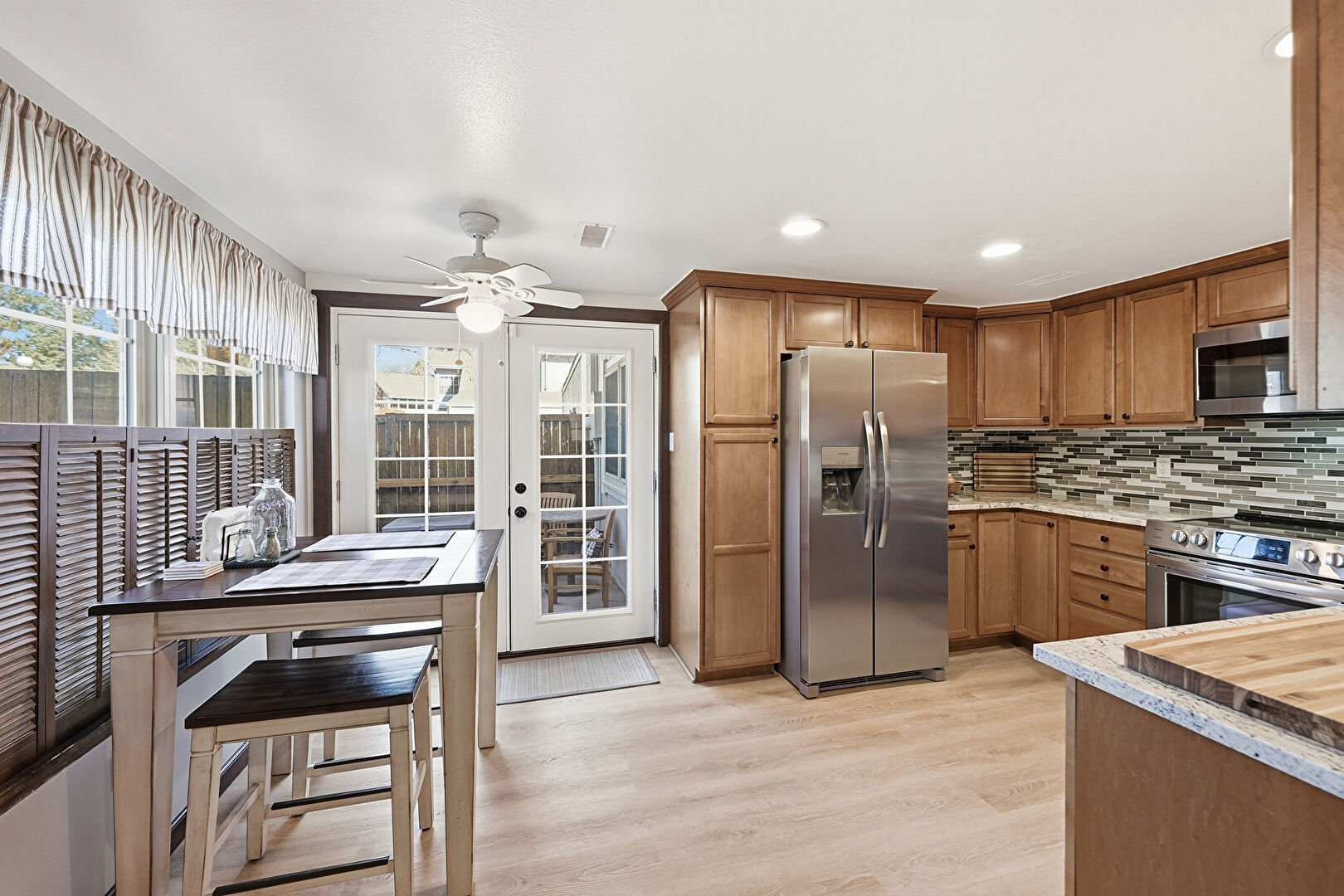 Baseboards Wall, Butcher Block Countertops, Ceiling Fan, Crown Molding Cabinets, Drywall, French Doors, Medium Brown Cabinets, Natural Light, Recessed Lighting, Shaker Cabinets, Stone Countertops, Toaster, Vent, Wood Finish Floor, Medium Brown Cabinets, Opens To Living Area, U Shaped Kitchen, Vent