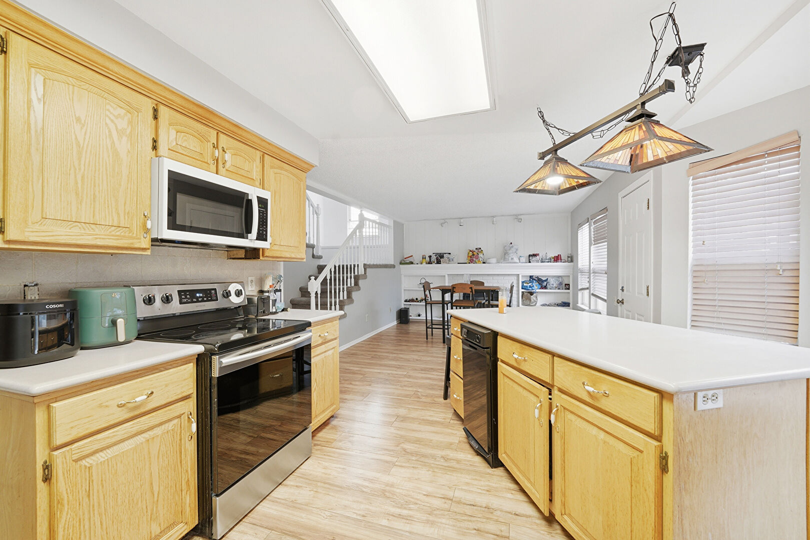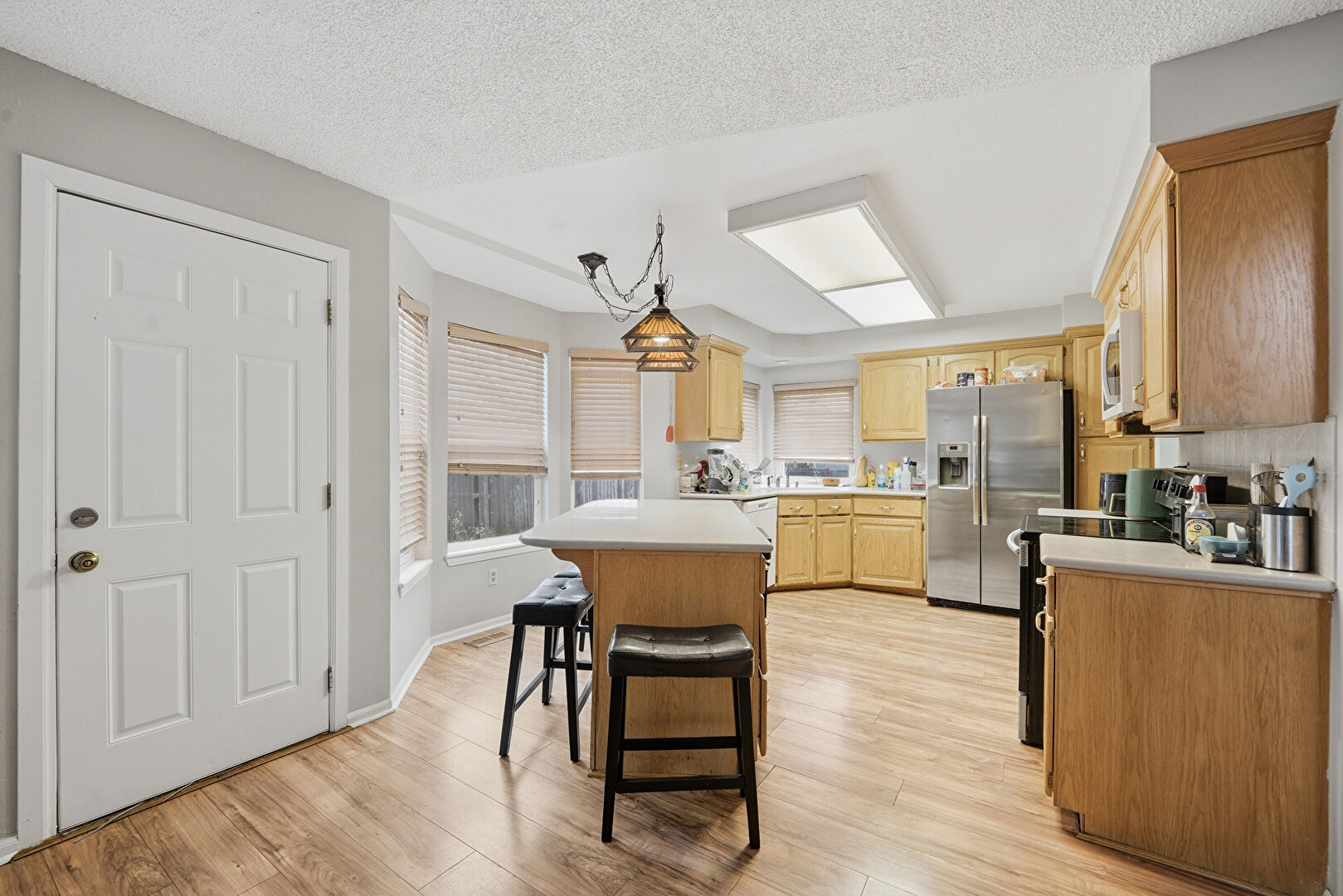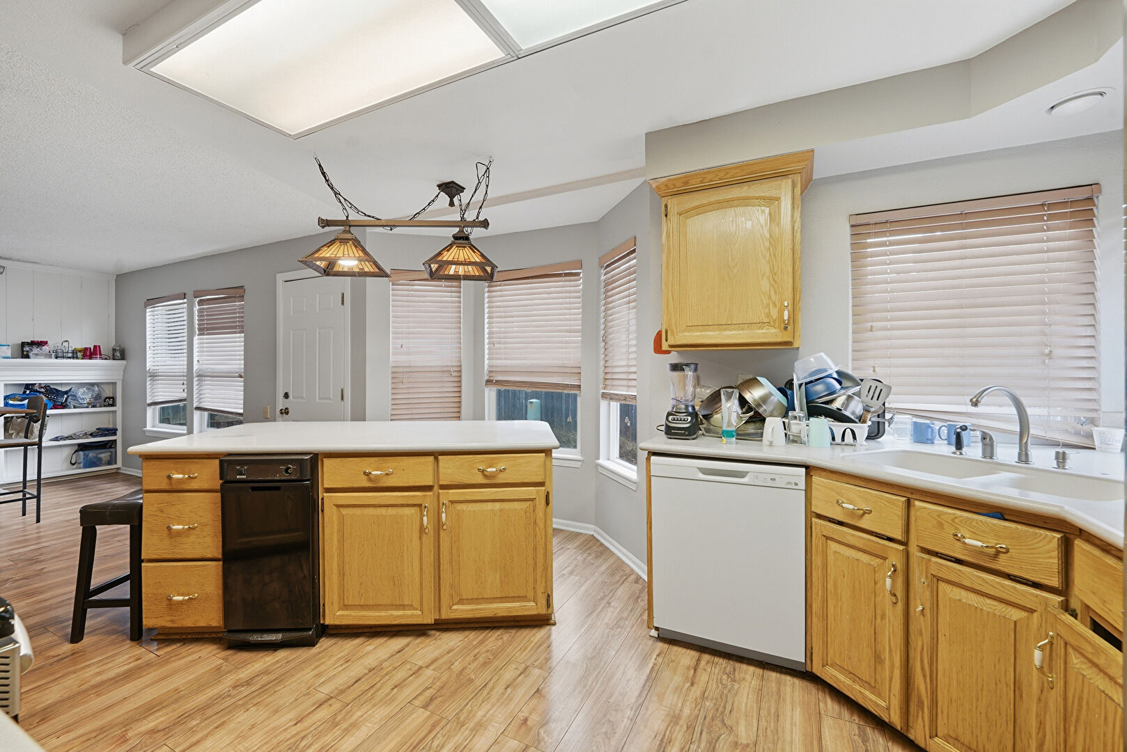 Arched Cabinets, Baseboards Wall, Crown Molding Cabinets, Drywall, Kitchen Bar, Kitchen Island, Medium Brown Cabinets, Natural Light, Pendant Lighting, Raised Cabinets, Trash Compactor, U Shaped Kitchen, Vent, Visible Hinge Cabinets, Wood Finish Floor, Baseboards Wall, Textured Ceiling, Trash Compactor, Visible Hinge Cabinets