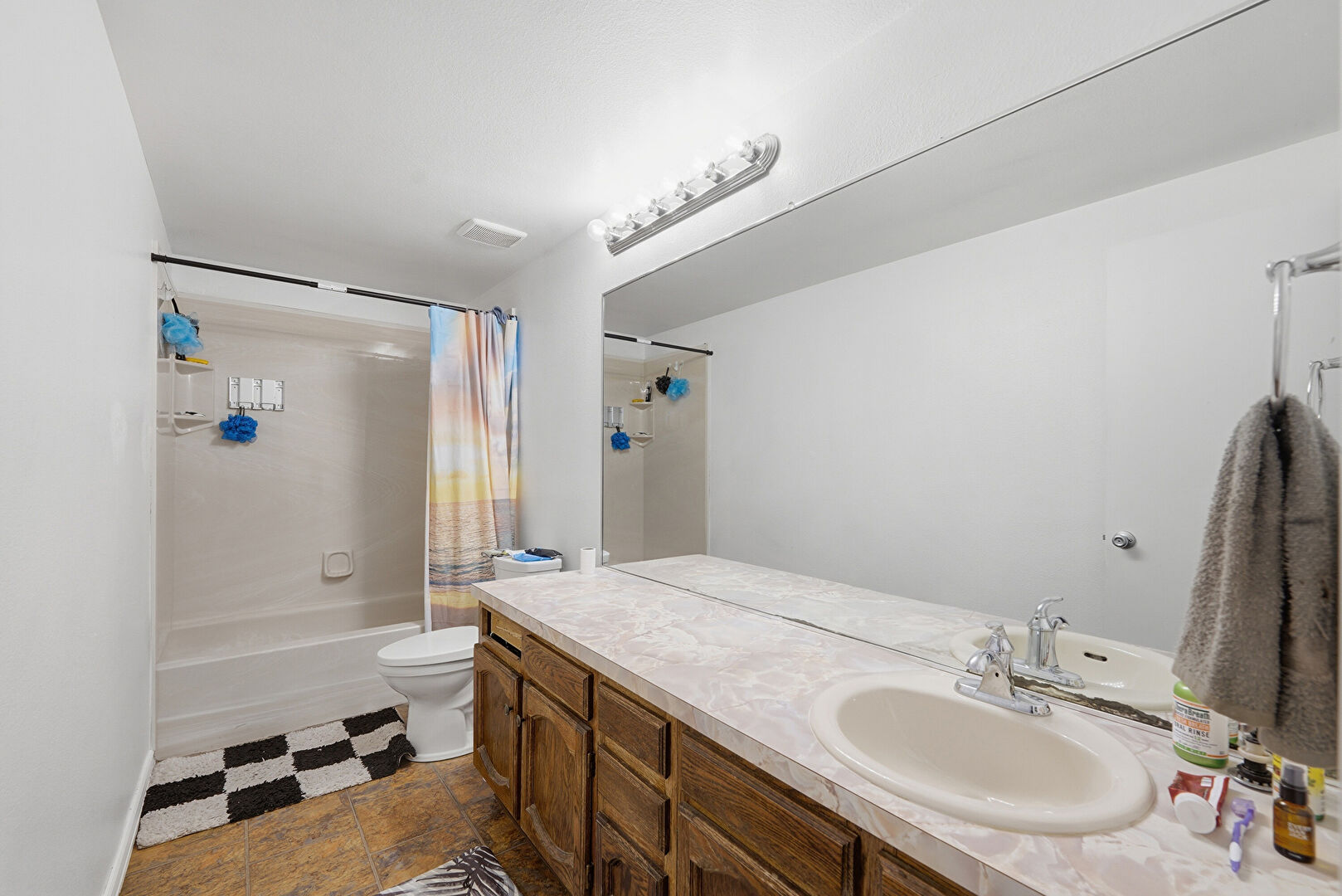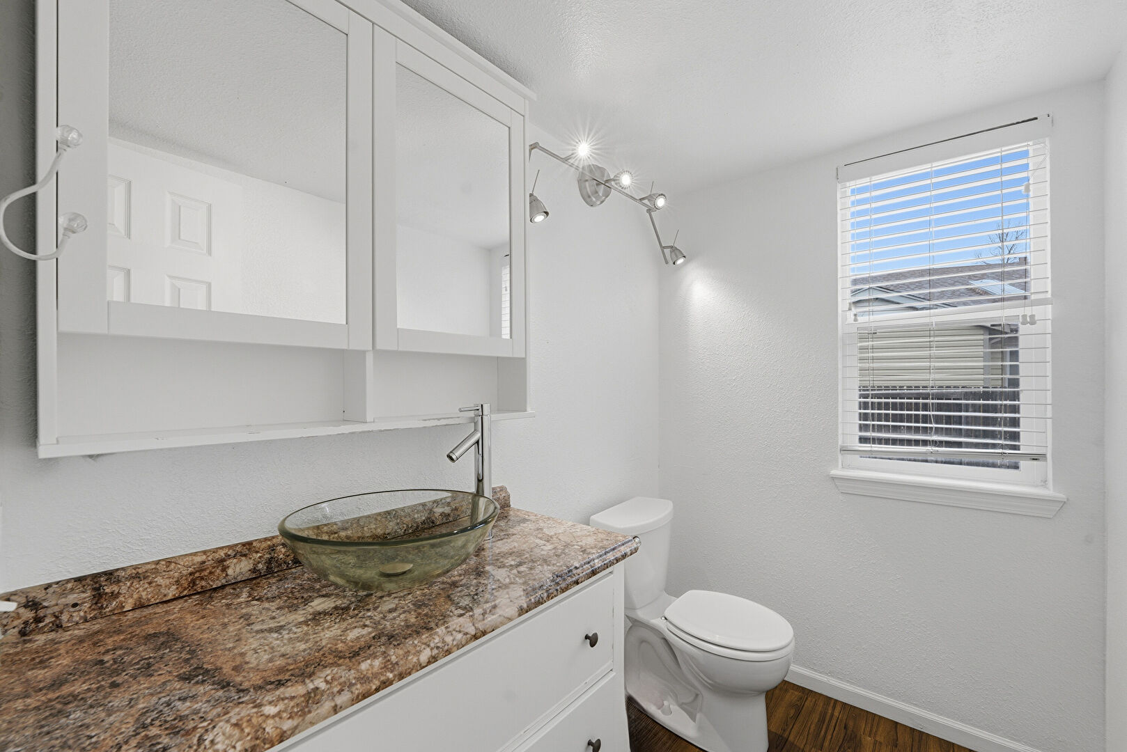 Baseboards Wall, Drywall, Full Bathroom, Half Bathroom, Stone Finish Floor, Textured Wall, Vanity, Vent, Wood Finish Floor, Combined Bath Shower, Natural Light