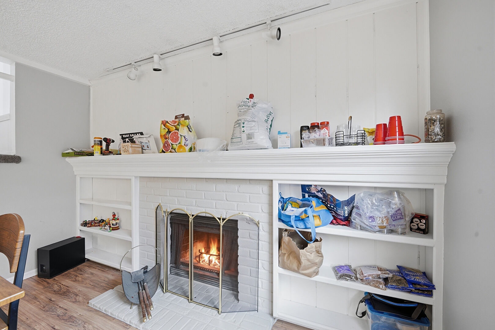 Drywall, Fireplace, Track Lighting, Wood Finish Floor, Textured Ceiling