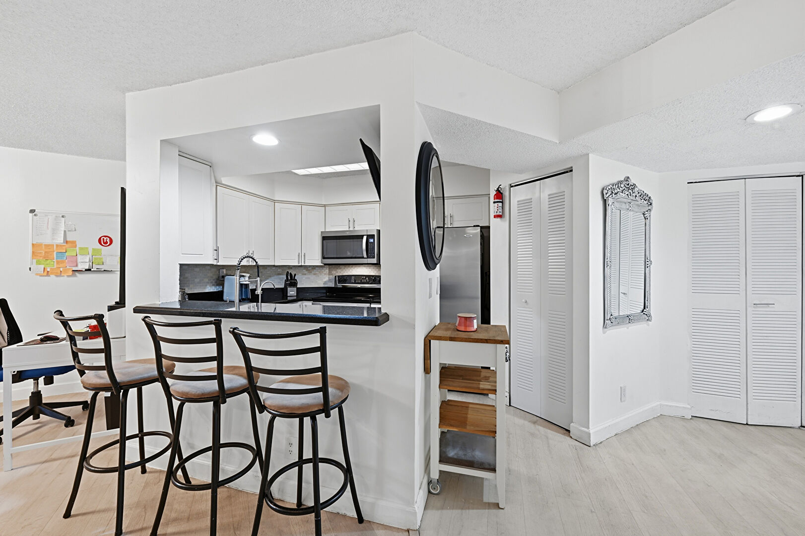 Baseboards Wall, Drywall, Fire Extinguisher, G Shaped Kitchen, Kitchen Peninsula, Natural Light, Pass Through Window, Raised Cabinets, Recessed Lighting, Stone Countertops, Textured Ceiling, Vent, Wood Finish Floor, Kitchen Bar, Recessed Lighting, Textured Ceiling