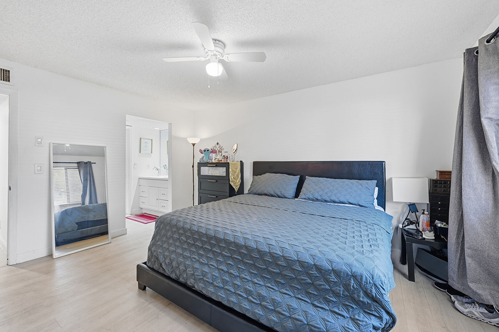 Baseboards Wall, Ceiling Fan, Drywall, Ensuite Bathroom, Natural Light, Textured Ceiling, Vent, Wood Finish Floor, Baseboards Wall, Textured Ceiling