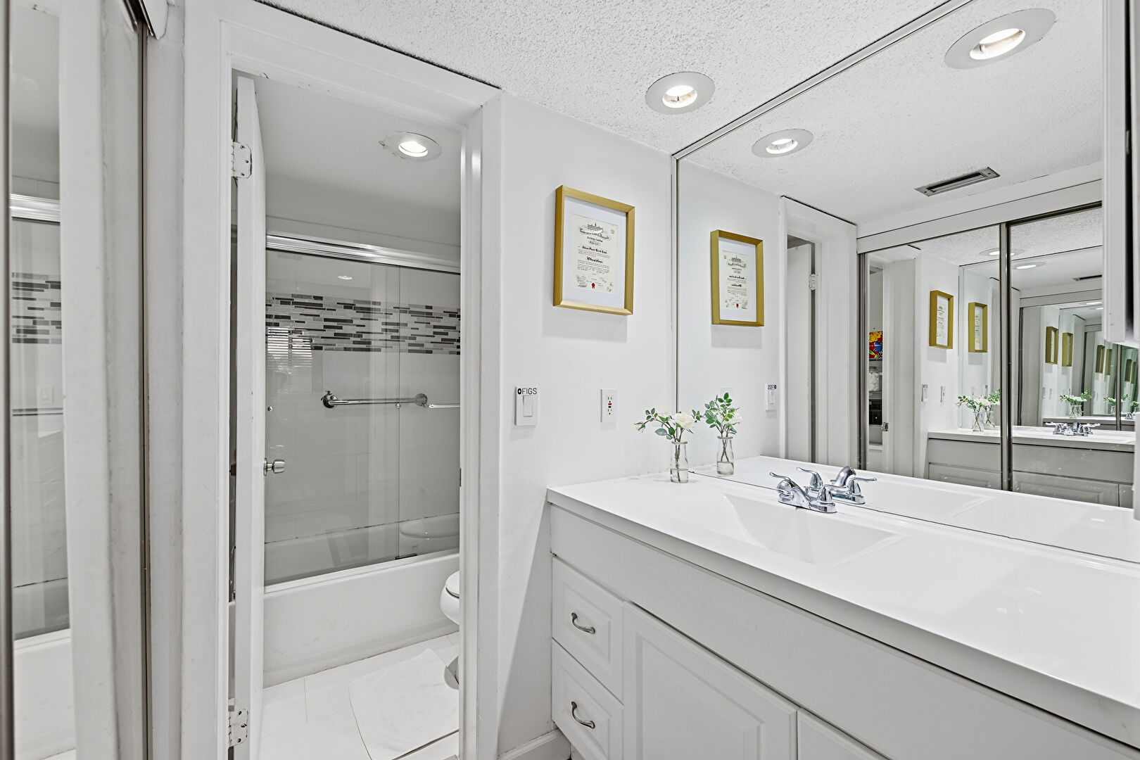 Baseboards Wall, Ceiling Fan, Combined Bath Shower, Drywall, Ensuite Bathroom, Full Bathroom, Natural Light, Recessed Lighting, Textured Ceiling, Vanity, Wood Finish Floor, Drywall, Full Bathroom, Vanity, Vent