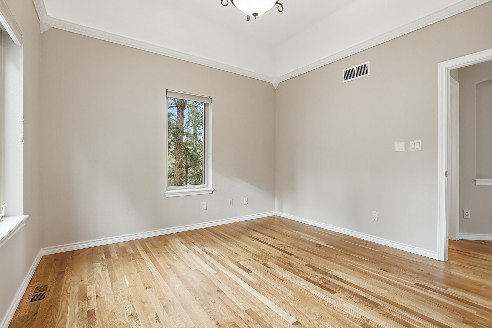 Baseboards Wall, Crown Molding, Drywall, Natural Light, Vent, Wood Finish Floor