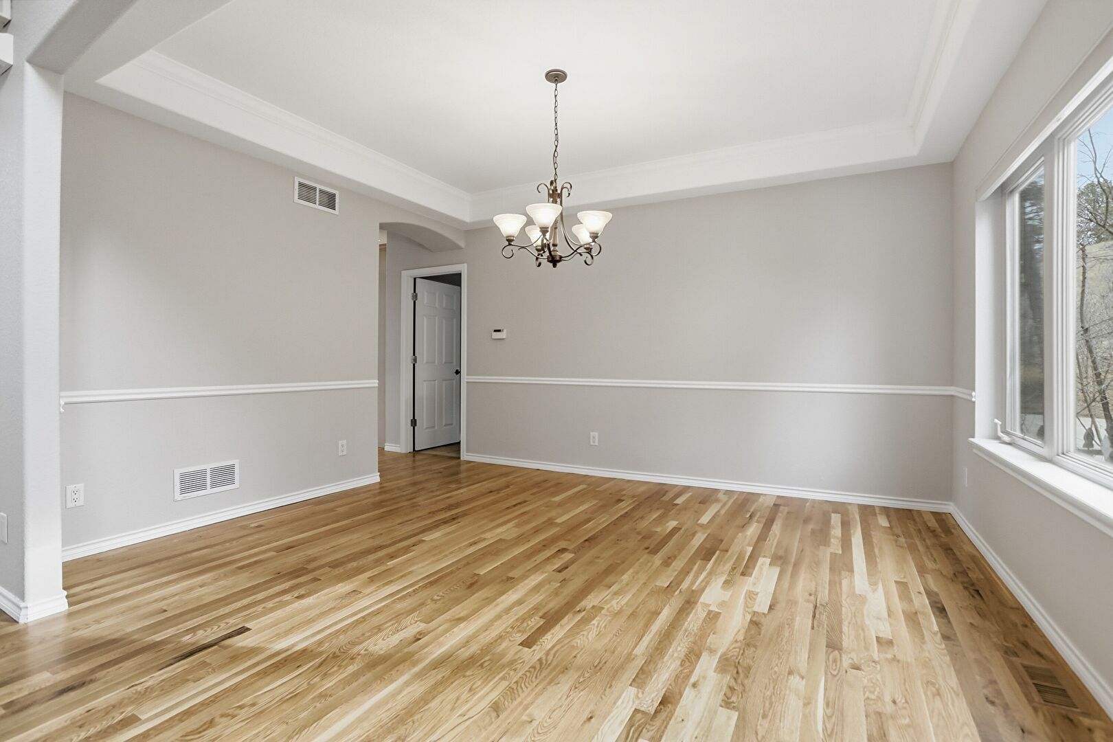 Baseboards Wall, Drywall, Natural Light, Notable Chandelier, Tray Ceiling, Vent, Wood Finish Floor, Arched Walkways