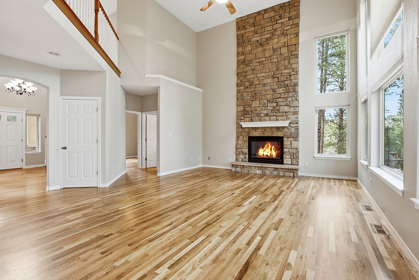 Arched Walkways, Baseboards Wall, Drywall, Natural Light, Notable Chandelier, Stairs, Vent, Wood Finish Floor, High Ceiling