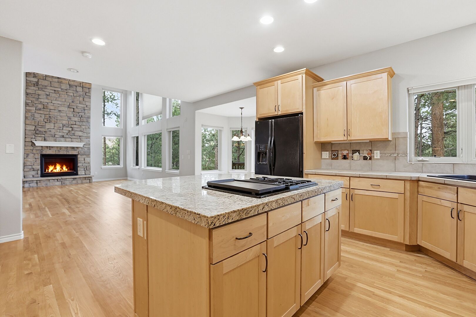 Baseboards Wall, Crown Molding Cabinets, Drywall, Kitchen Island, Natural Light, Notable Chandelier, Opens To Living Area, Pendant Lighting, Recessed Lighting, Shaker Cabinets, Stone Countertops, U Shaped Kitchen, Wood Finish Floor, Drywall, Fireplace, Natural Light