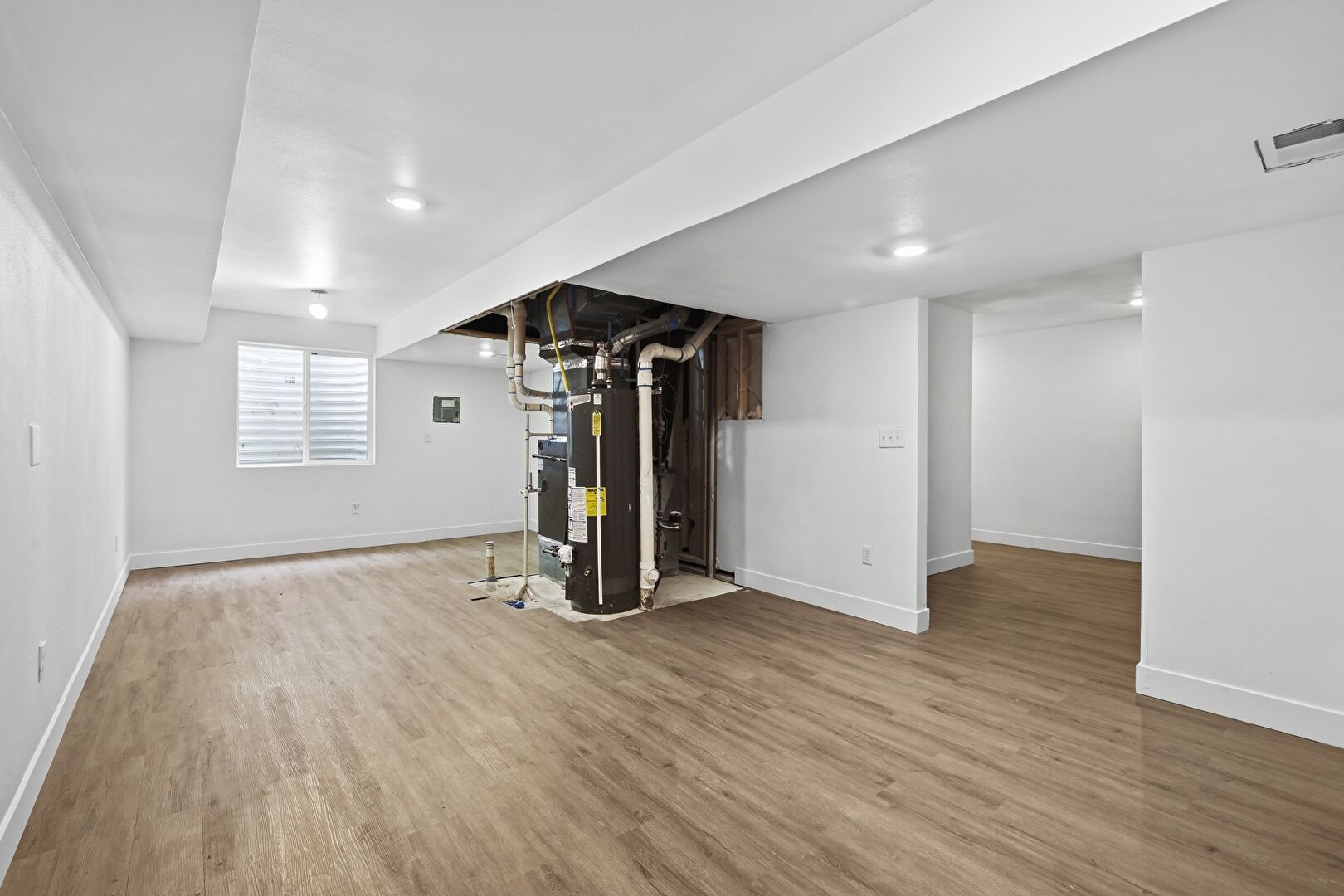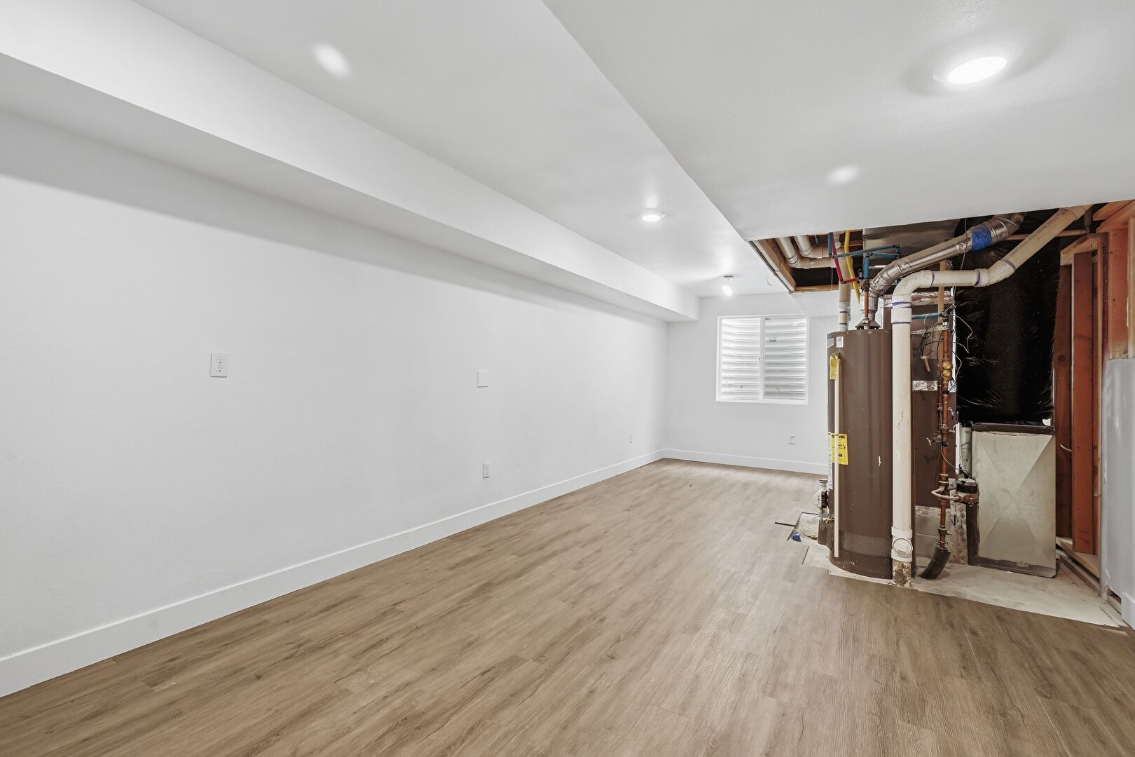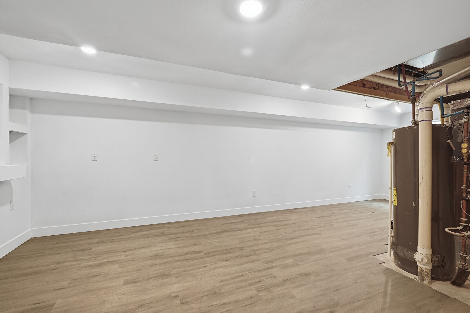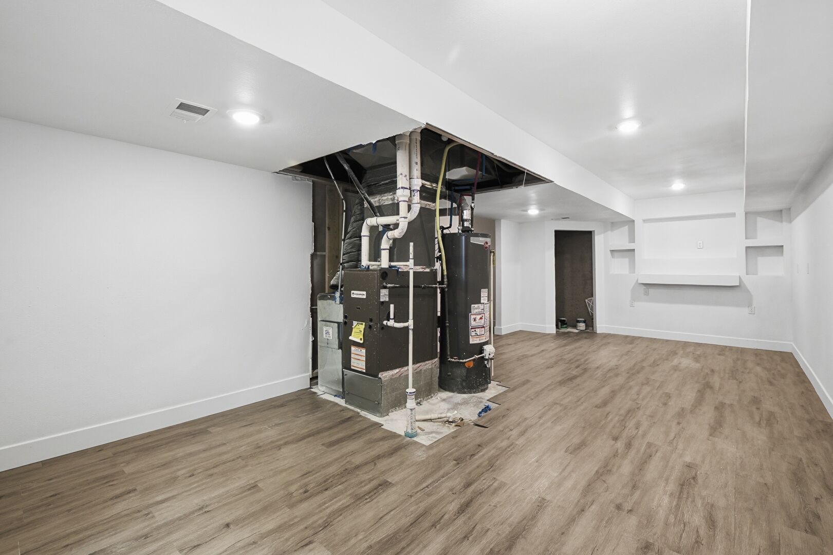 Baseboards Wall, Basement, Built In Shelves, Drywall, Furnace, Natural Light, Recessed Lighting, Vent, Water Heater, Wood Finish Floor, Basement, Recessed Lighting, Vent, Water Heater
