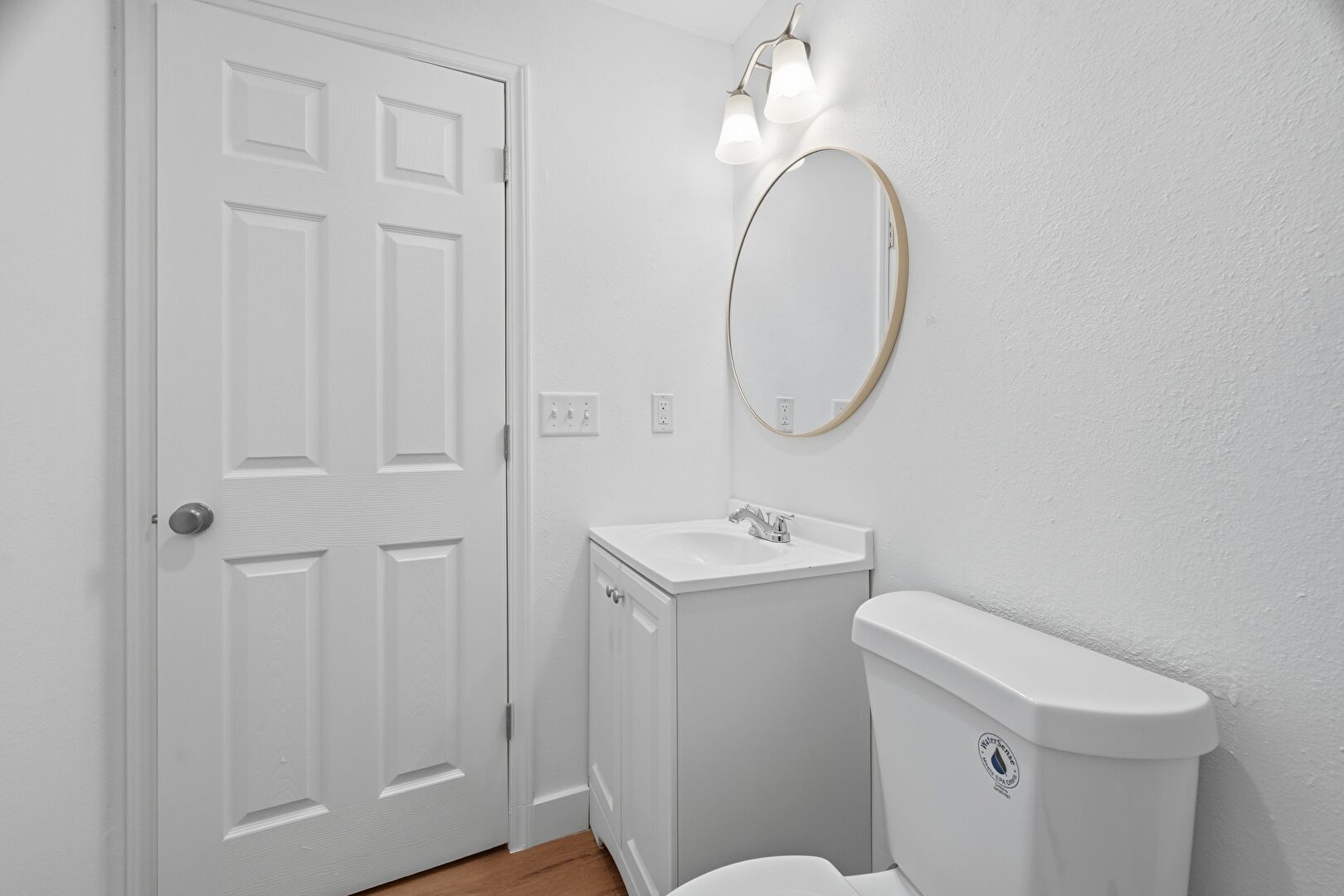 Baseboards Wall, Drywall, Half Bathroom, Wood Finish Floor, Vanity