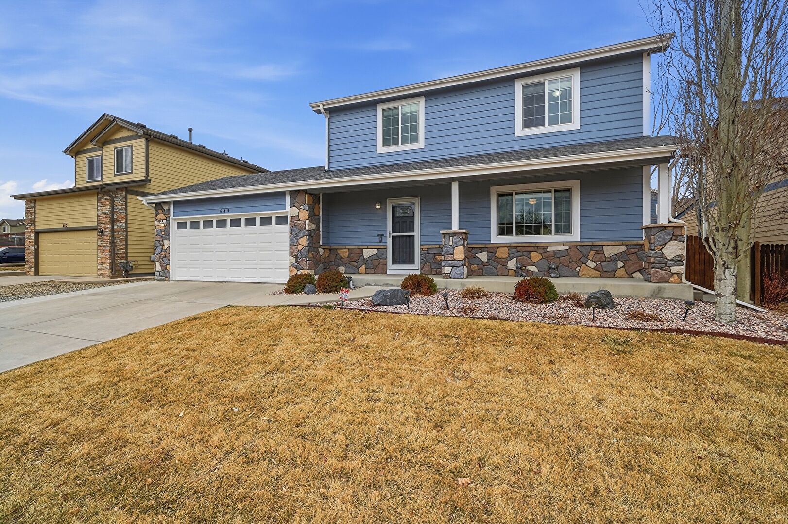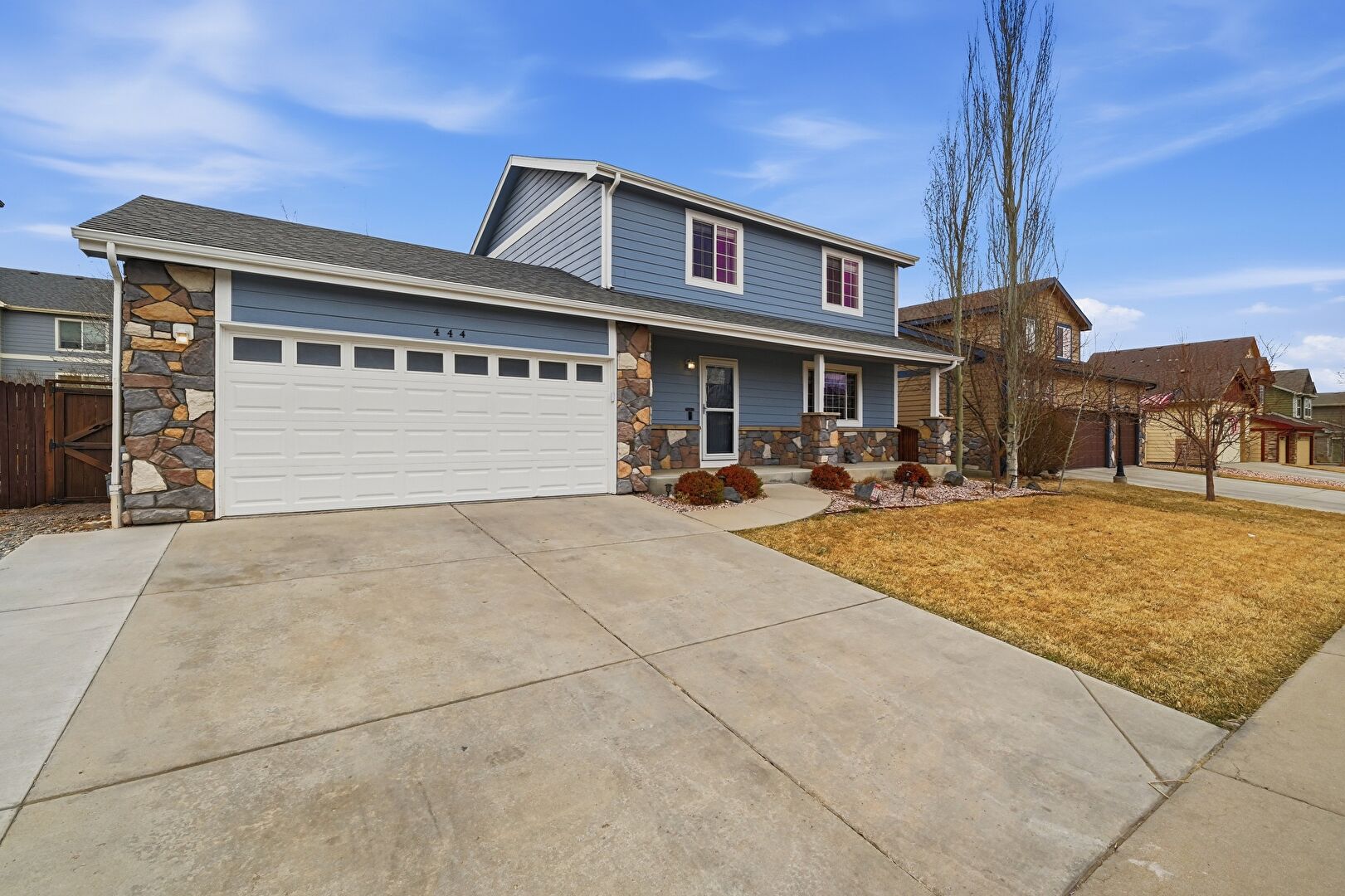 Downspout, Driveway, Fence, Gas Meter, Gutters, Horizontal Siding, Lawn, Porch, Residential View, Shingle Roof, Stone Siding, Driveway, Lawn, Porch, Shingle Roof, Stone Siding