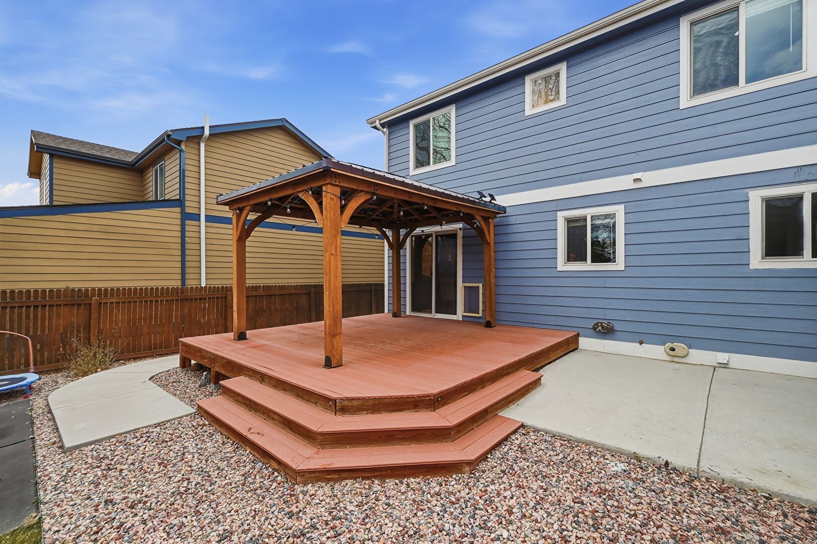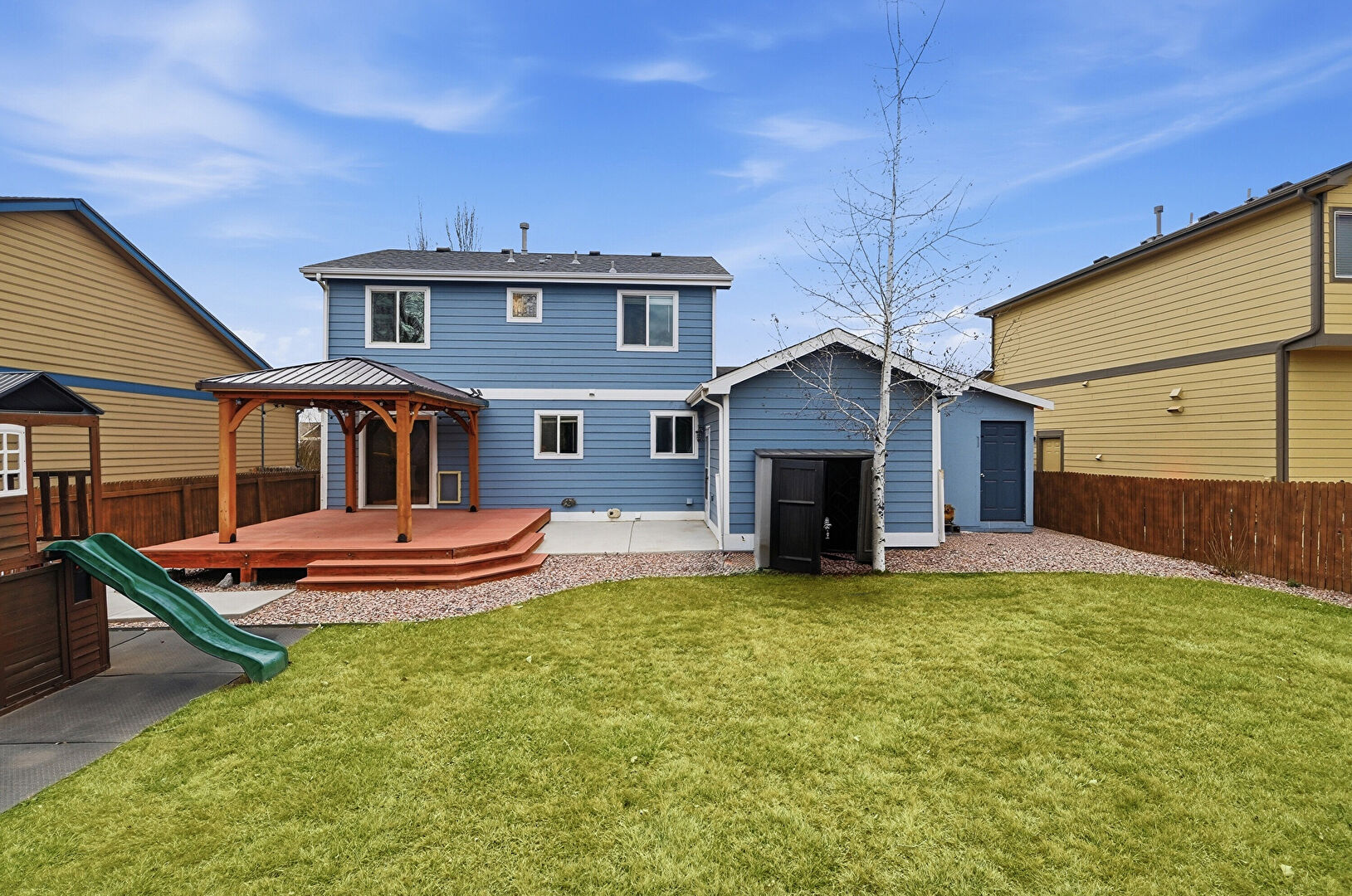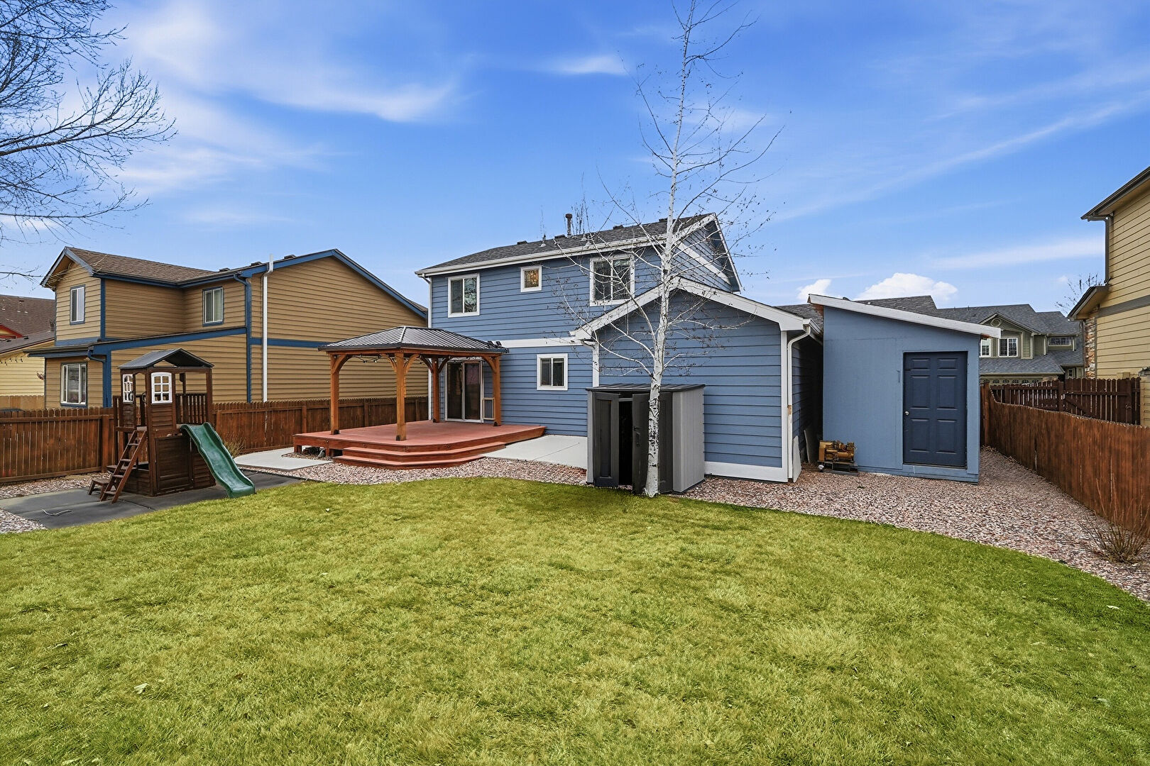 Deck, Fence, Gazebo, Lawn, Playground, Residential View, Deck, Patio