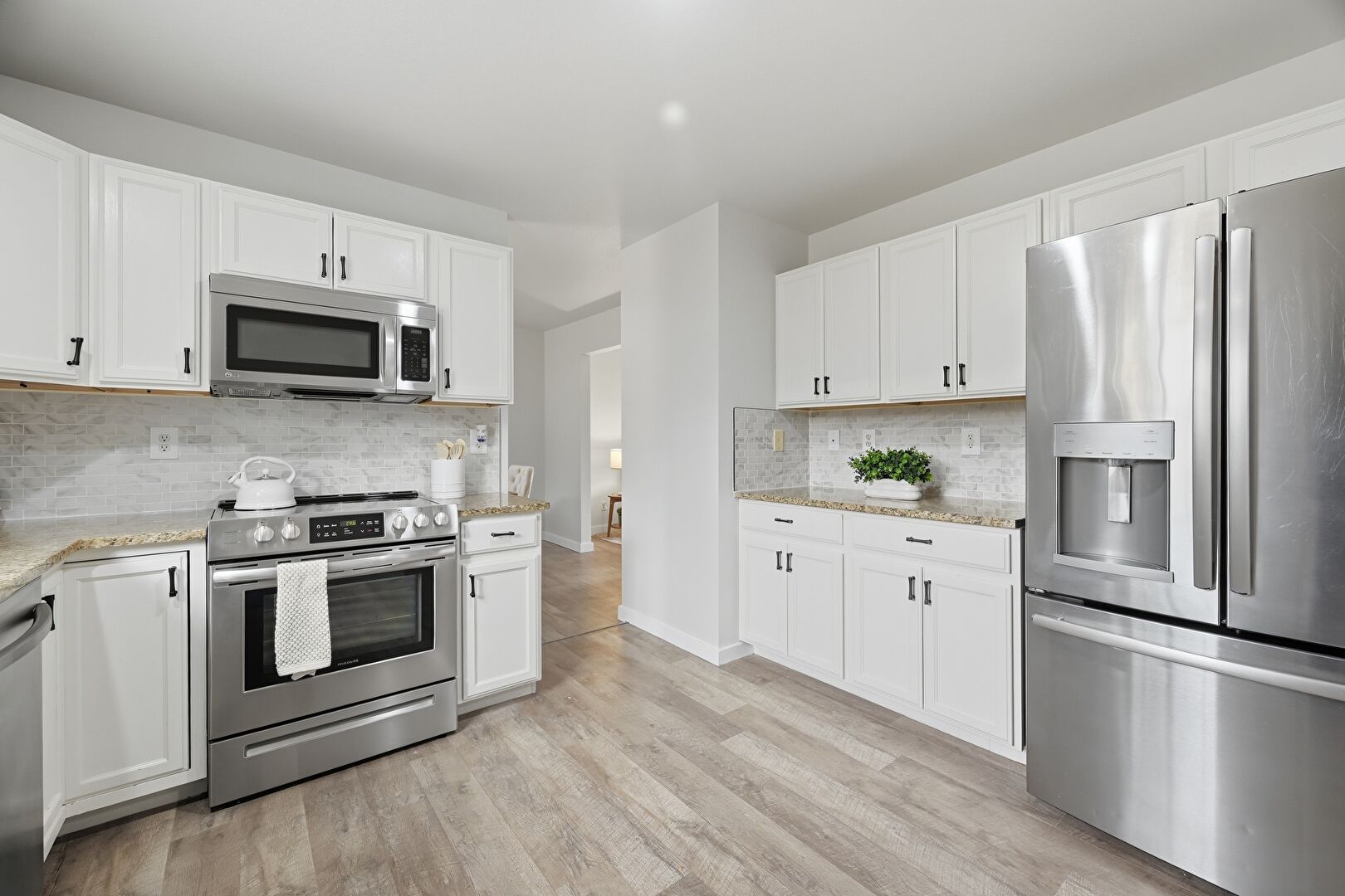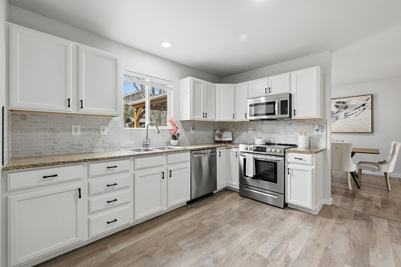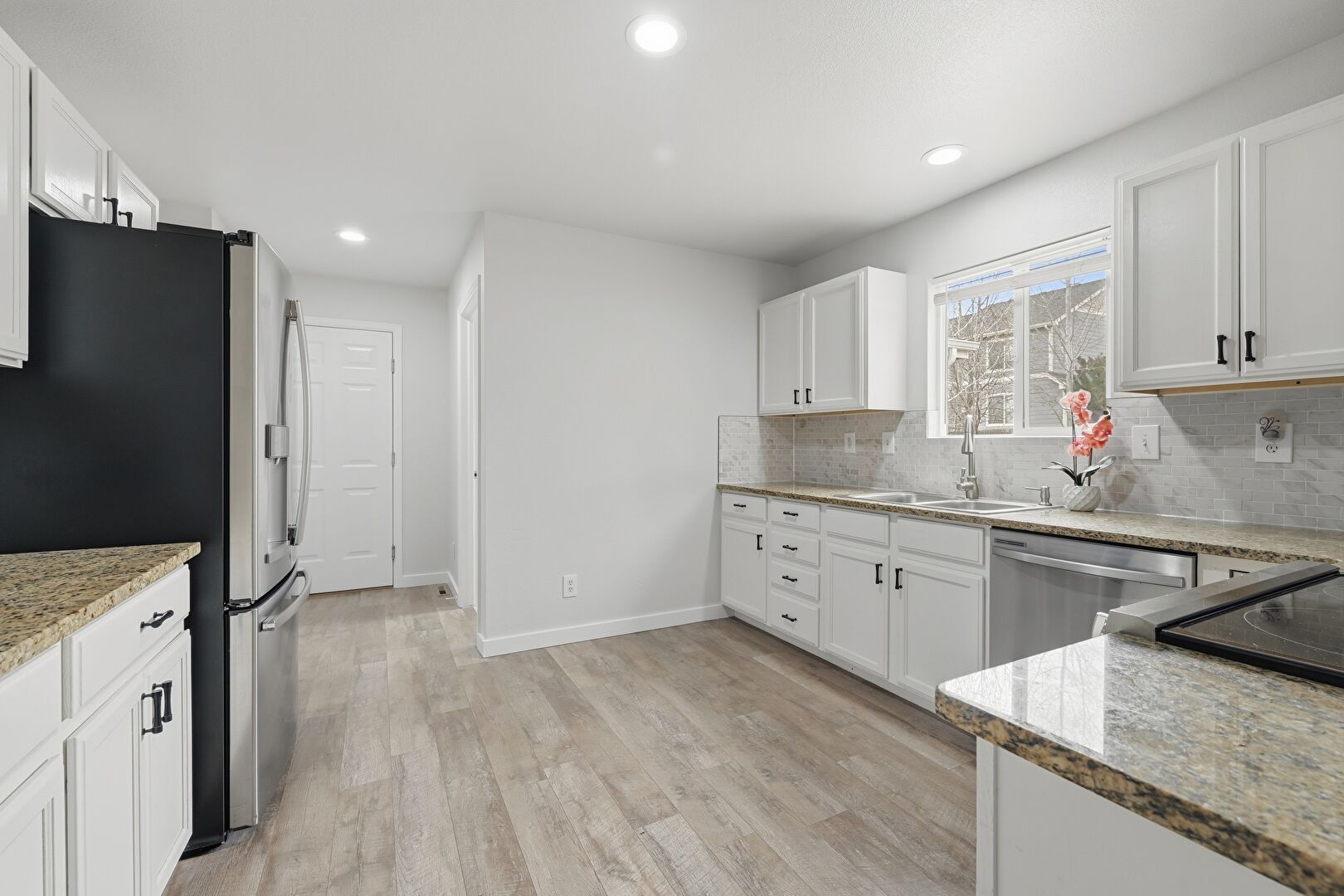 Baseboards Wall, Drywall, Natural Light, Recessed Lighting, Shaker Cabinets, Stone Countertops, Wood Finish Floor, Baseboards Wall, Natural Light, Stone Countertops