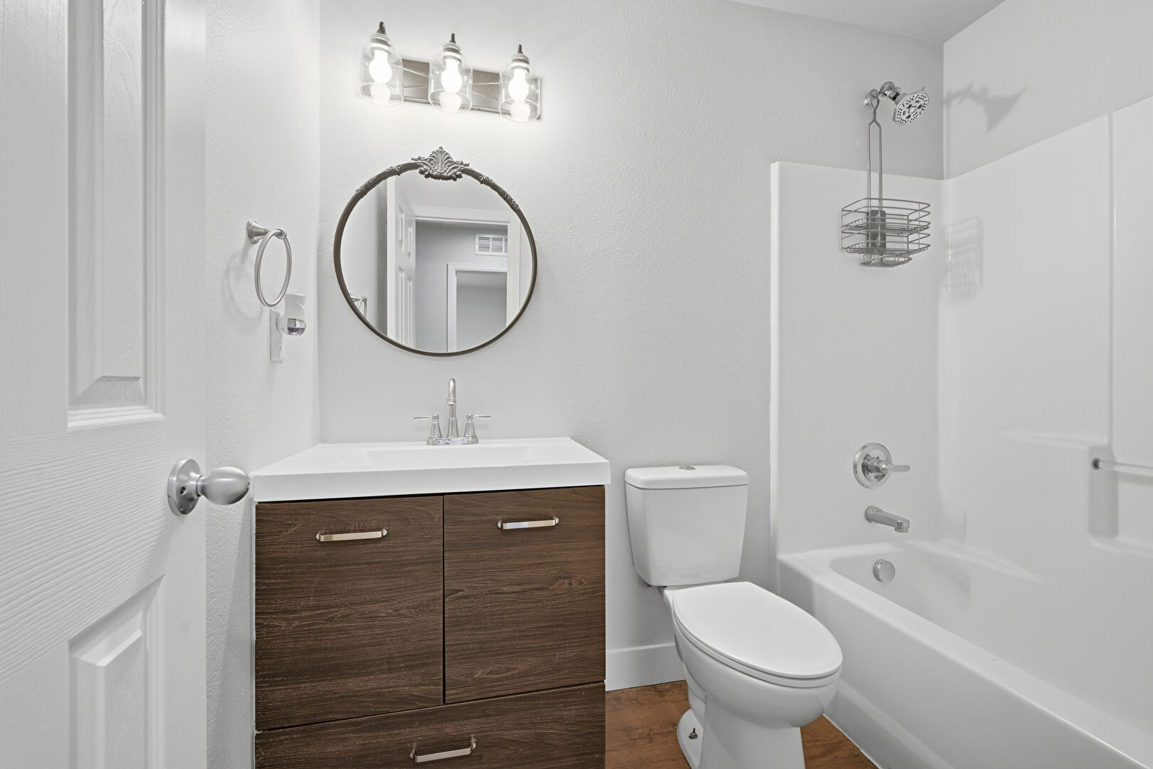Combined Bath Shower, Full Bathroom, Natural Light, Vanity, Wood Finish Floor, Drywall