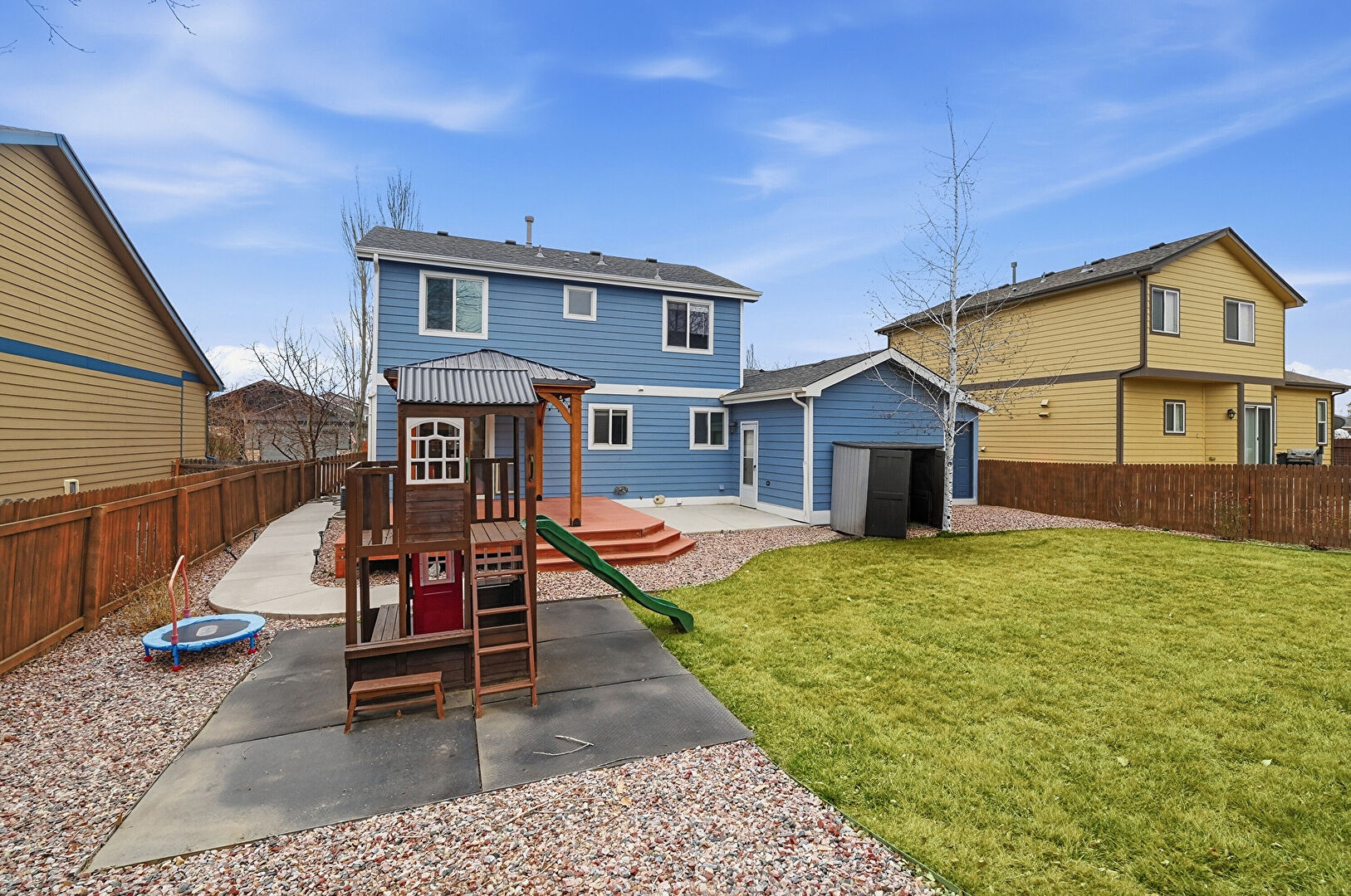Deck, Downspout, Fence, Gazebo, Grill, Gutters, Horizontal Siding, Lawn, Patio, Playground, Horizontal Siding, Playground