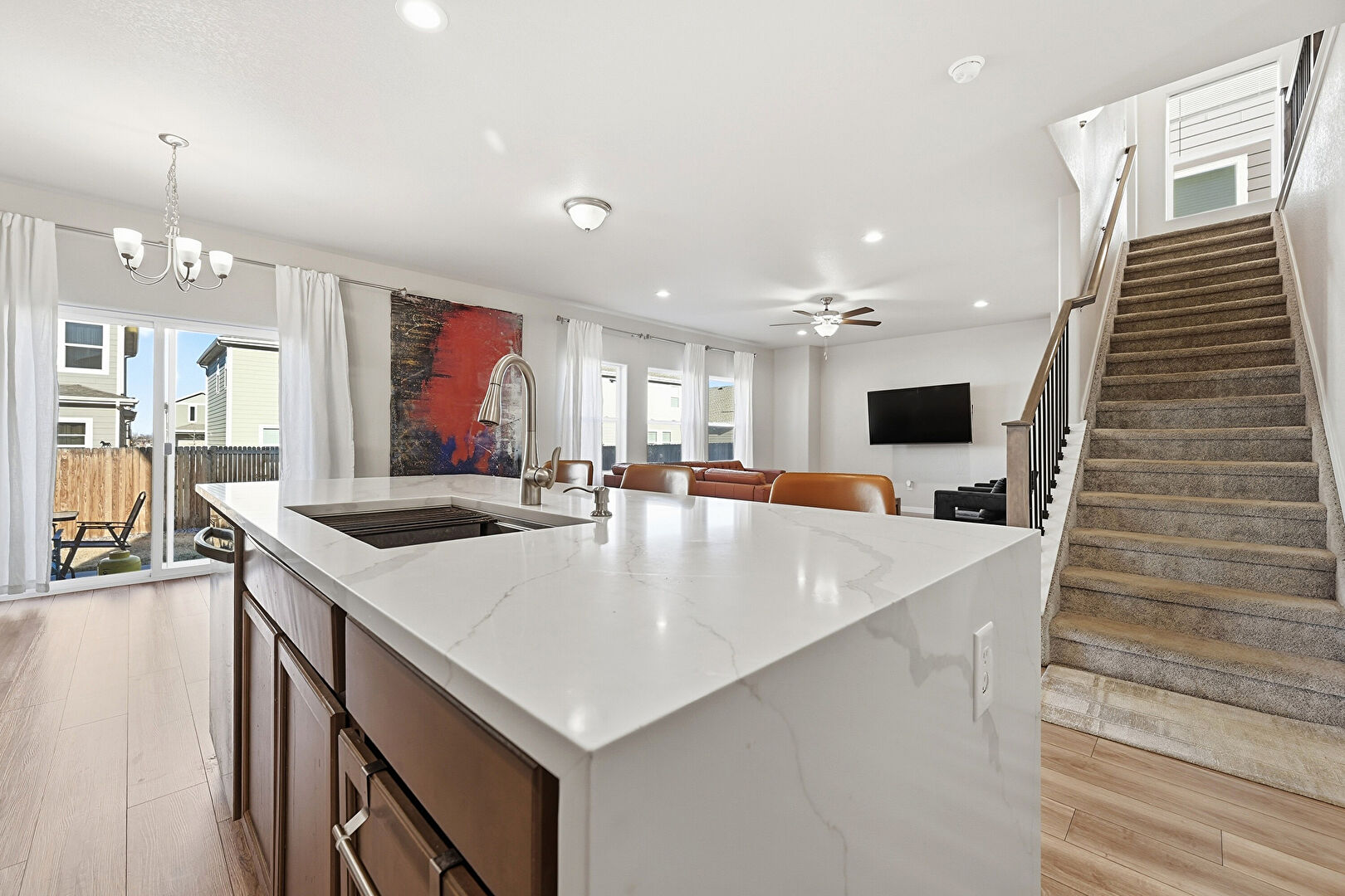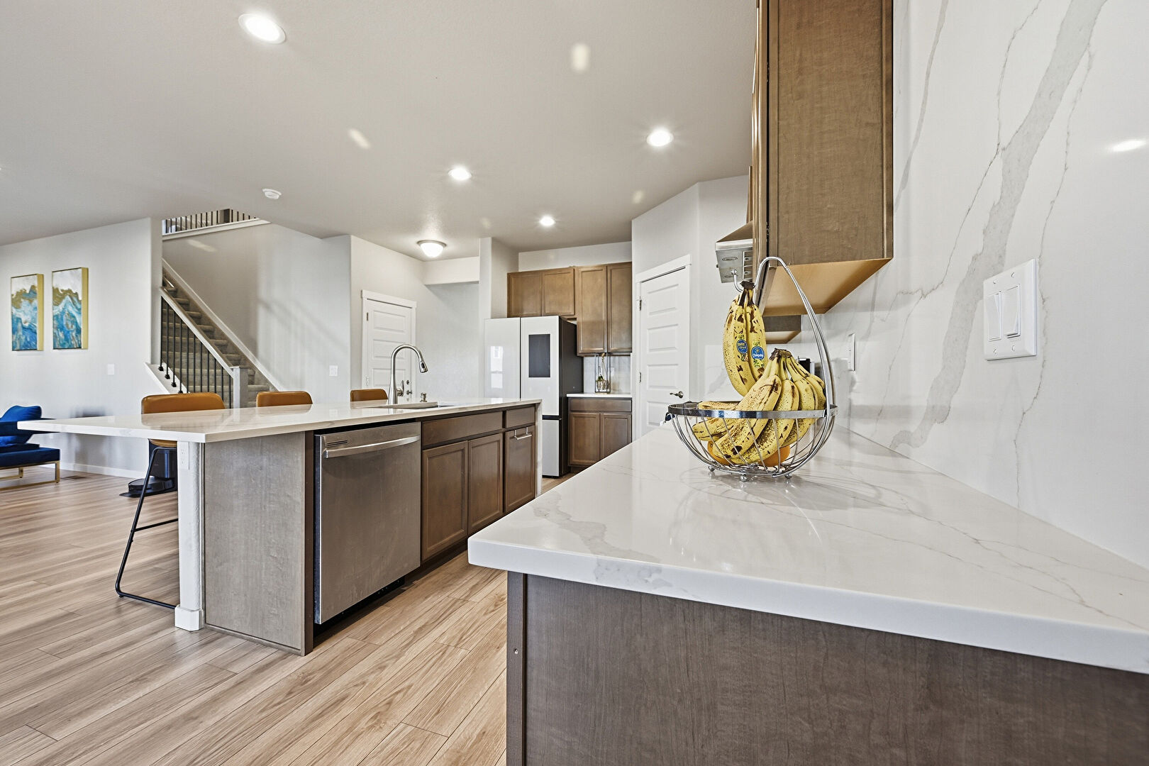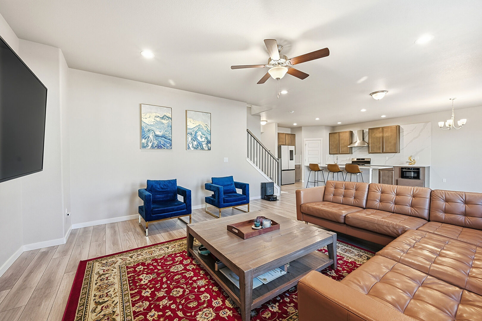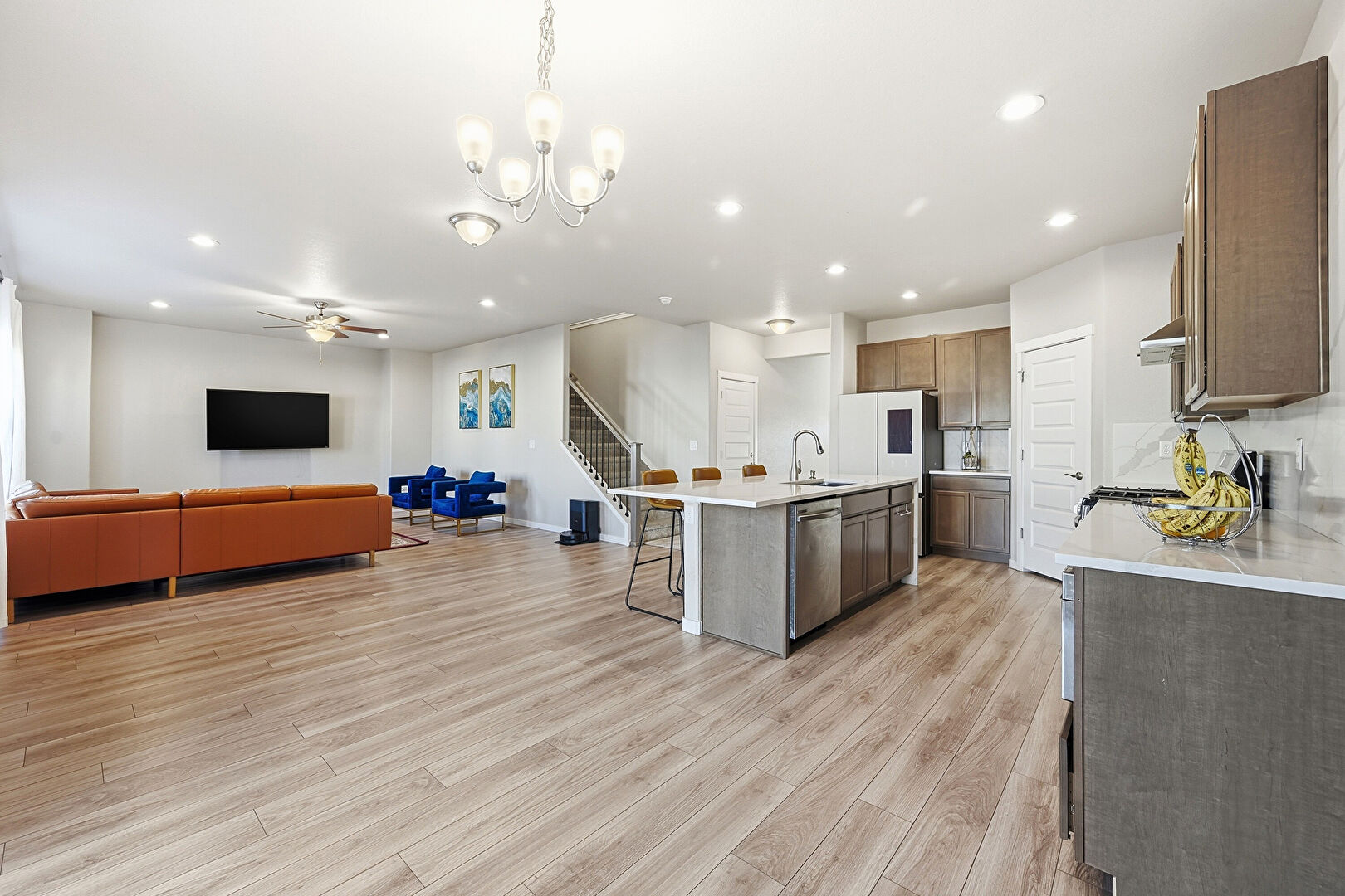 Baseboards Wall, Ceiling Fan, Drywall, L Shaped Kitchen, Natural Light, Notable Chandelier, Recessed Lighting, Stairs, Vent, Wood Finish Floor, Ceiling Fan, Recessed Lighting, Wood Finish Floor