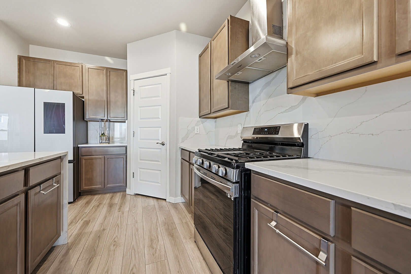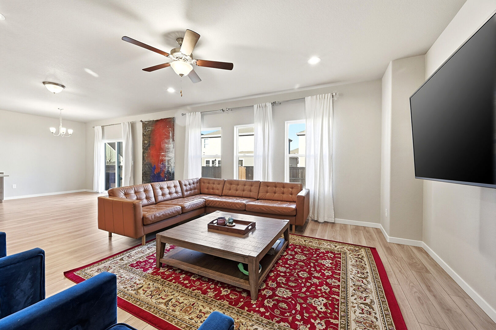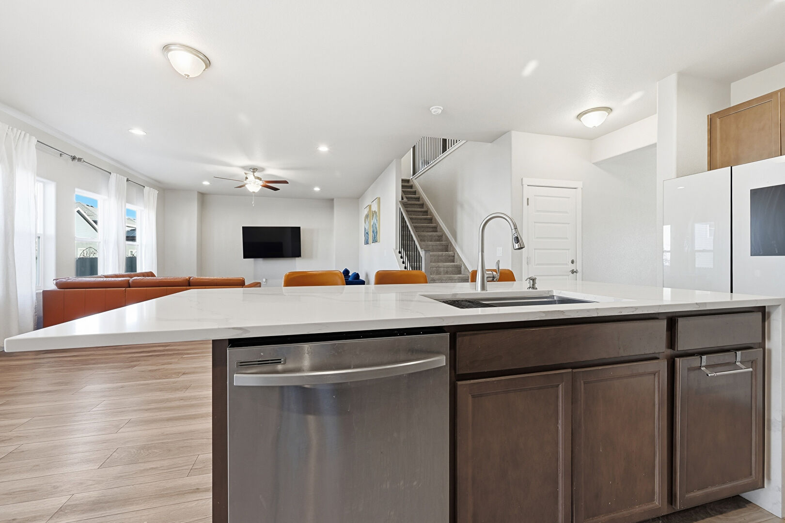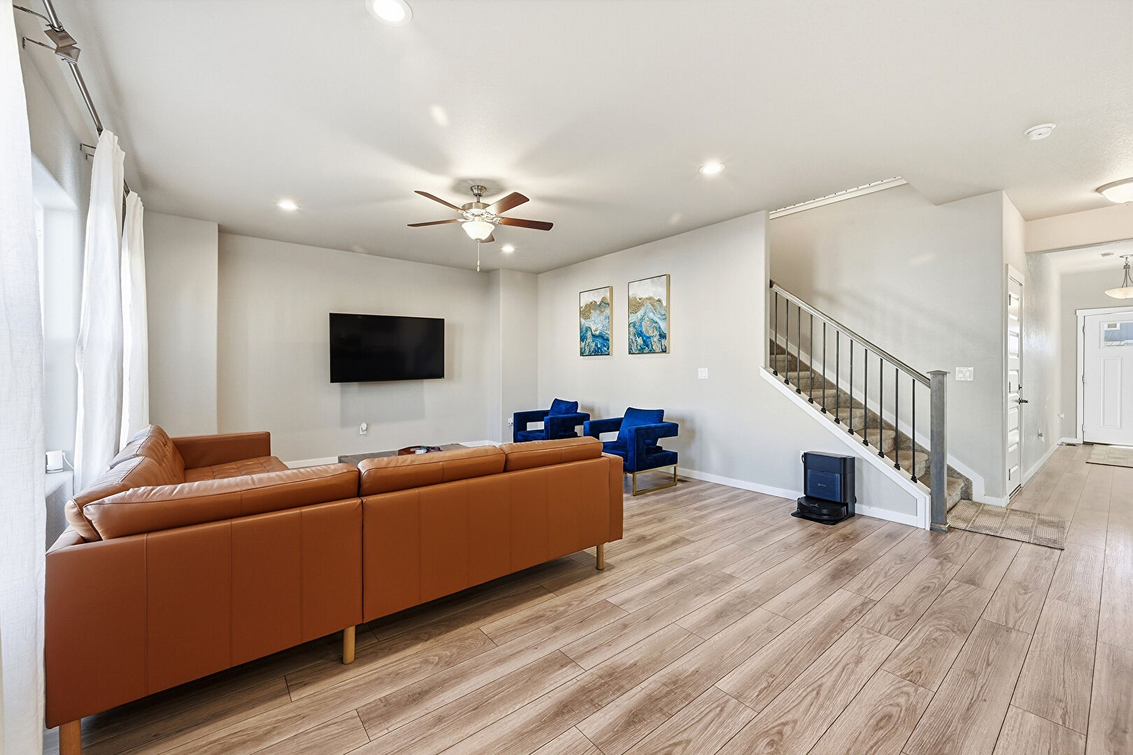 Baseboards Wall, Ceiling Fan, Drywall, L Shaped Kitchen, Natural Light, Notable Chandelier, Recessed Lighting, Stairs, Vent, Wood Finish Floor, Ceiling Fan, Recessed Lighting, Wood Finish Floor