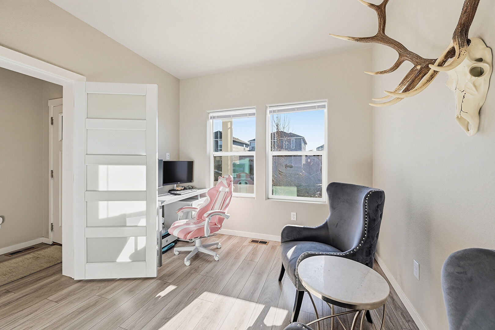 Baseboards Wall, Drywall, Natural Light, Vaulted Ceiling, Vent, Wood Finish Floor, Office Area, Wood Finish Floor