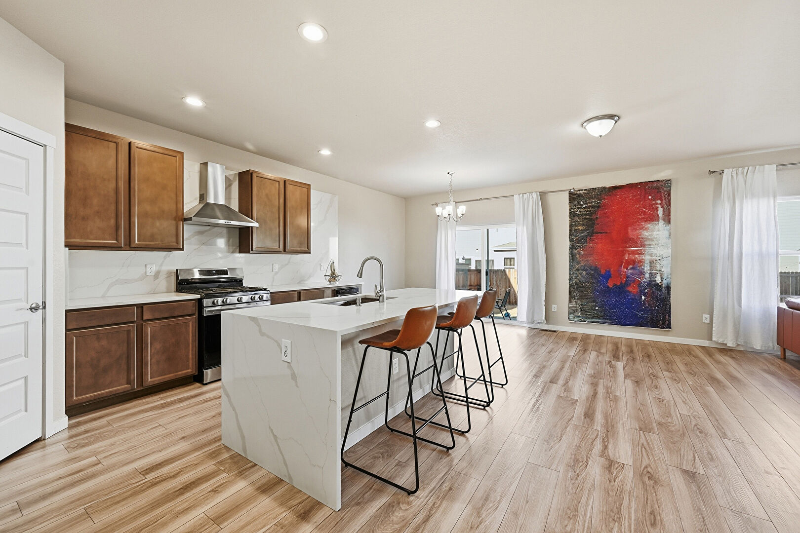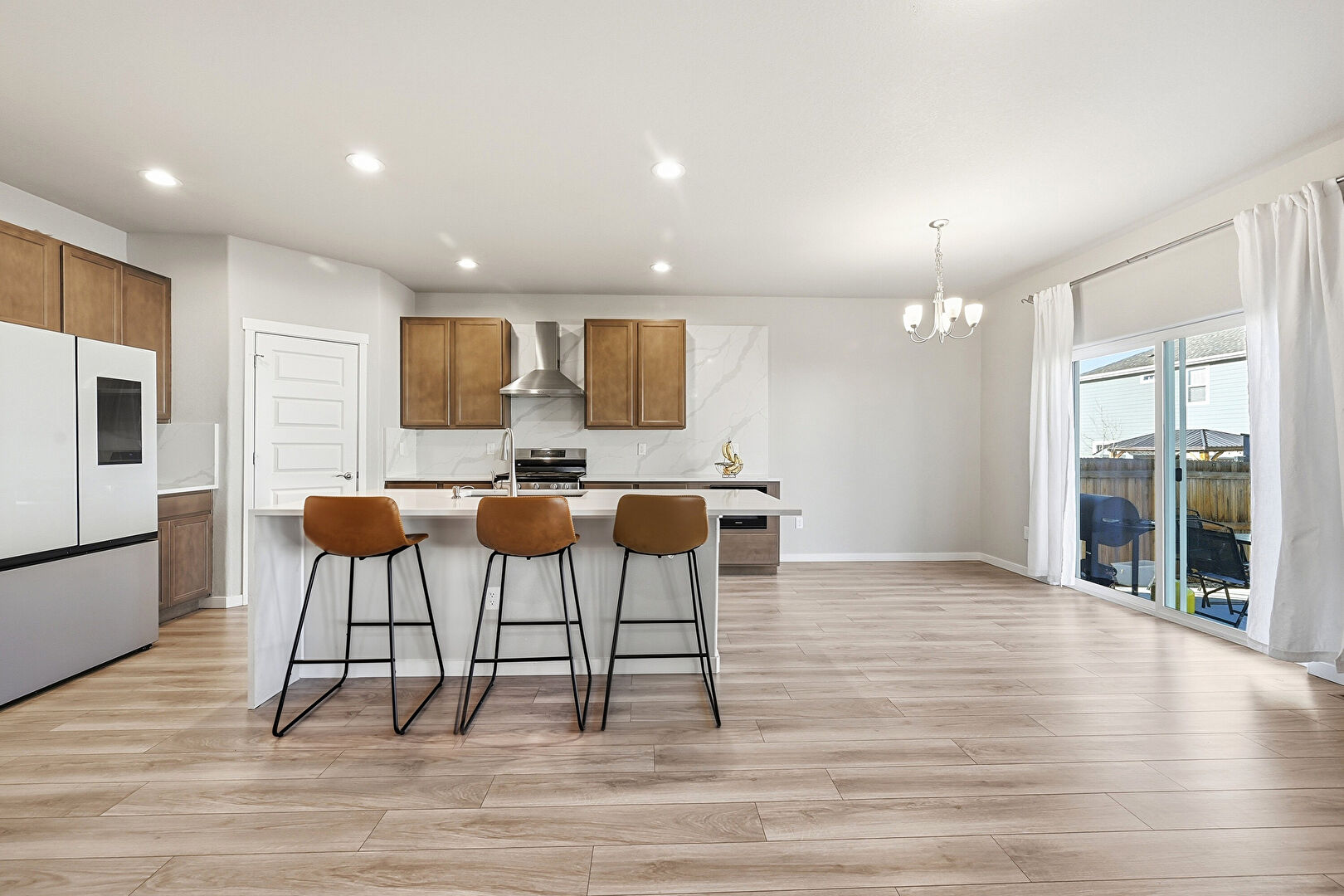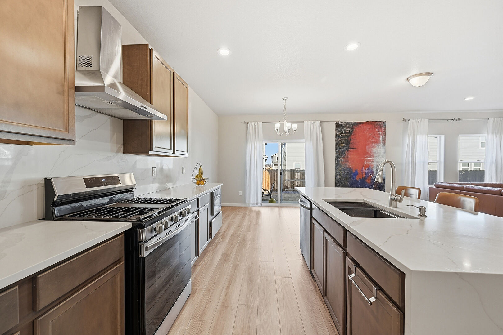 Baseboards Wall, Ceiling Fan, Dark Brown Cabinets, Drywall, Grill, Kitchen Bar, Kitchen Island, L Shaped Kitchen, Medium Brown Cabinets, Natural Light, Notable Chandelier, Opens To Living Area, Pendant Lighting, Recessed Lighting, Shaker Cabinets, Stone Countertops, Vent, Wood Finish Floor, Ceiling Fan, Drywall, Kitchen Island, Medium Brown Cabinets, Opens To Living Area, Recessed Lighting, Shaker Cabinets, Stone Countertops