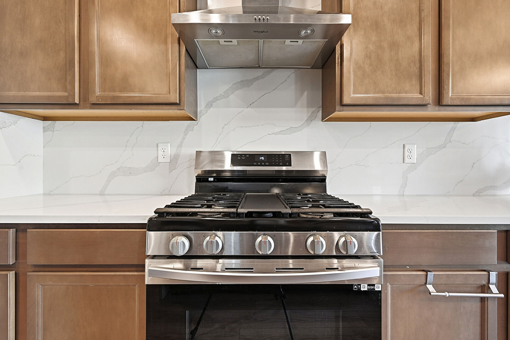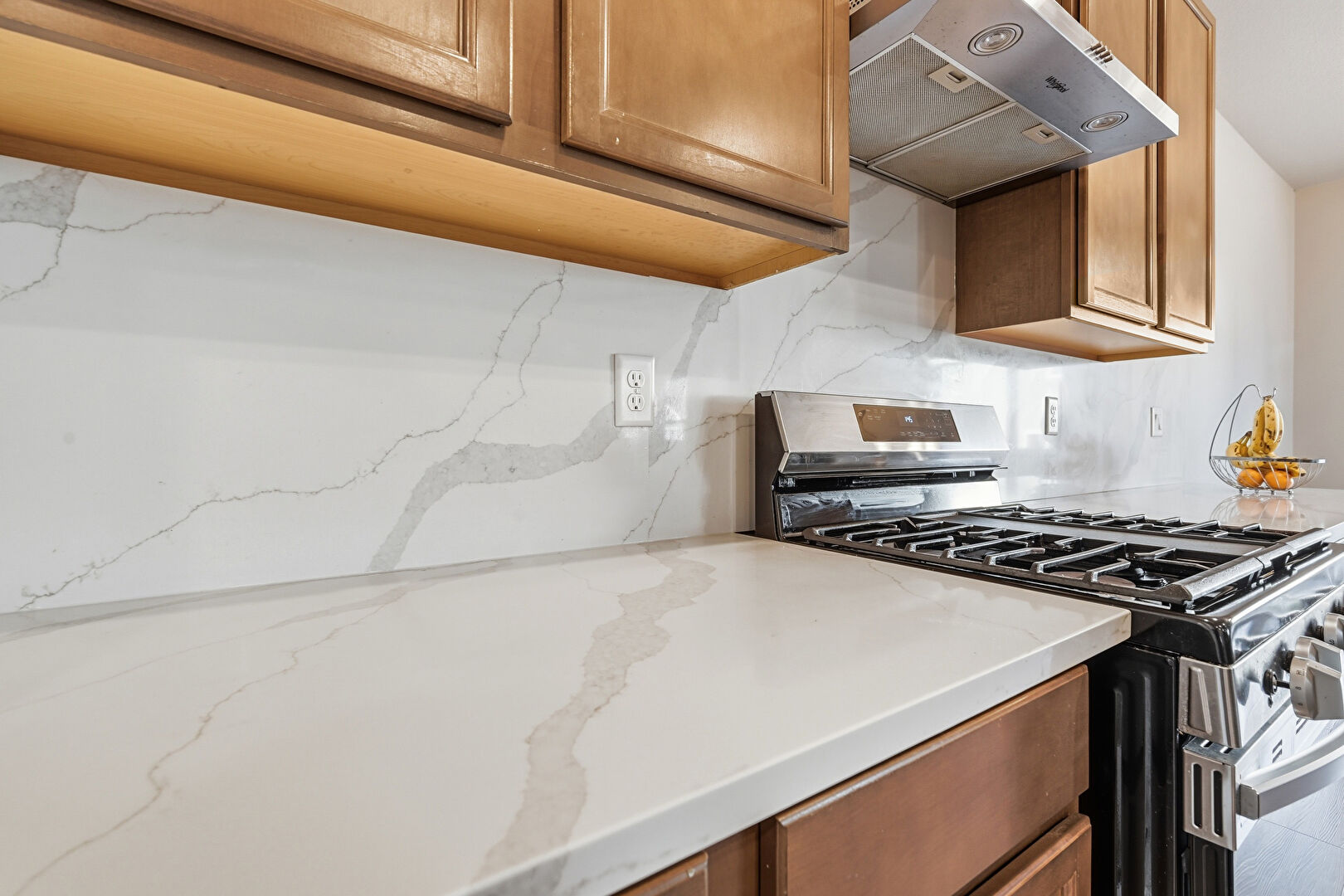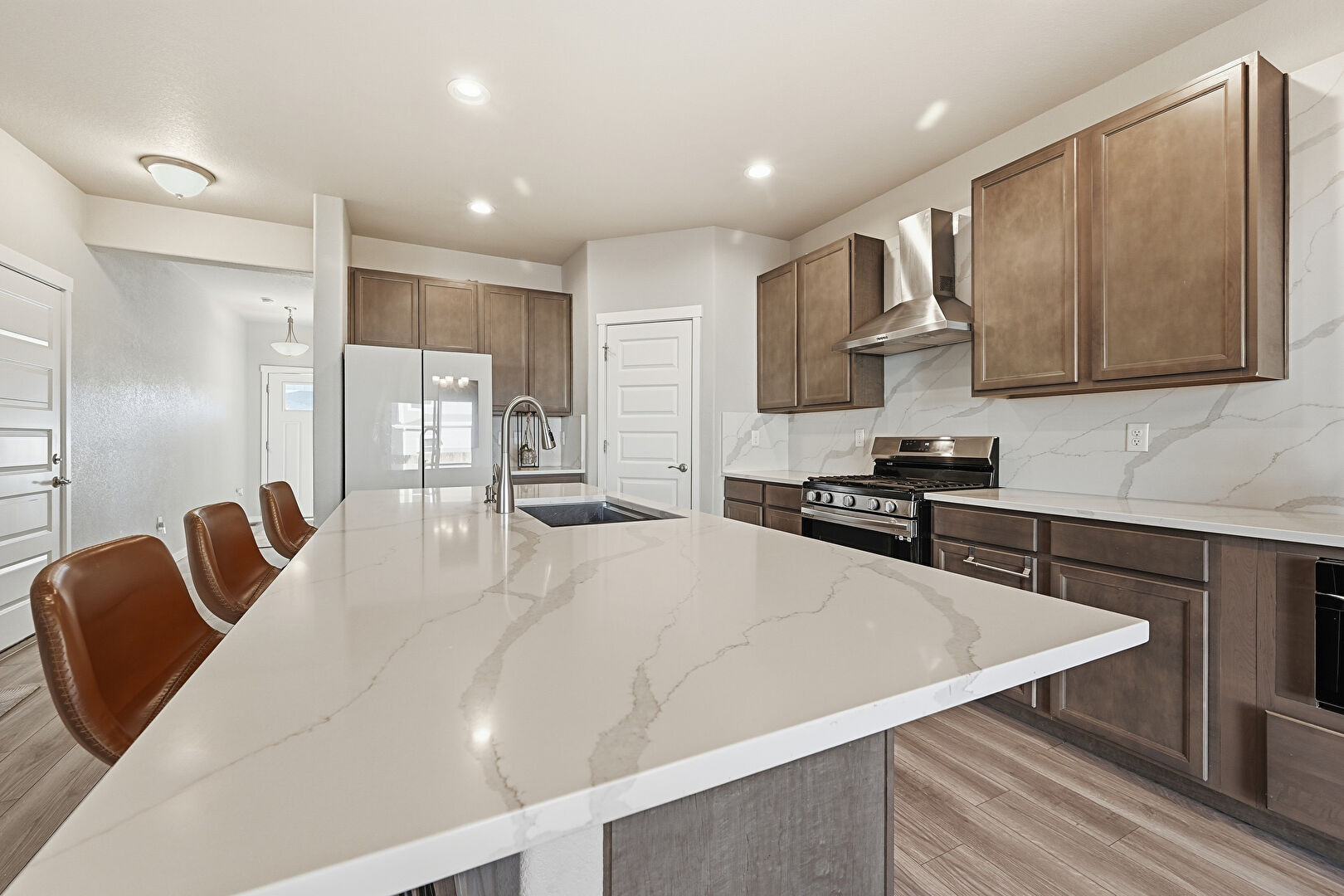Baseboards Wall, Ceiling Fan, Dark Brown Cabinets, Drywall, Grill, Kitchen Bar, Kitchen Island, L Shaped Kitchen, Medium Brown Cabinets, Natural Light, Notable Chandelier, Opens To Living Area, Pendant Lighting, Recessed Lighting, Shaker Cabinets, Stone Countertops, Vent, Wood Finish Floor, Ceiling Fan, Drywall, Kitchen Island, Medium Brown Cabinets, Opens To Living Area, Recessed Lighting, Shaker Cabinets, Stone Countertops