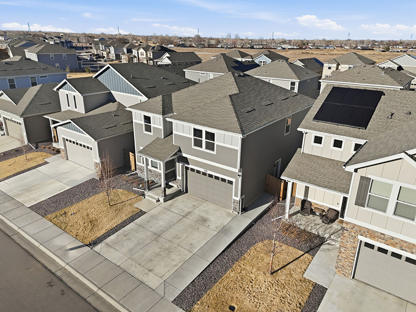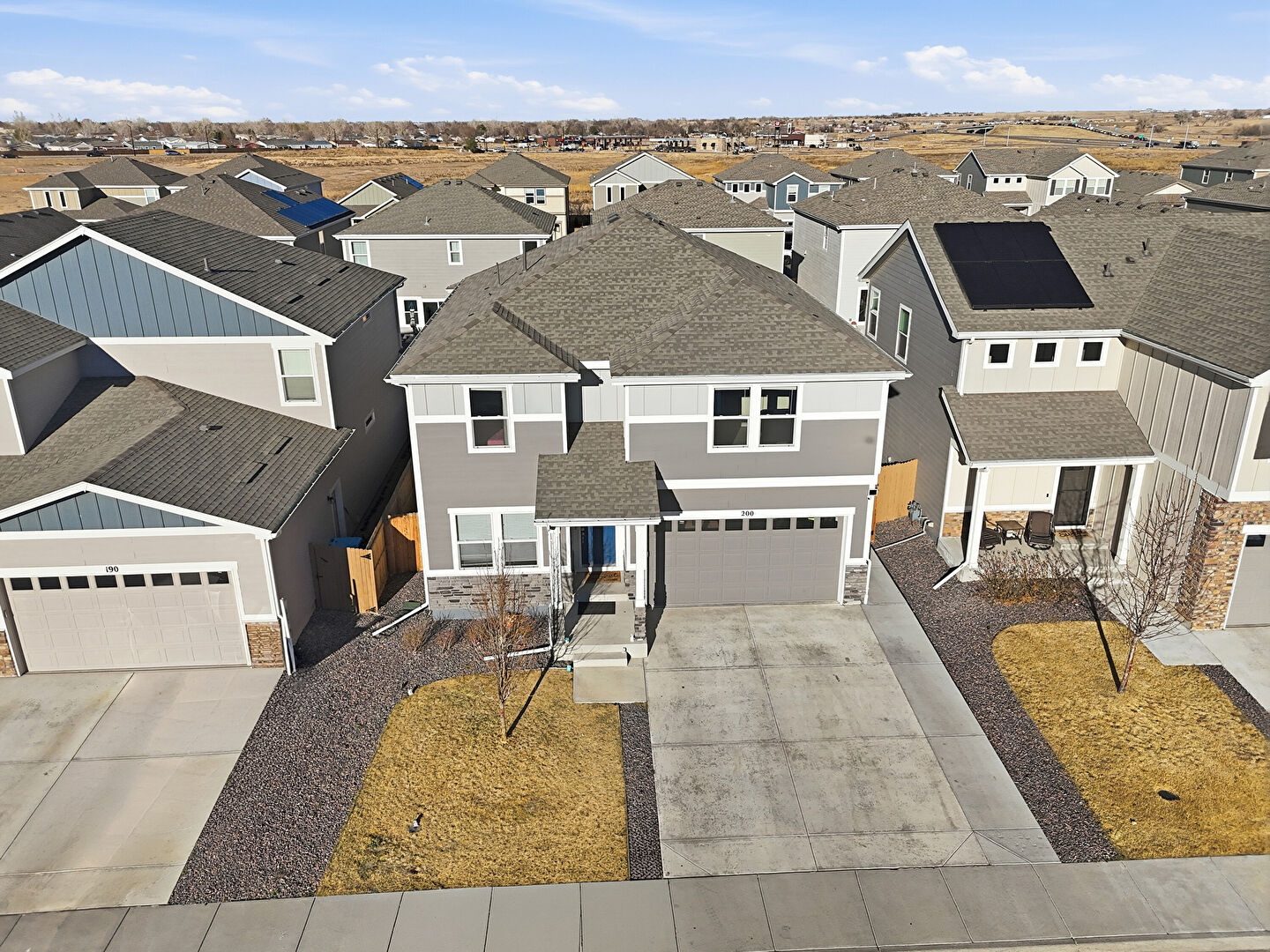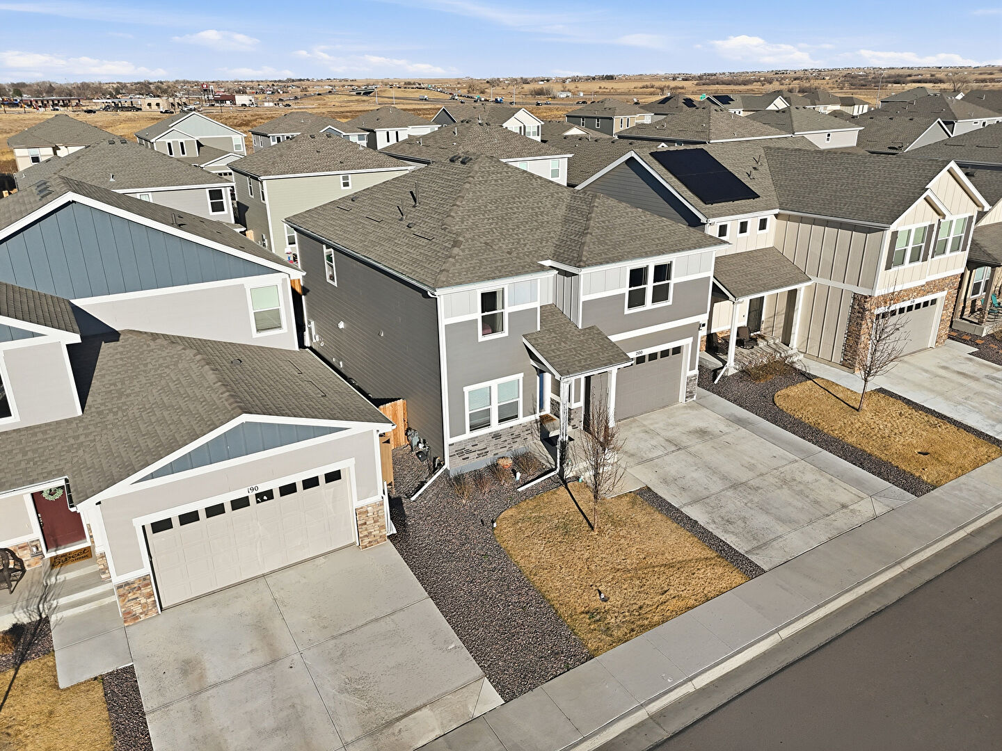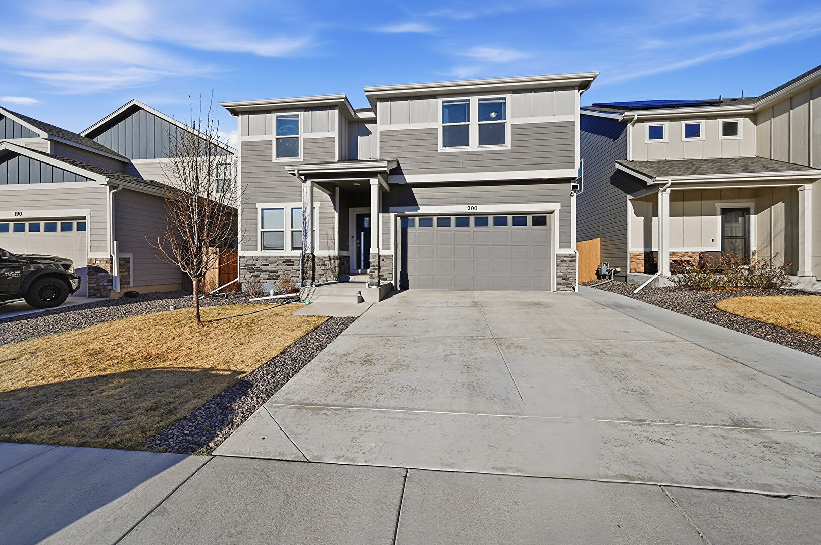 Board Batten Siding, Built In Garage, Concrete Foundation, Downspout, Driveway, Fence, Gutters, Horizontal Siding, Lawn, Residential View, Shingle Roof, Solar Panels, Stone Siding, Stoop, Vertical Siding, Board Batten Siding, Downspout, Gutters, Horizontal Siding, Stoop