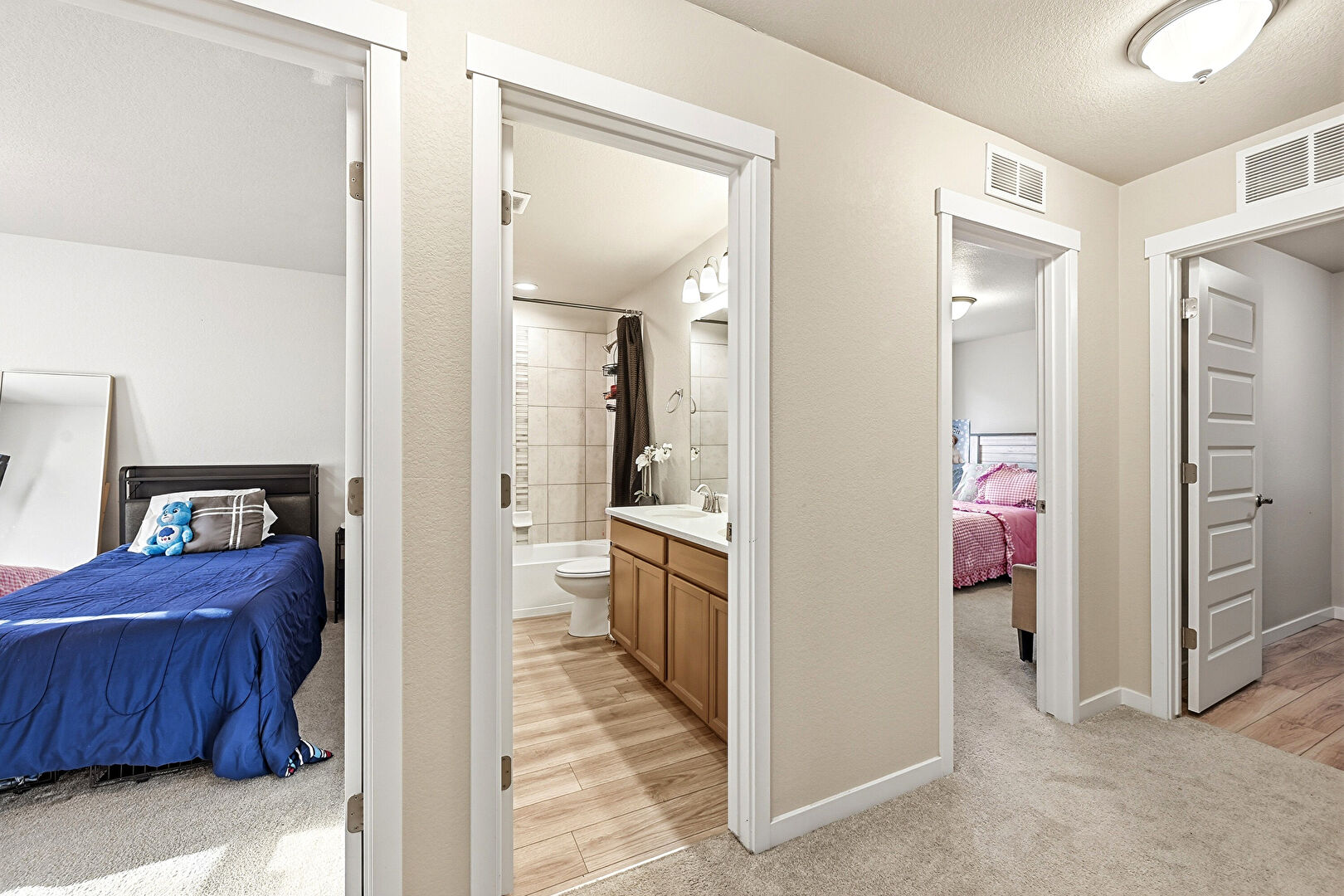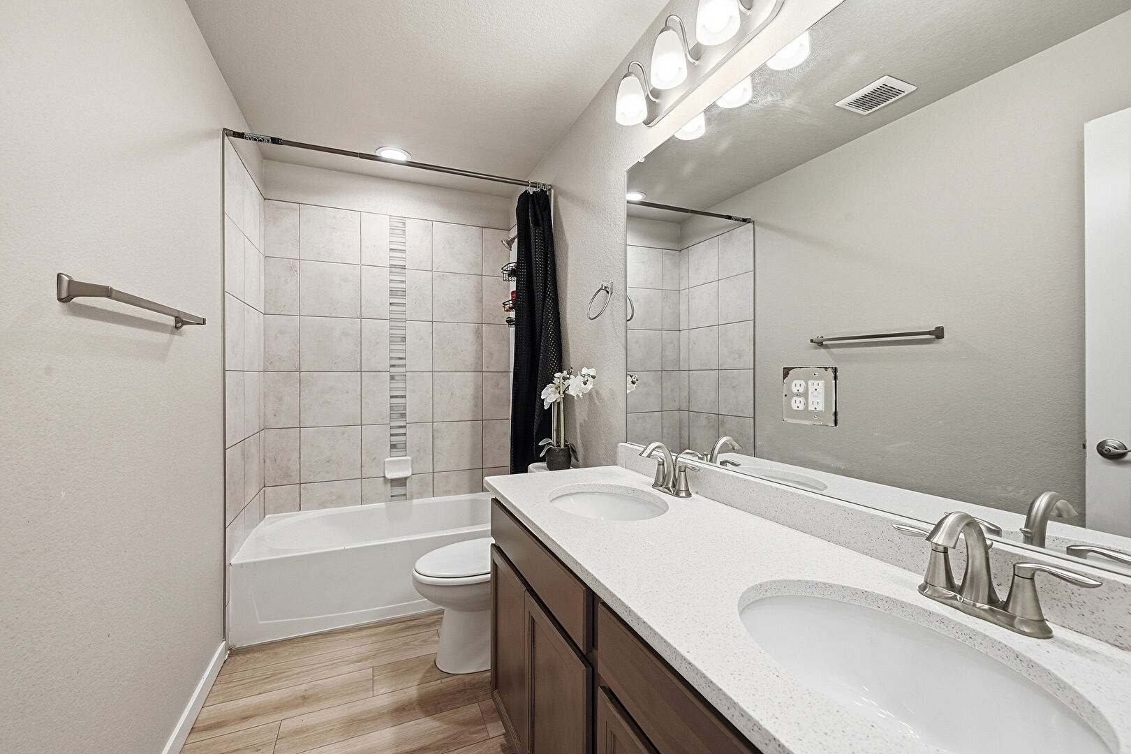 Baseboards Wall, Combined Bath Shower, Double Vanity, Full Bathroom, Half Bathroom, Vent, Wood Finish Floor, Textured Wall