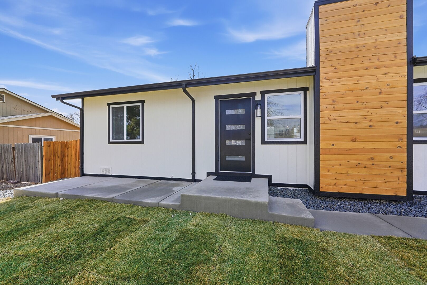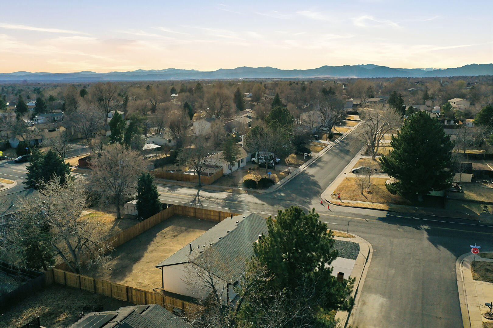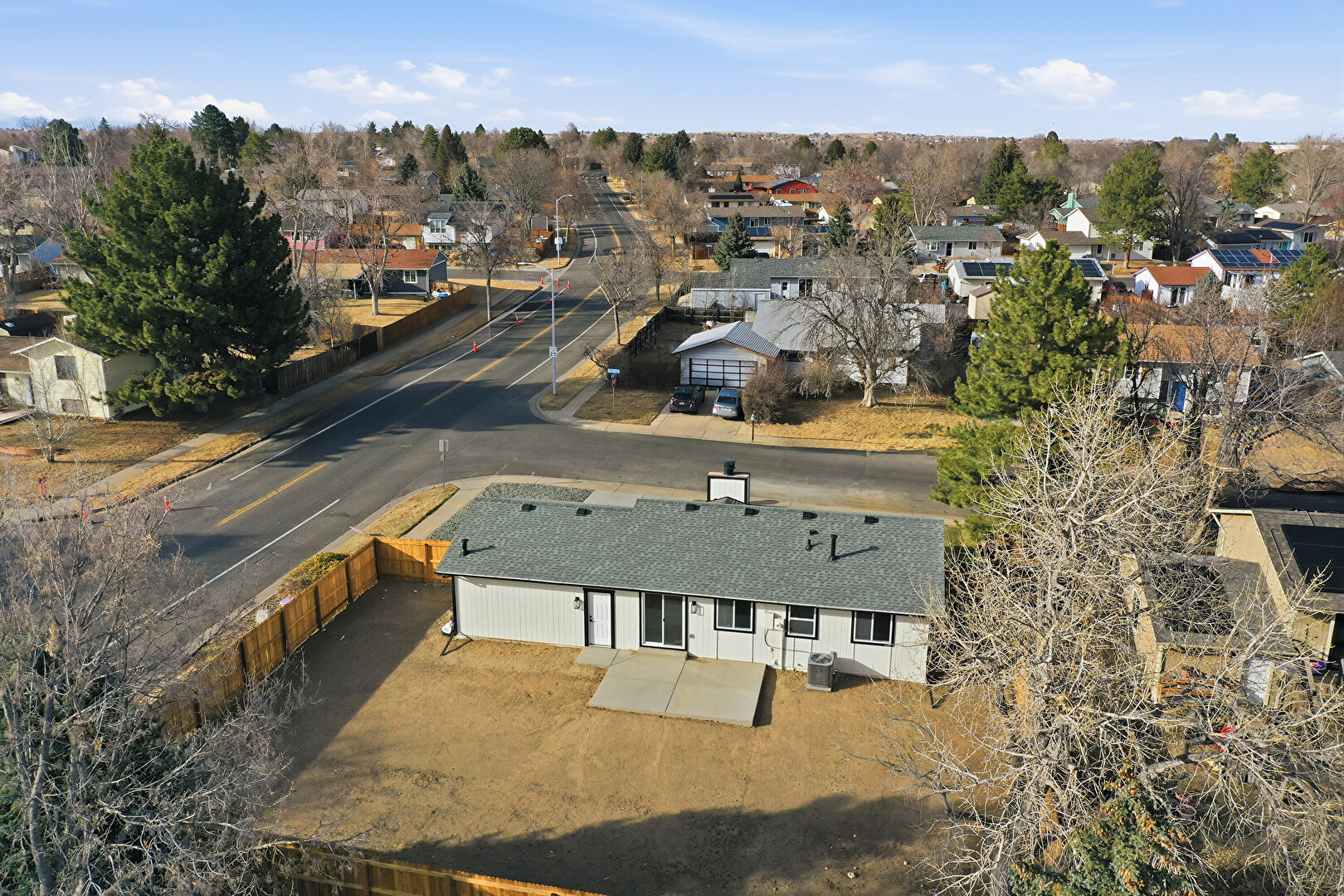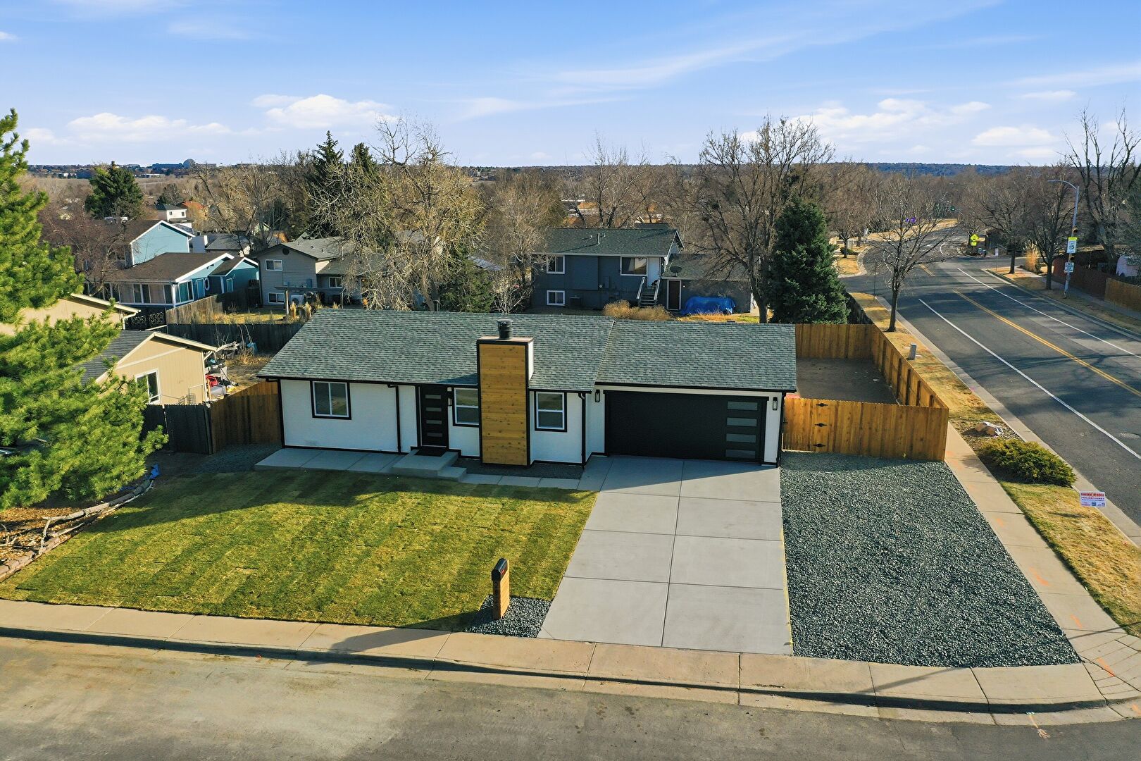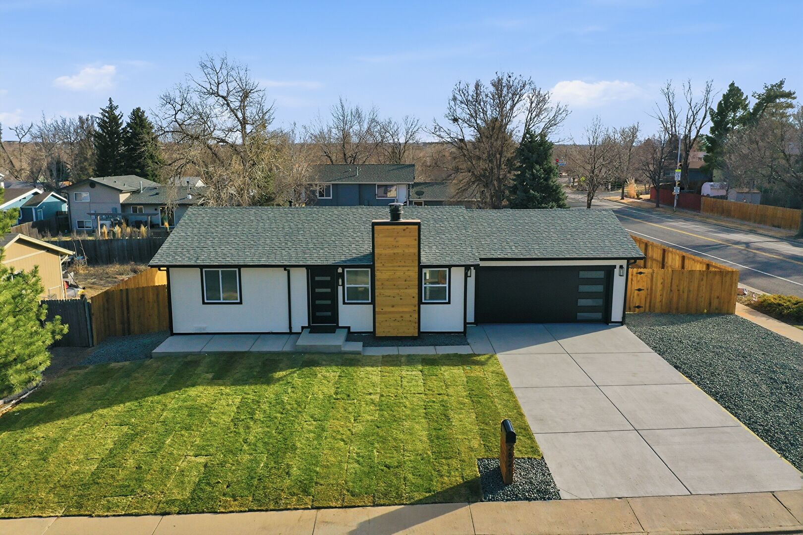 Chimney, Concrete Foundation, Downspout, Driveway, Fence, Gutters, Lawn, Residential View, Shingle Roof, Stoop, Stucco Siding, Vertical Siding, Wood Siding, Downspout, Driveway, Fence, Lawn, Shingle Roof, Stucco Siding