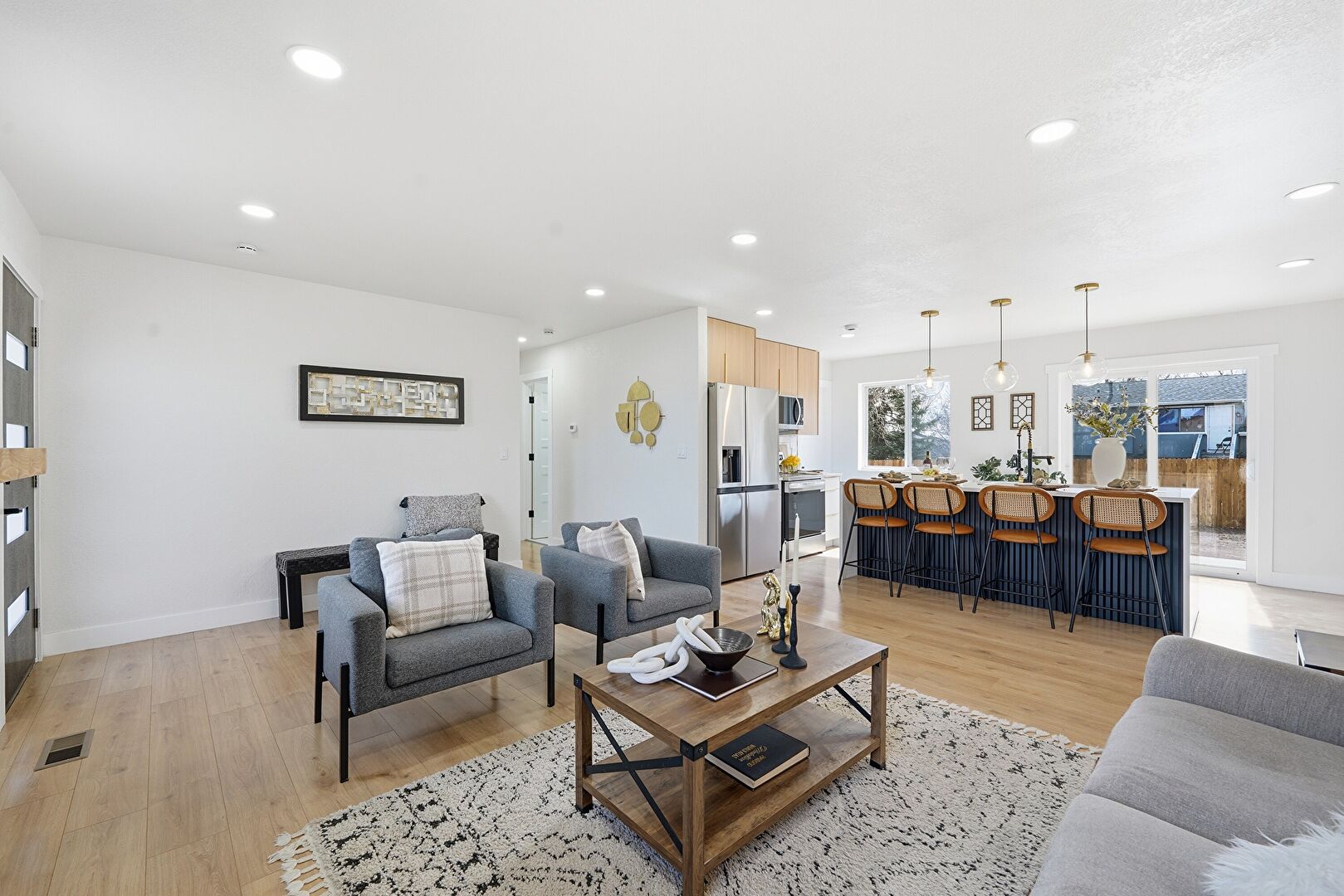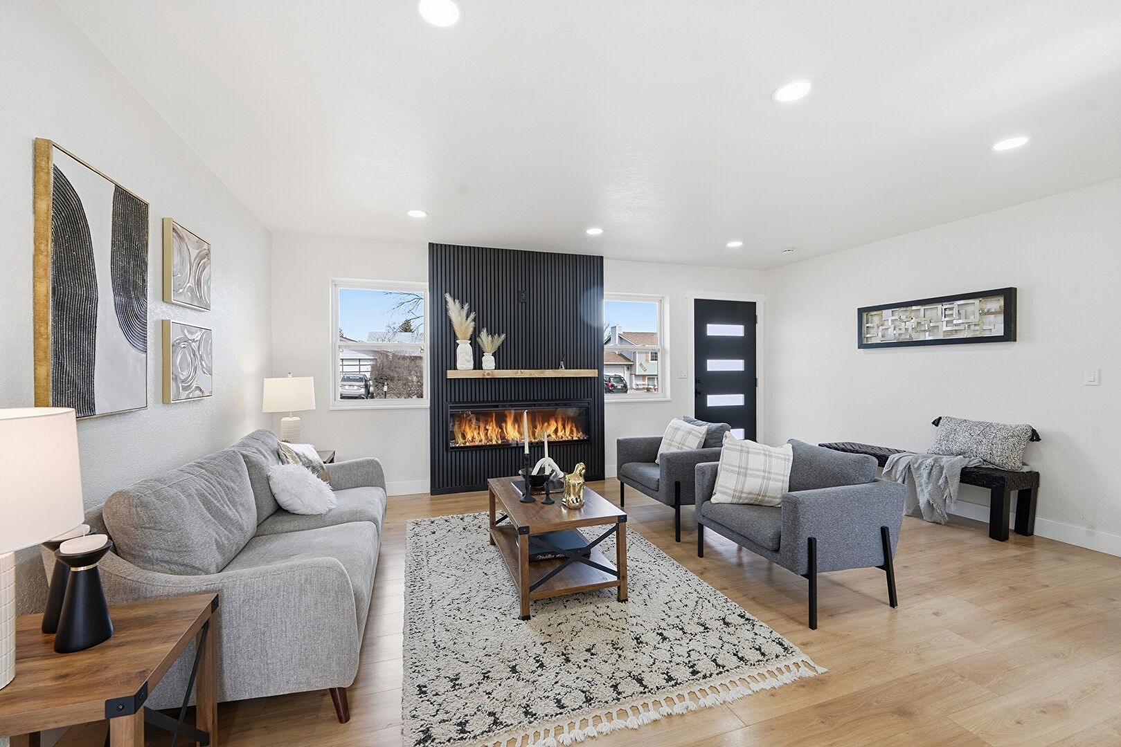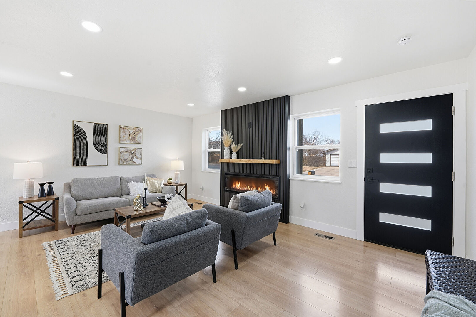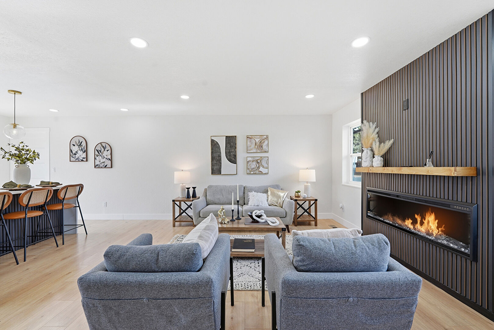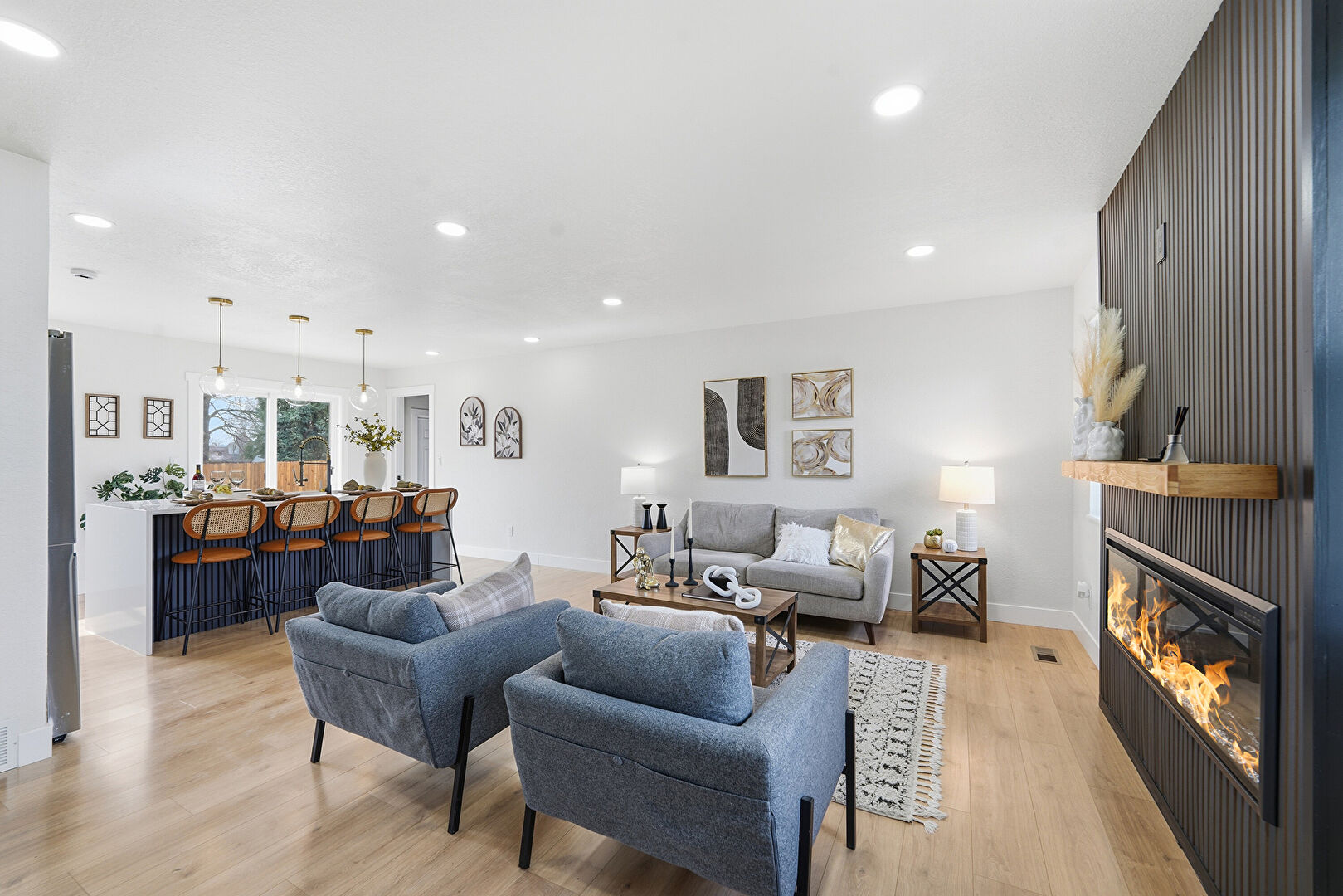 Baseboards Wall, Drywall, Fireplace, Indoor Bar, Natural Light, Recessed Lighting, Vent, Wood Finish Floor, Baseboards Wall, Natural Light, Recessed Lighting, Wood Finish Floor