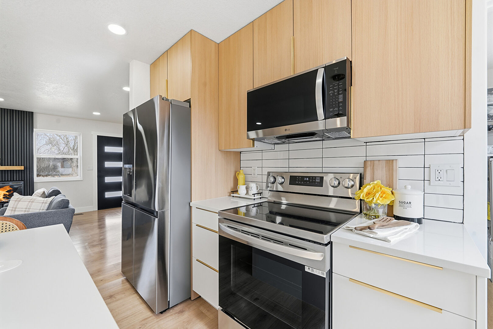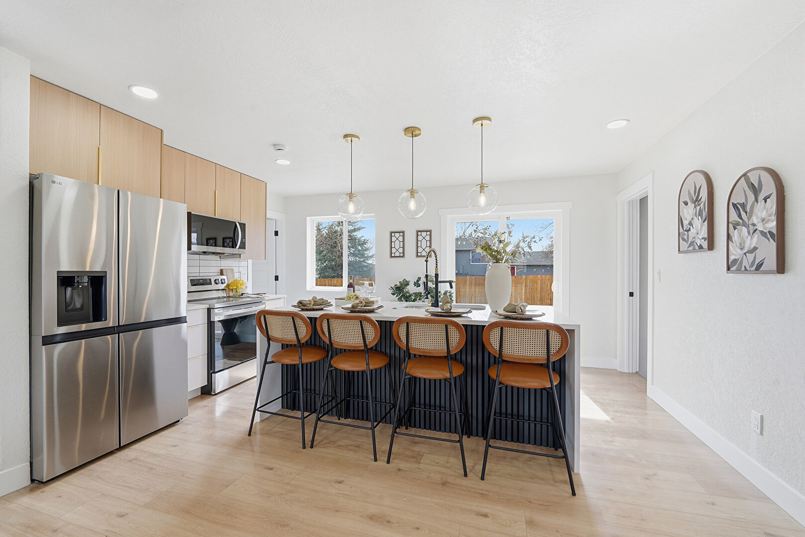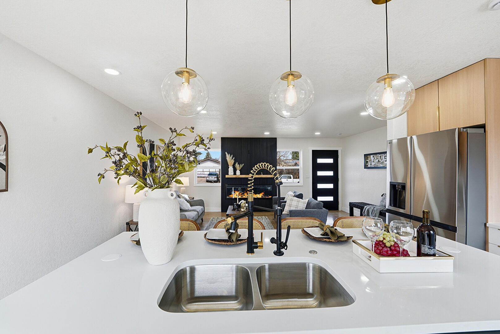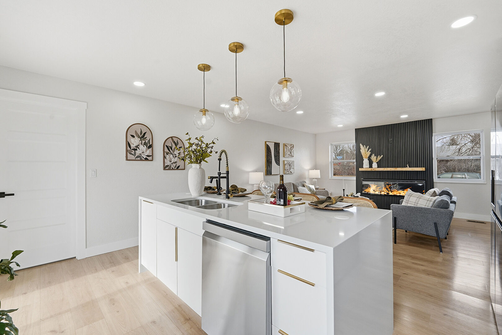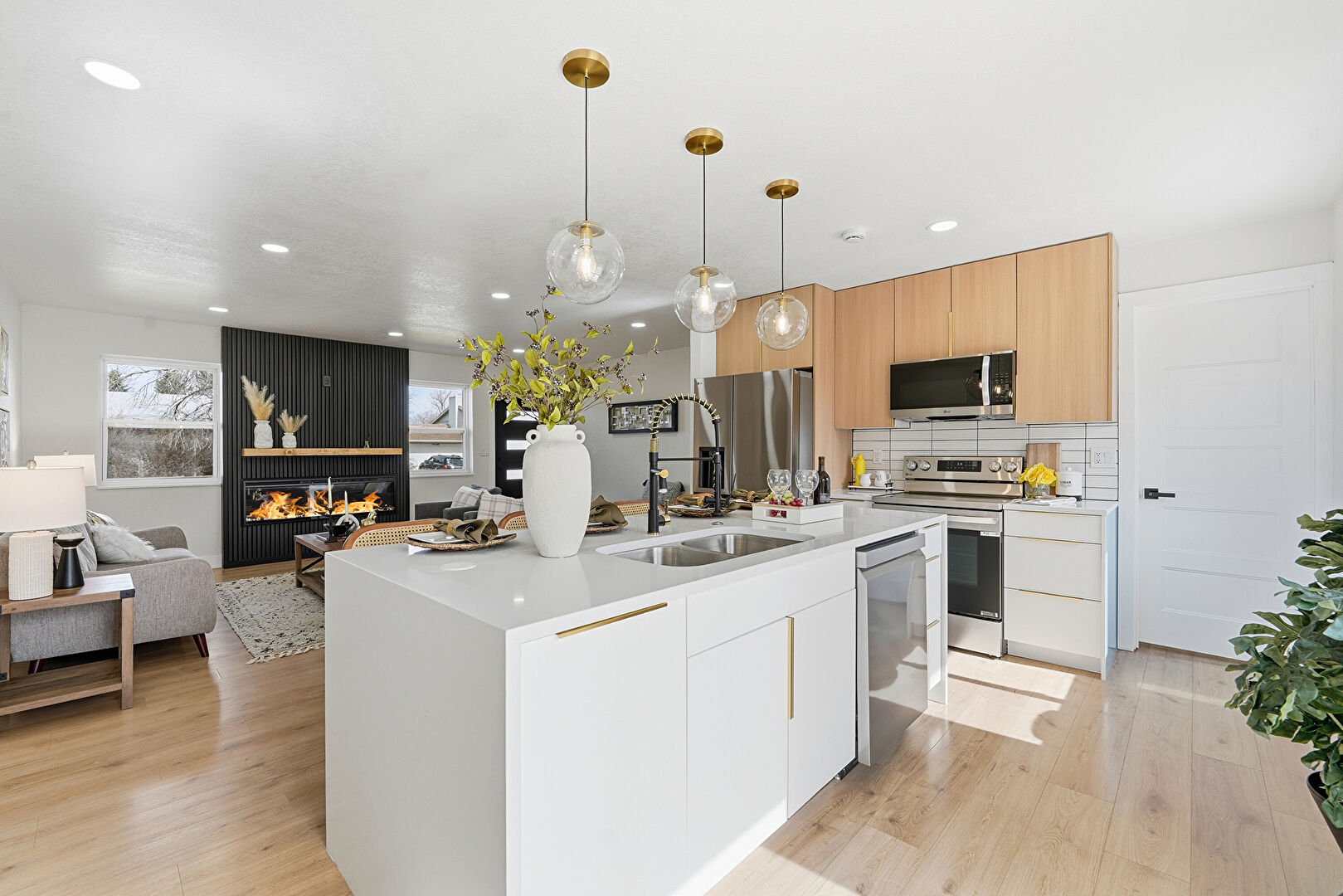 Baseboards Wall, Drywall, Fireplace, Flat Panel Cabinets, Kitchen Bar, Kitchen Island, Natural Light, One Wall Kitchen, Opens To Living Area, Pendant Lighting, Recessed Lighting, Smoke Carbon Monoxide Detector, Stone Countertops, Textured Wall, Wood Finish Floor, Drywall, Fireplace, Flat Panel Cabinets, Natural Light, Opens To Living Area, Pendant Lighting, Stone Countertops