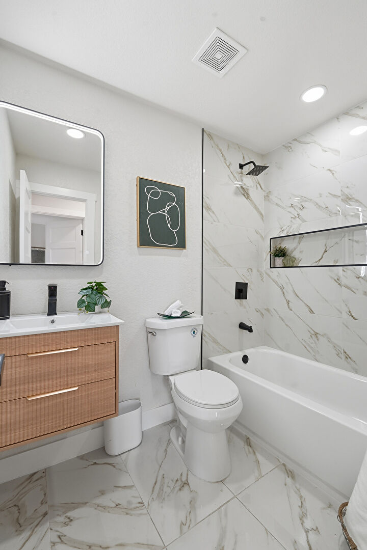 Baseboards Wall, Combined Bath Shower, Drywall, Marble Finish Floor, Recessed Lighting, Vanity, Vent, Full Bathroom
