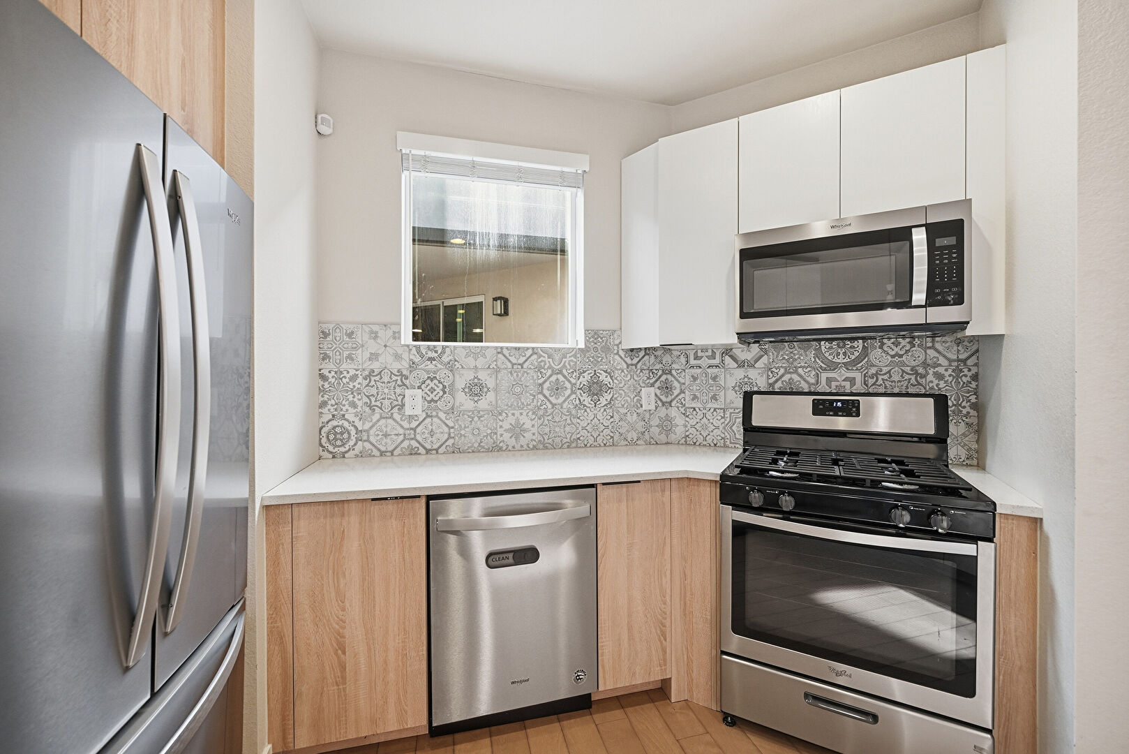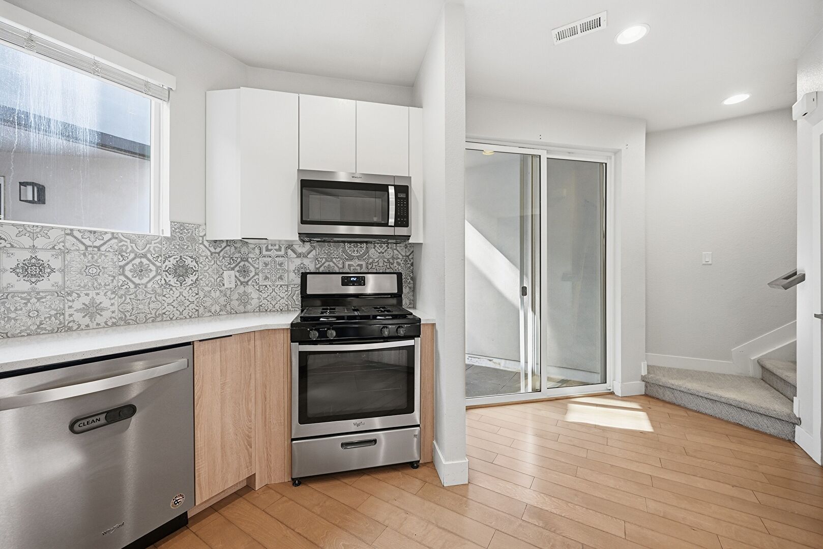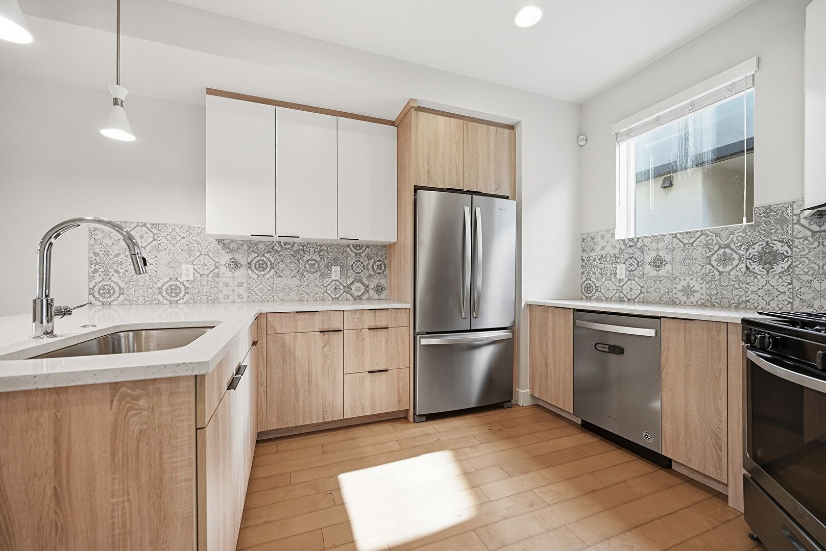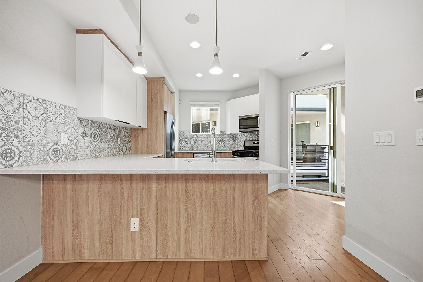 Baseboards Wall, Drywall, Flat Panel Cabinets, G Shaped Kitchen, Kitchen Bar, Kitchen Peninsula, Natural Light, Pendant Lighting, Recessed Lighting, Stone Countertops, Vent, Wood Finish Floor, Flat Panel Cabinets, Recessed Lighting, Stone Countertops, Vent